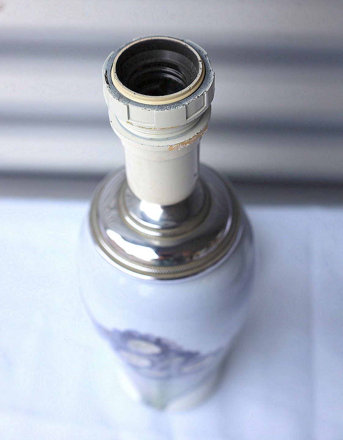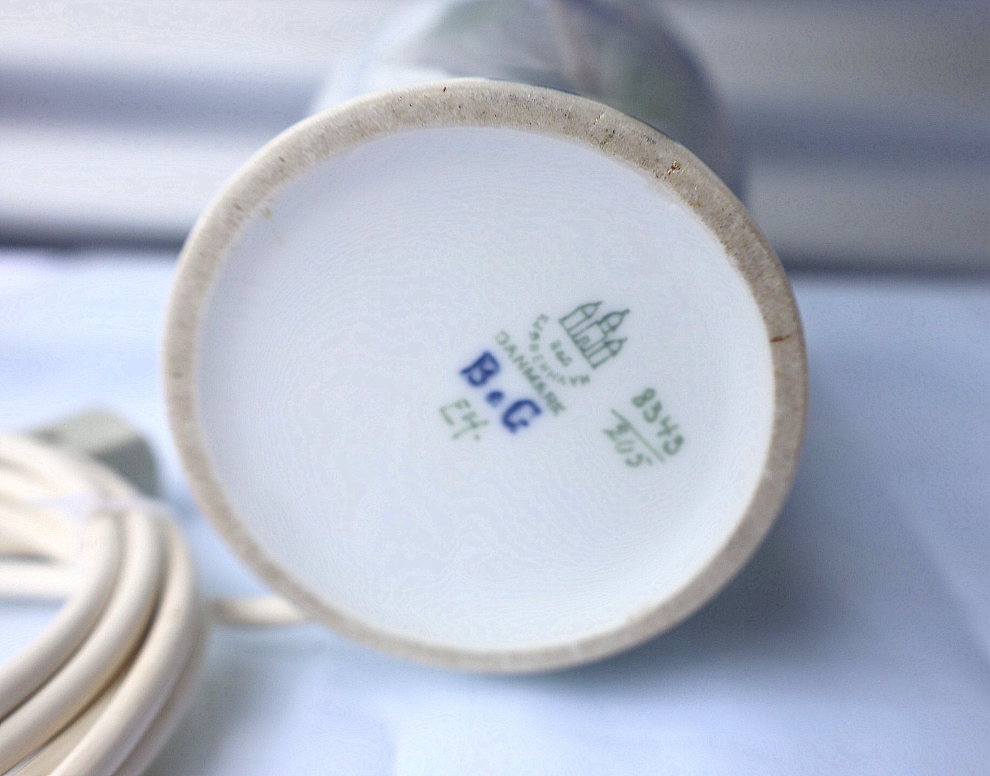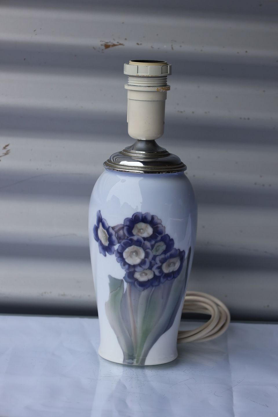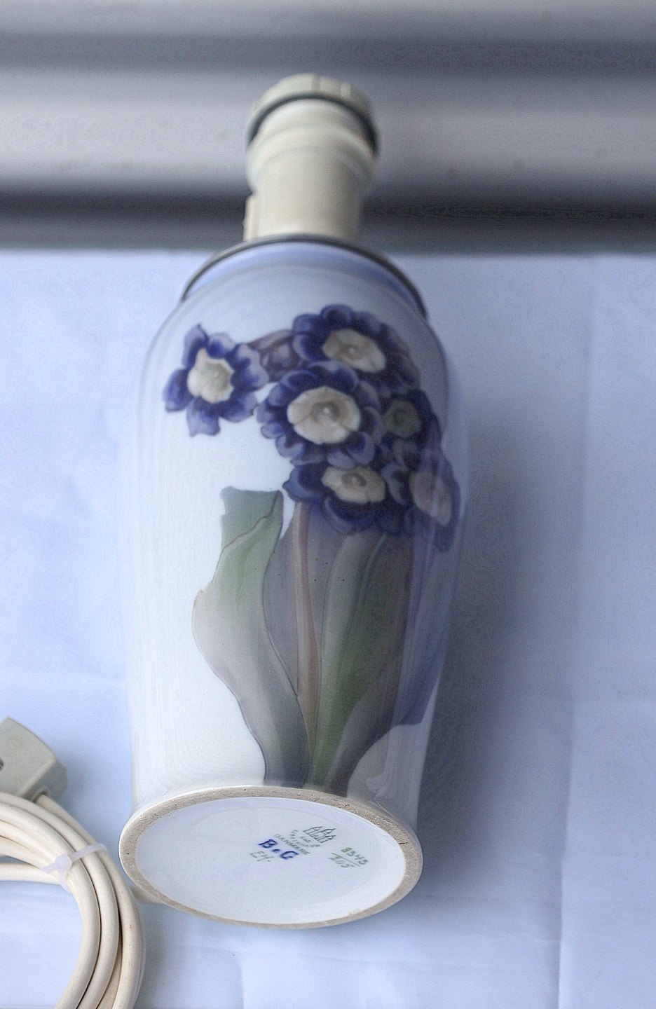 Bing & Grøndahl. Bordlampe nr. 8343/265.Dekoration på lampen er blå blomster med grønne blade. Fatningen er sat på med sølvlignende metal.