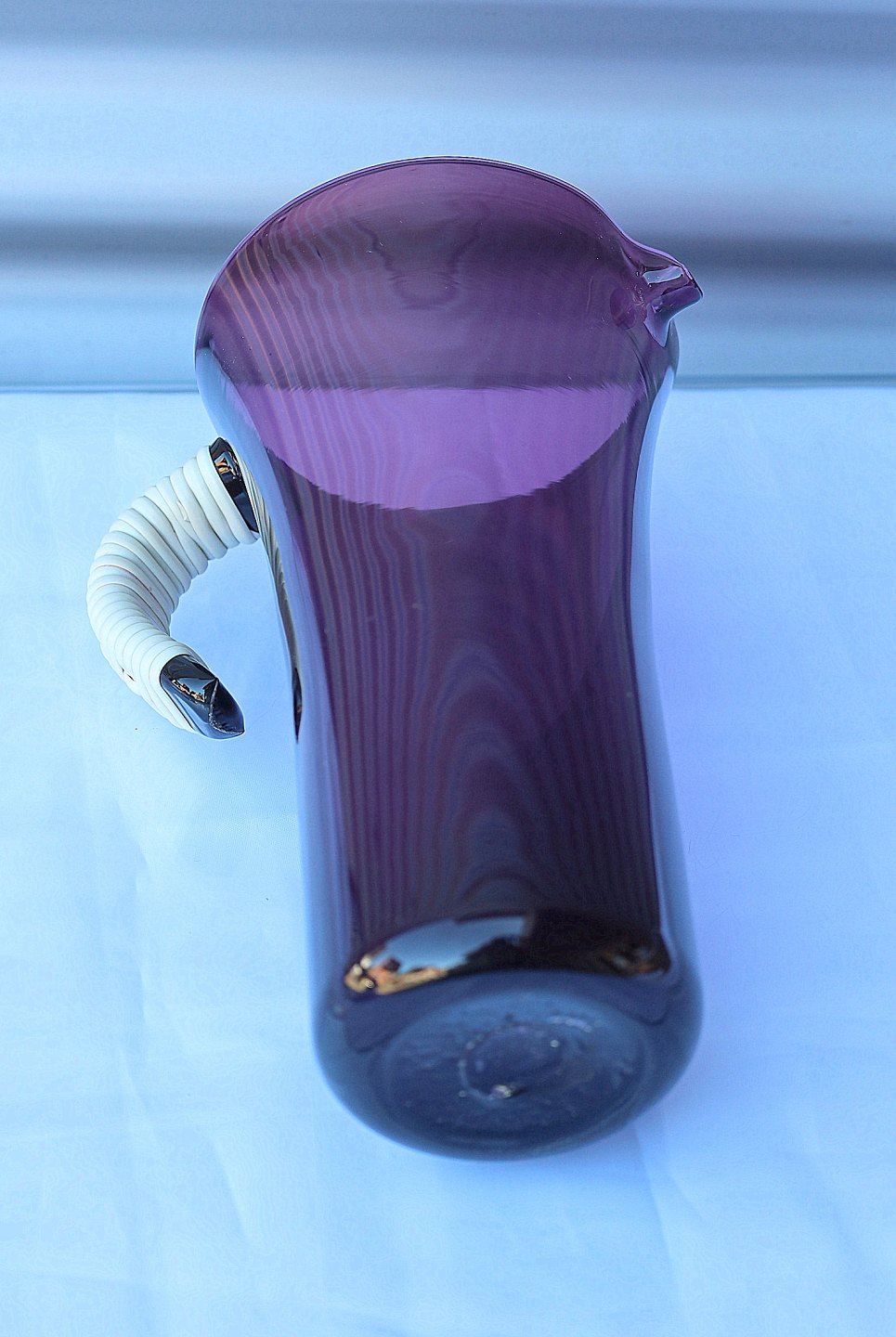 Holmegaard Glasværk. Lilla glaskande med påsat hank. Hanken er beviklet med plast.