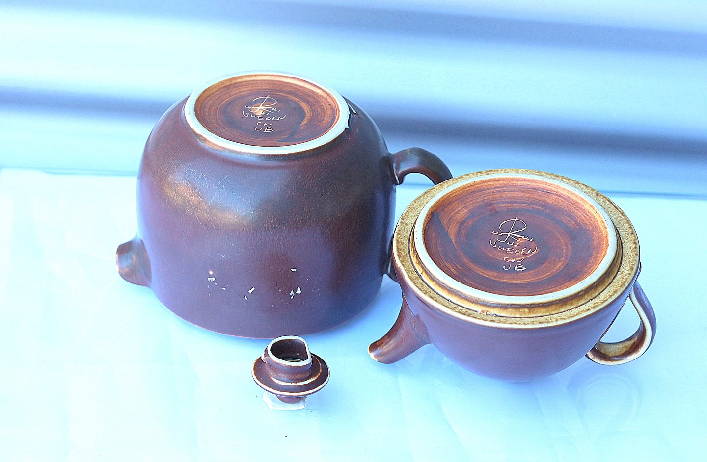 Rørstrand, Sweden. Gunnar Nylund, tekande/dobbeltkande. Sættet er af keramik oge i brune farver og består af en vandkande, nederst, og en tekande, øverst, tekanden har låg.