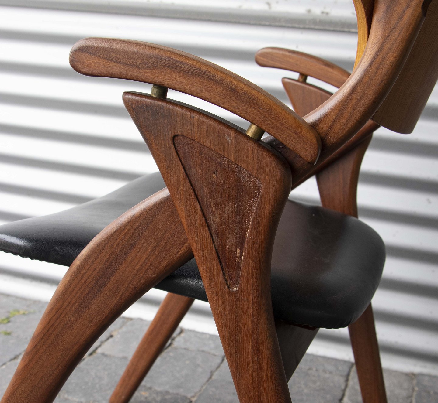 Et sæt med fire stole i teaktræ med armlæn og sorte læder sæder.