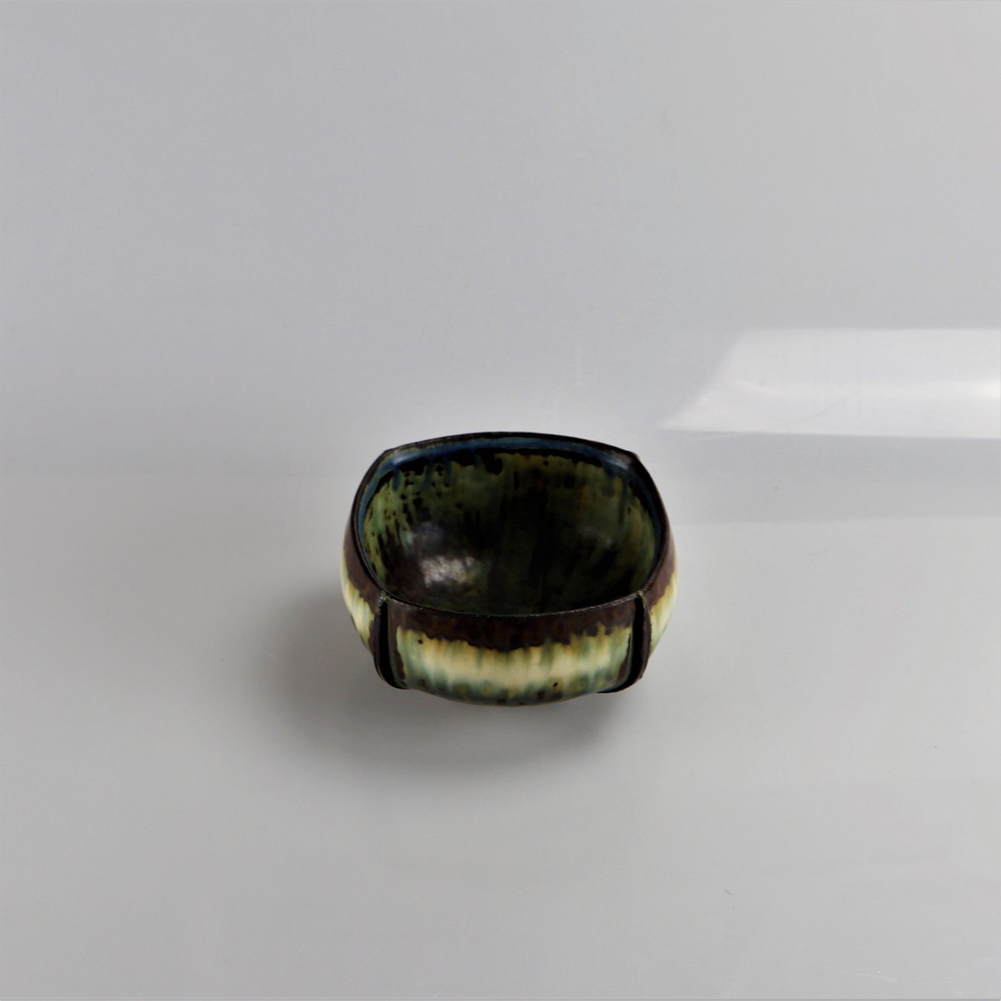 skål i stentøj med løbeglasur i gule, hvide og brune farver