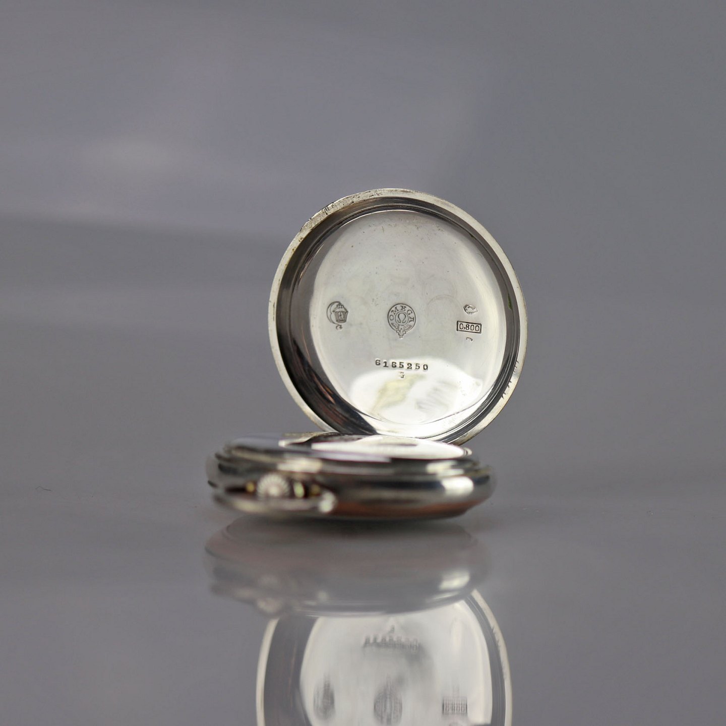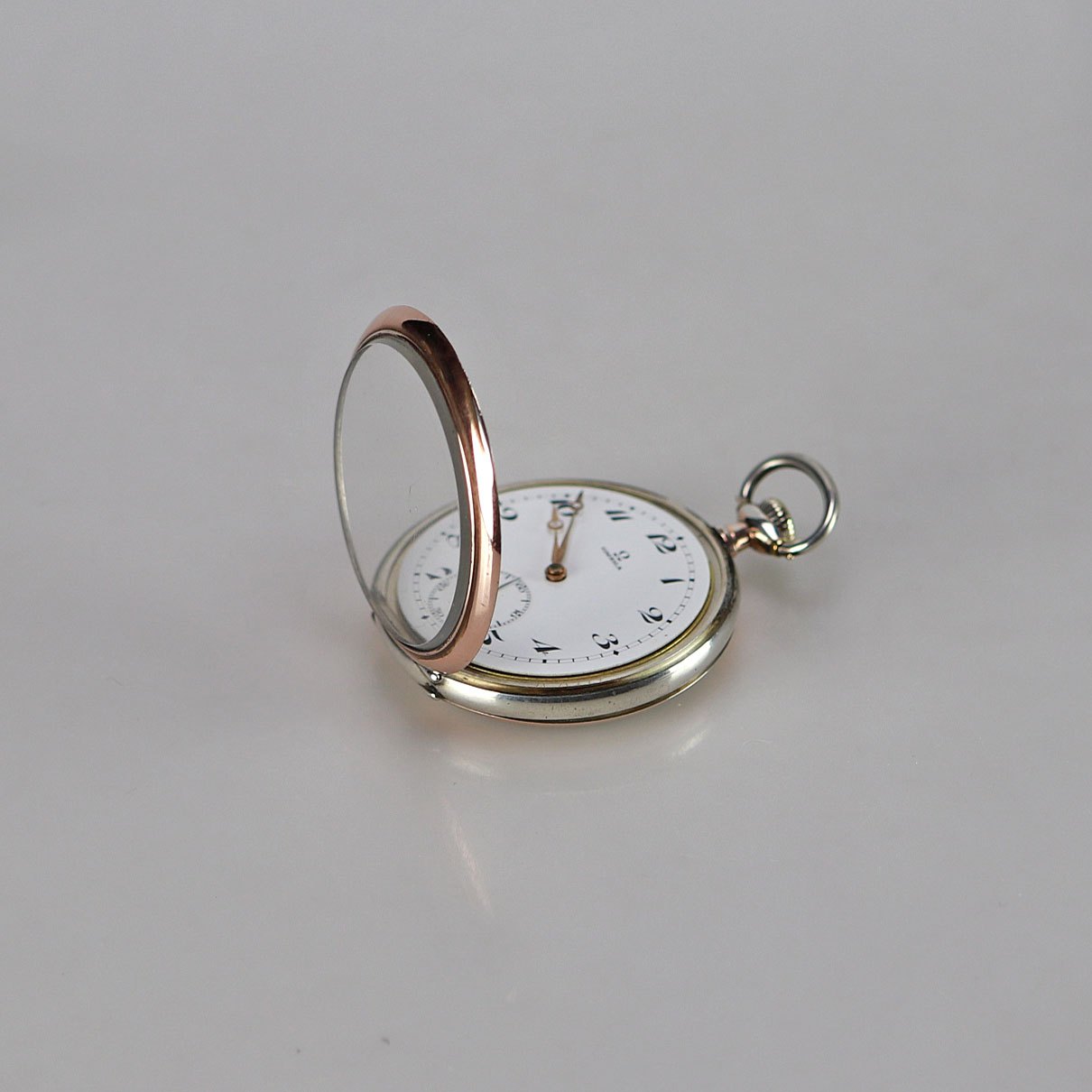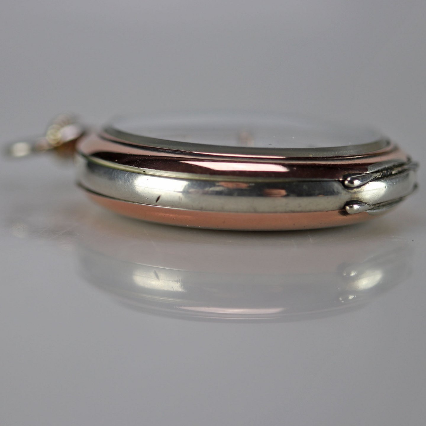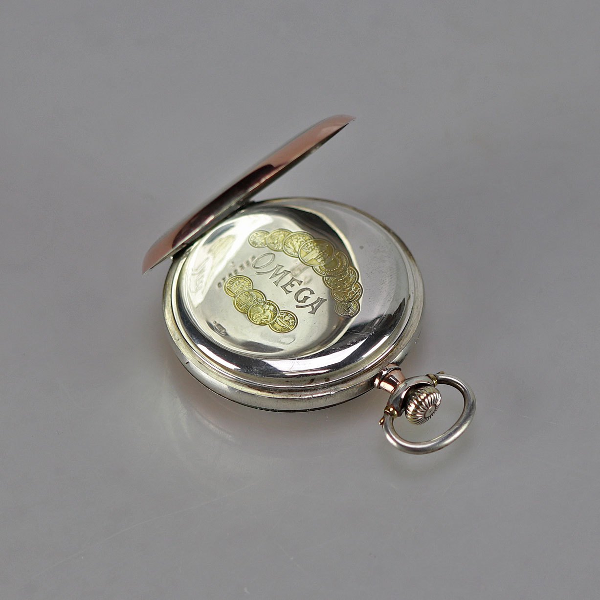 Ur i sølv med guldbelagt kant. Kan åbnes både foran og bagpå.