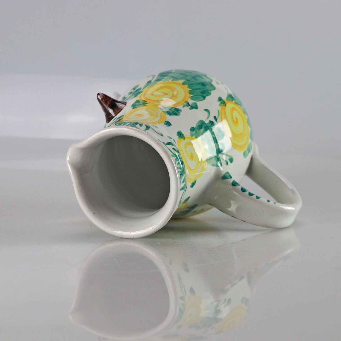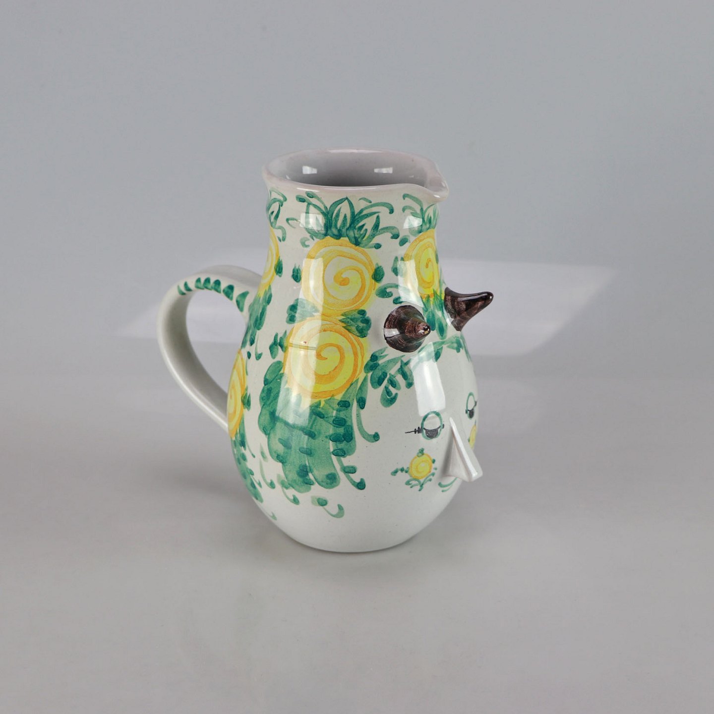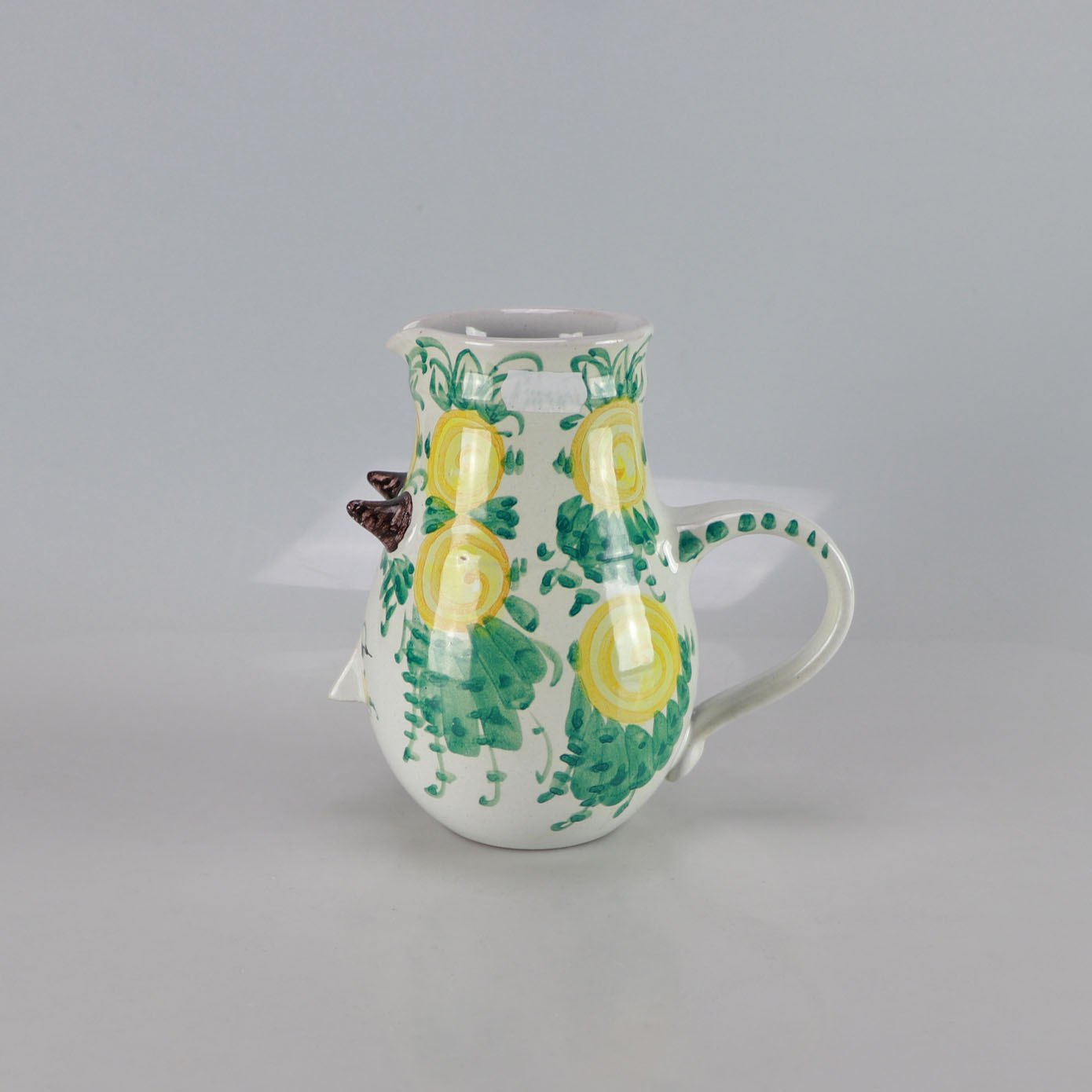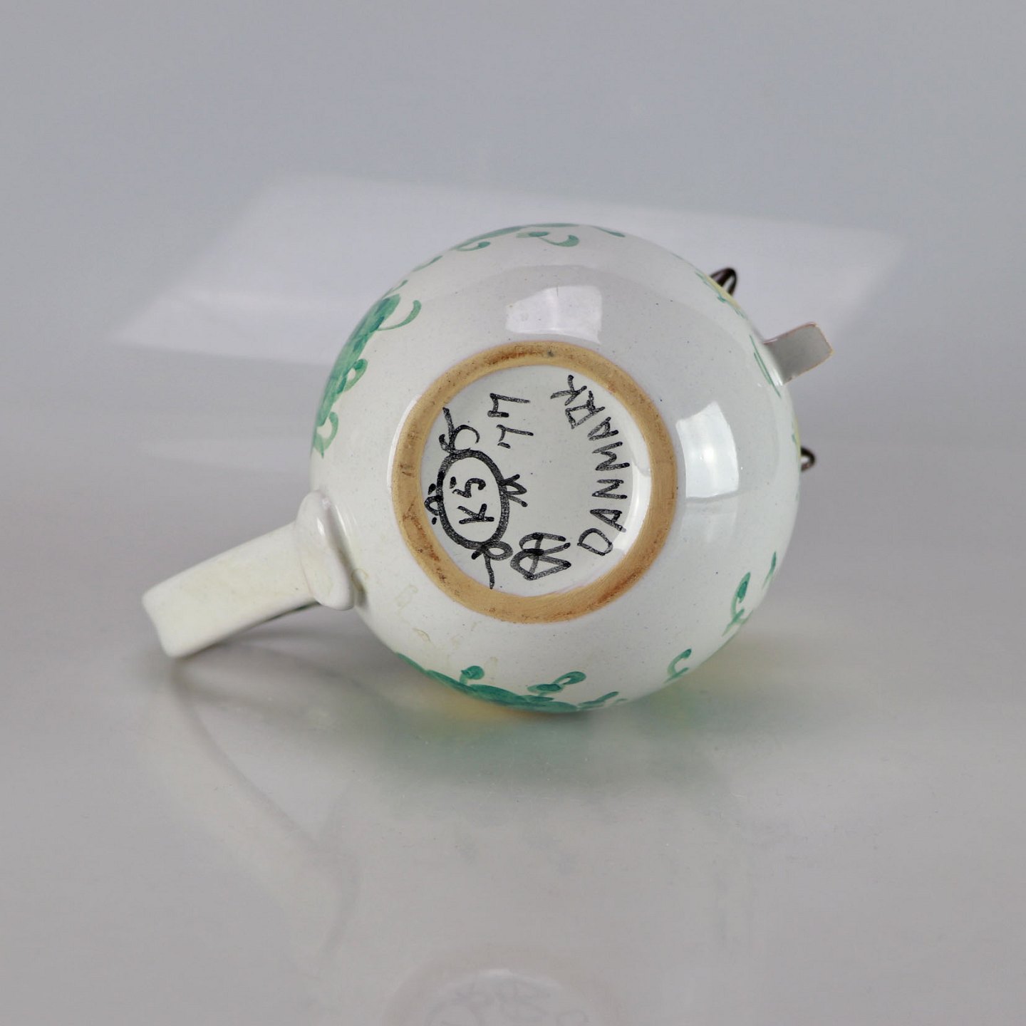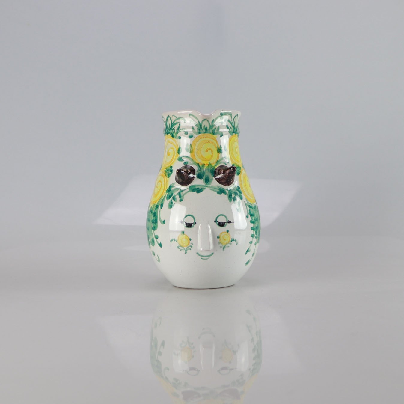 Kande fra Bjørn Wiinblad med kvindeansigt og blomster som hår i grønne og gule farver.