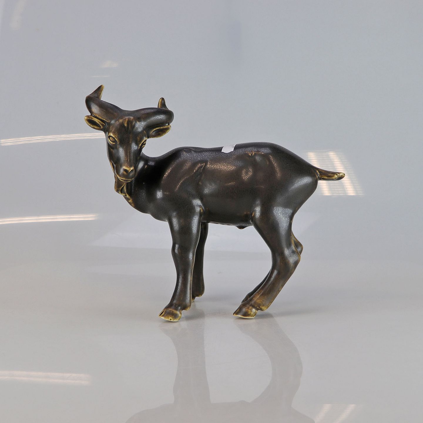 Figur af stående stenbuk udført i brunglaseret keramik