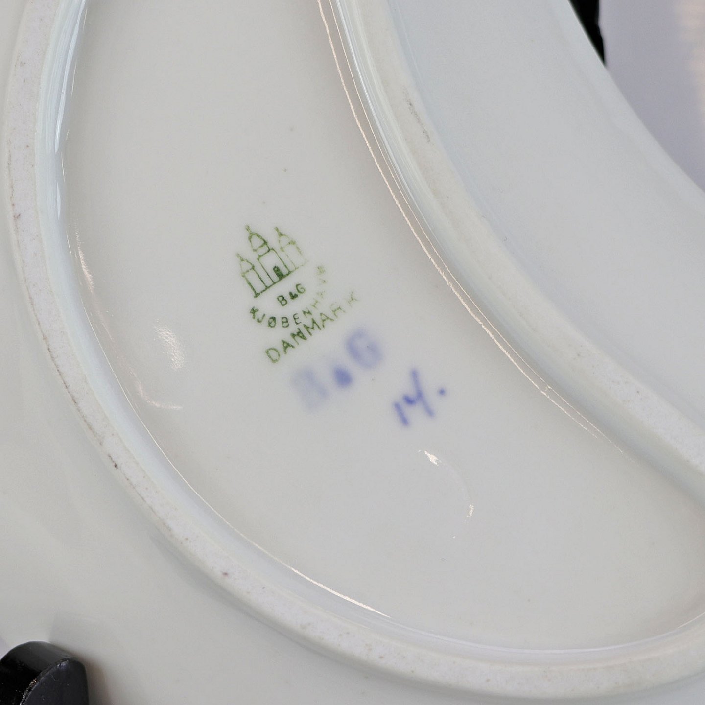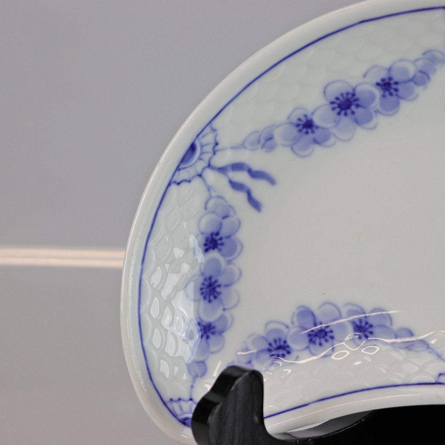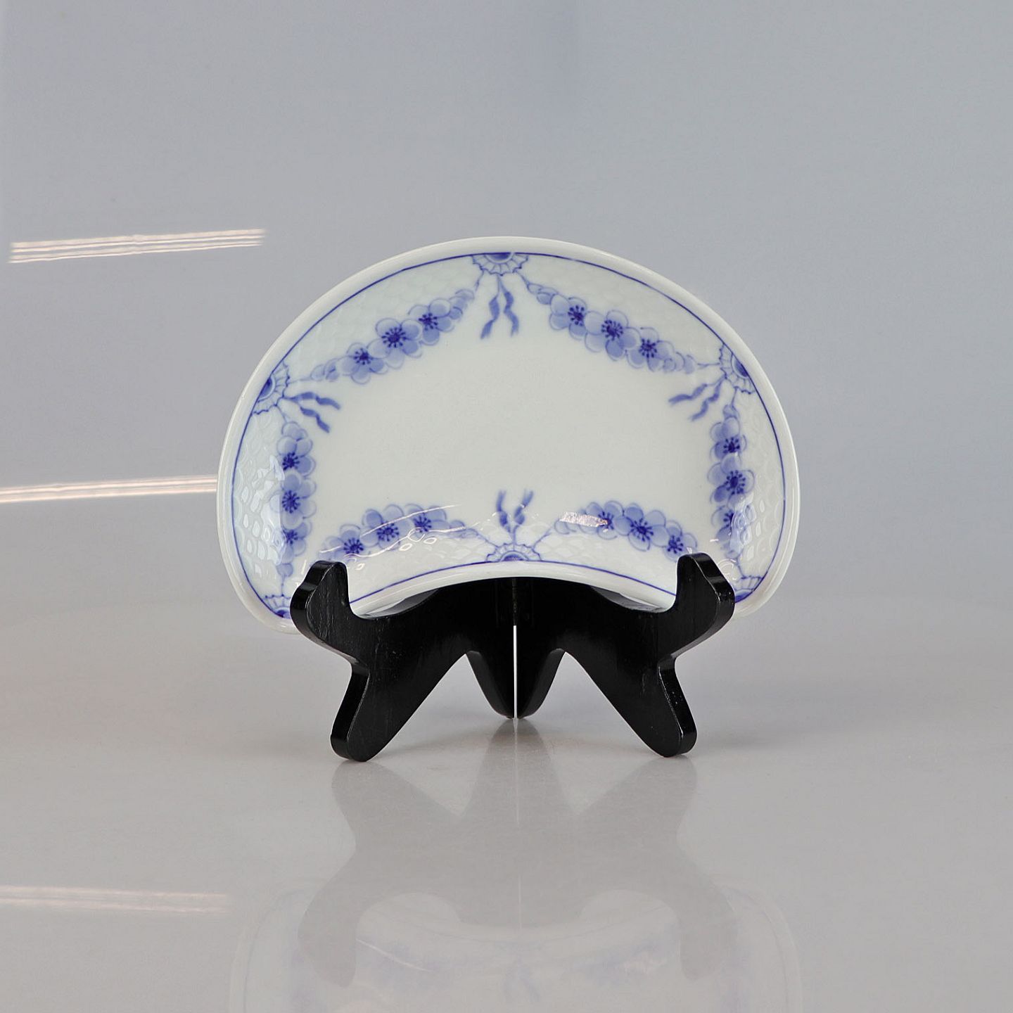 Asiet i hvidt porcelæn med skelform og motiv af guirlander med blå blomster