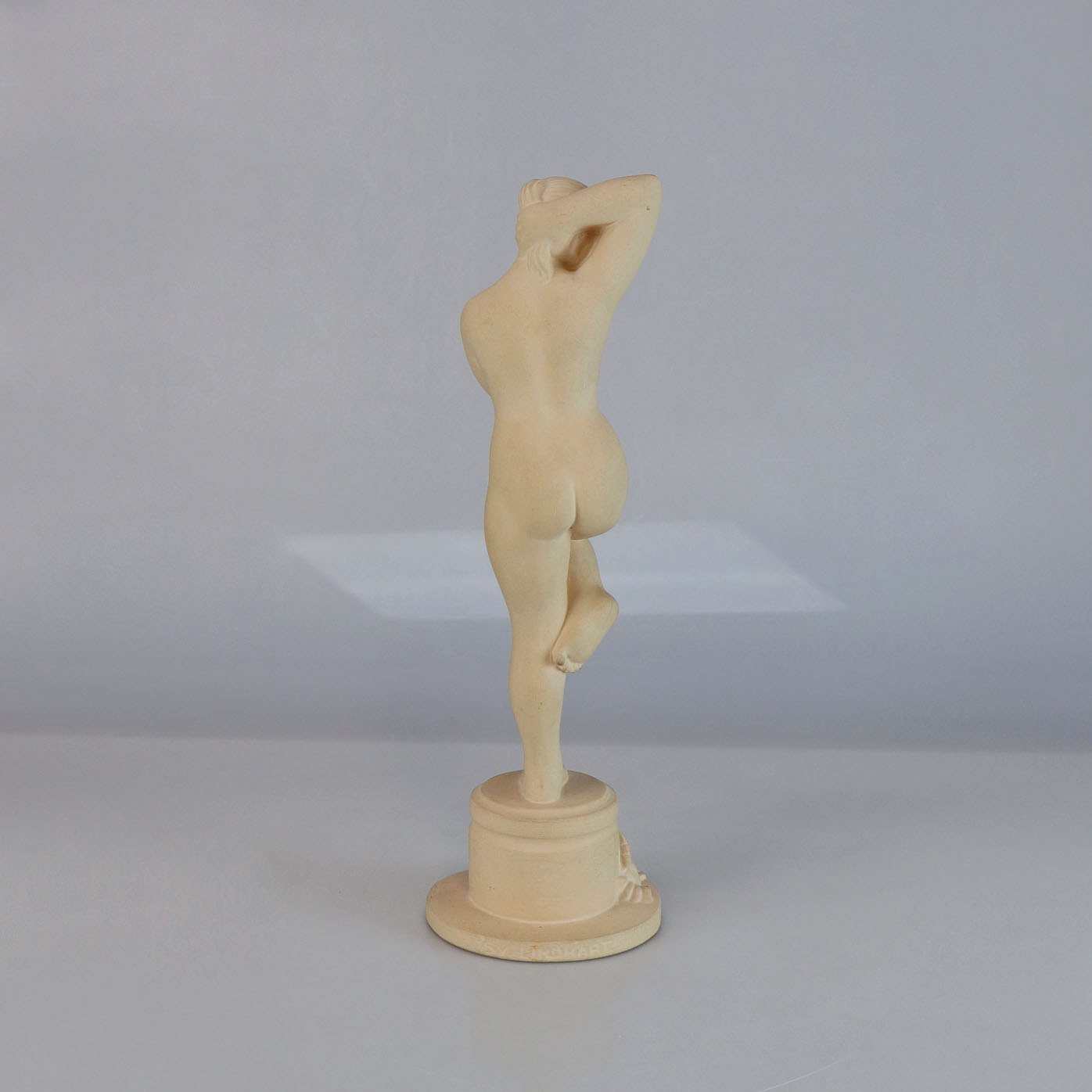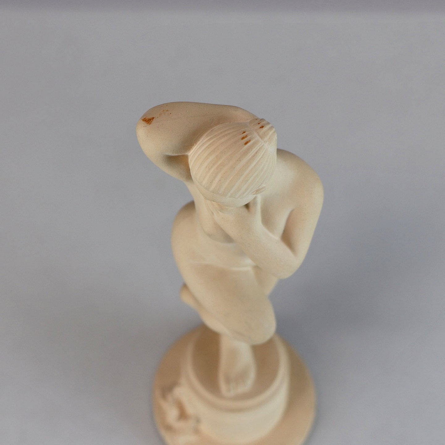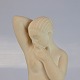 Uglaseret keramikfigur af nøgen kvinde og krabbe