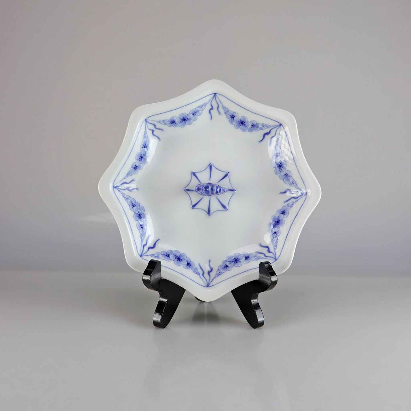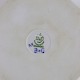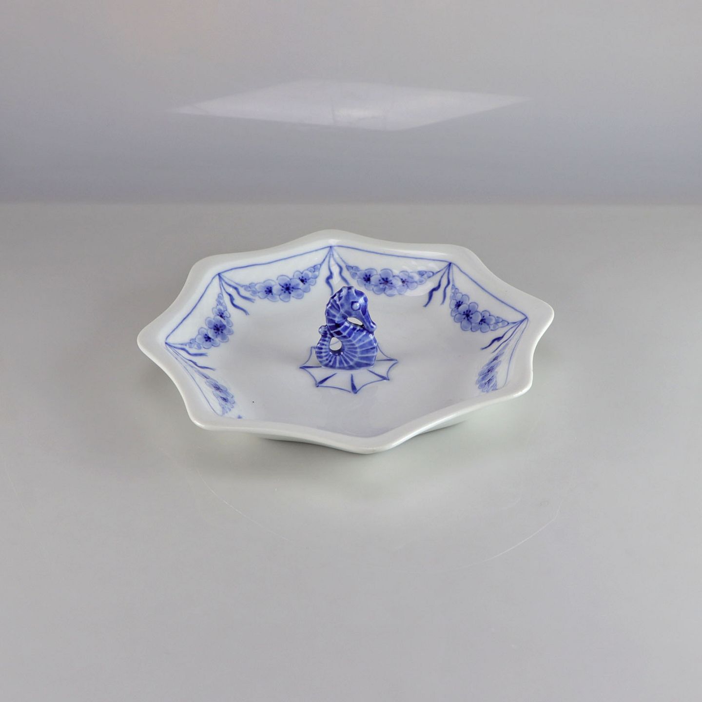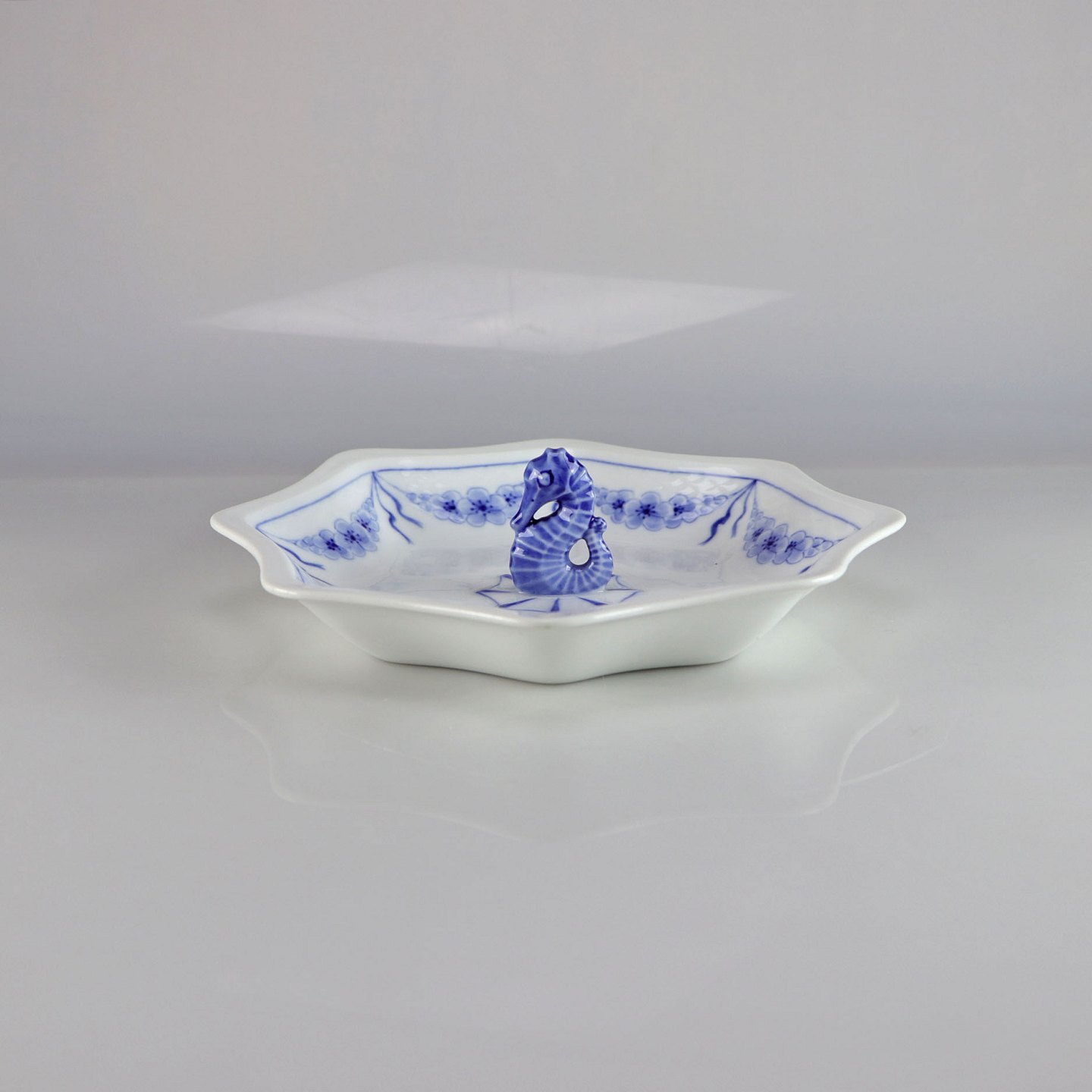 Kantet fad med hank i hvidt porcelæn med skelform og motiv af guirlander med blå blomster samt blå søhest