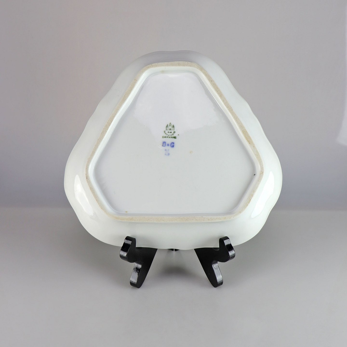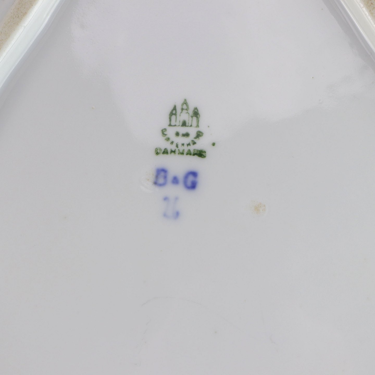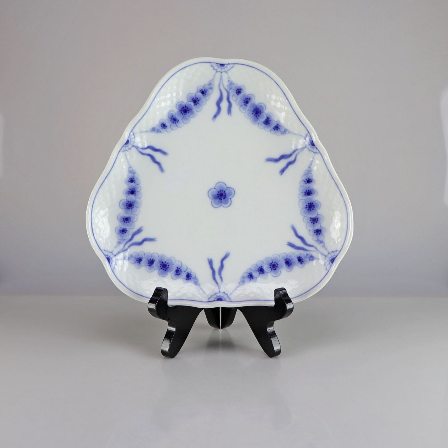 Kagefad i hvidt porcelæn med skelform og motiv af guirlander med blå blomster