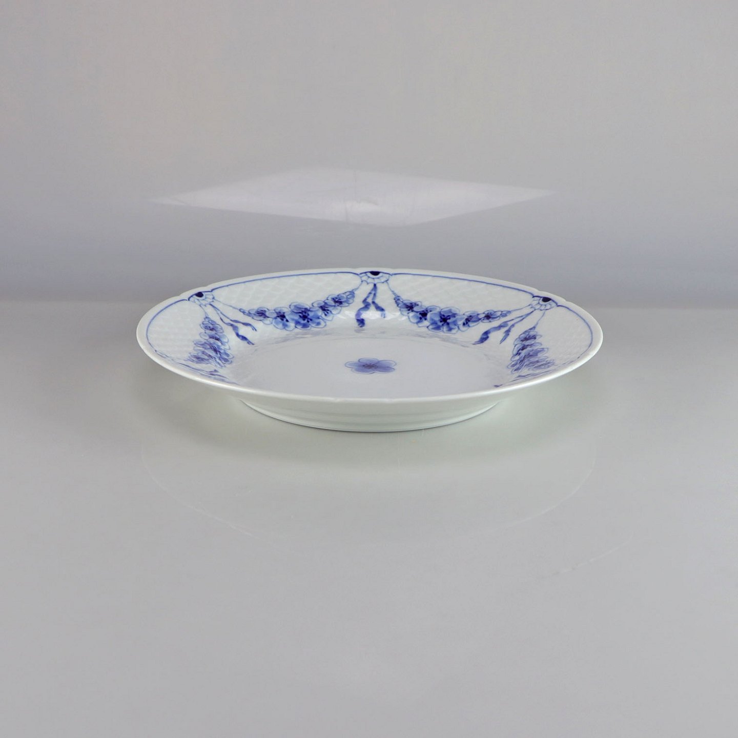 Spisetallerken i hvidt porcelæn med skelform og motiv af guirlander med blå blomster