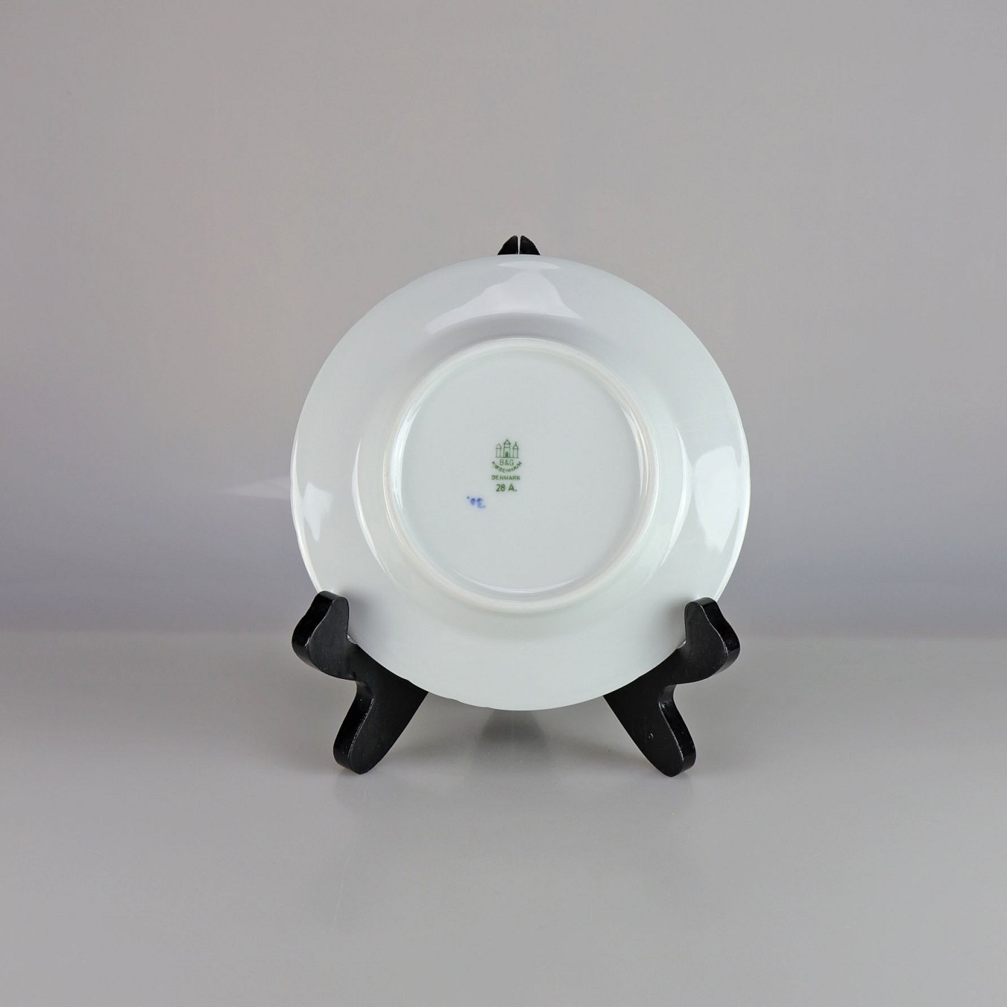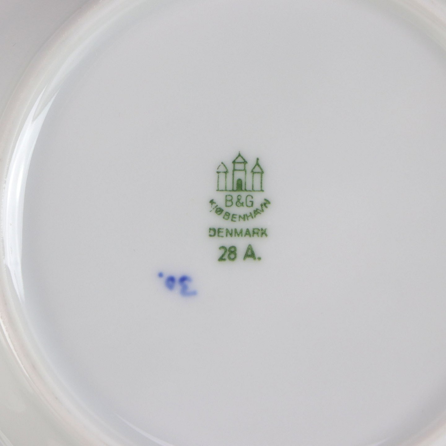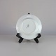 Tallerken i hvidt porcelæn med skelform og motiv af guirlander med blå blomster
