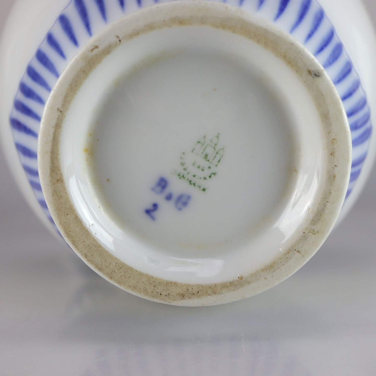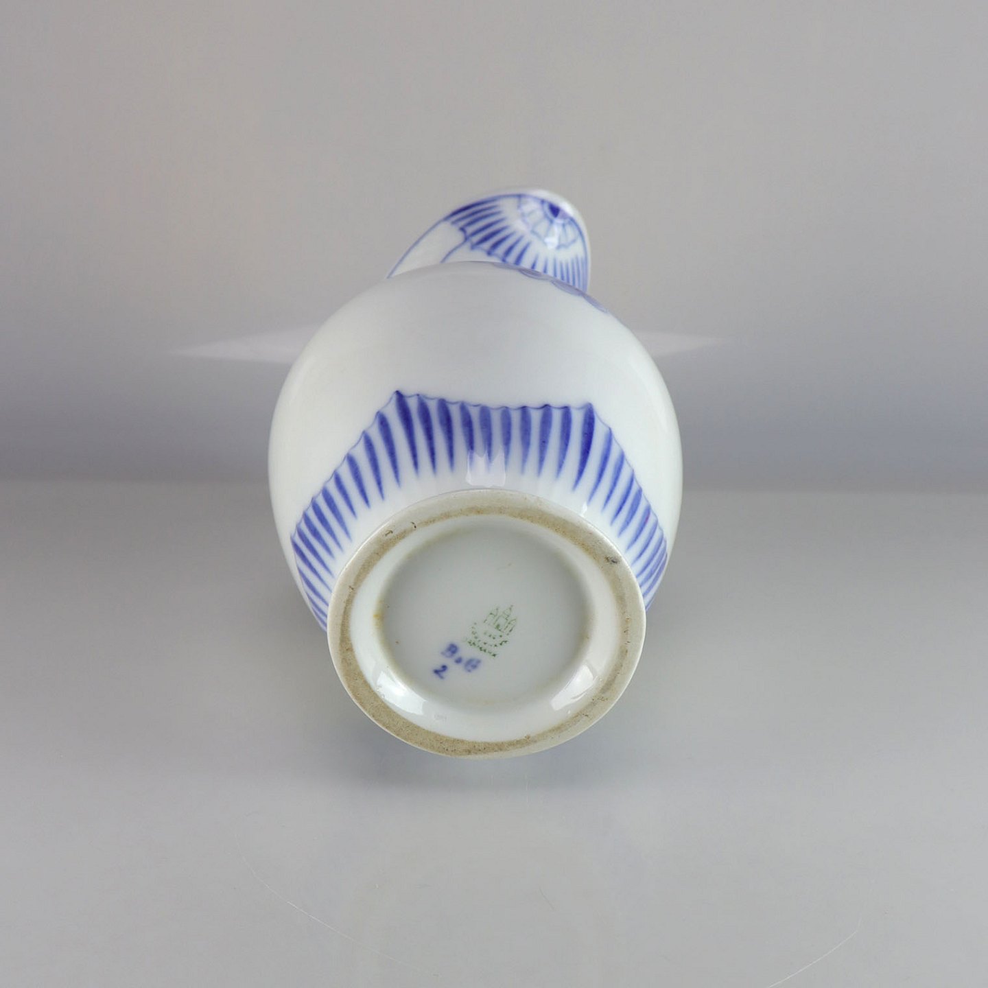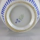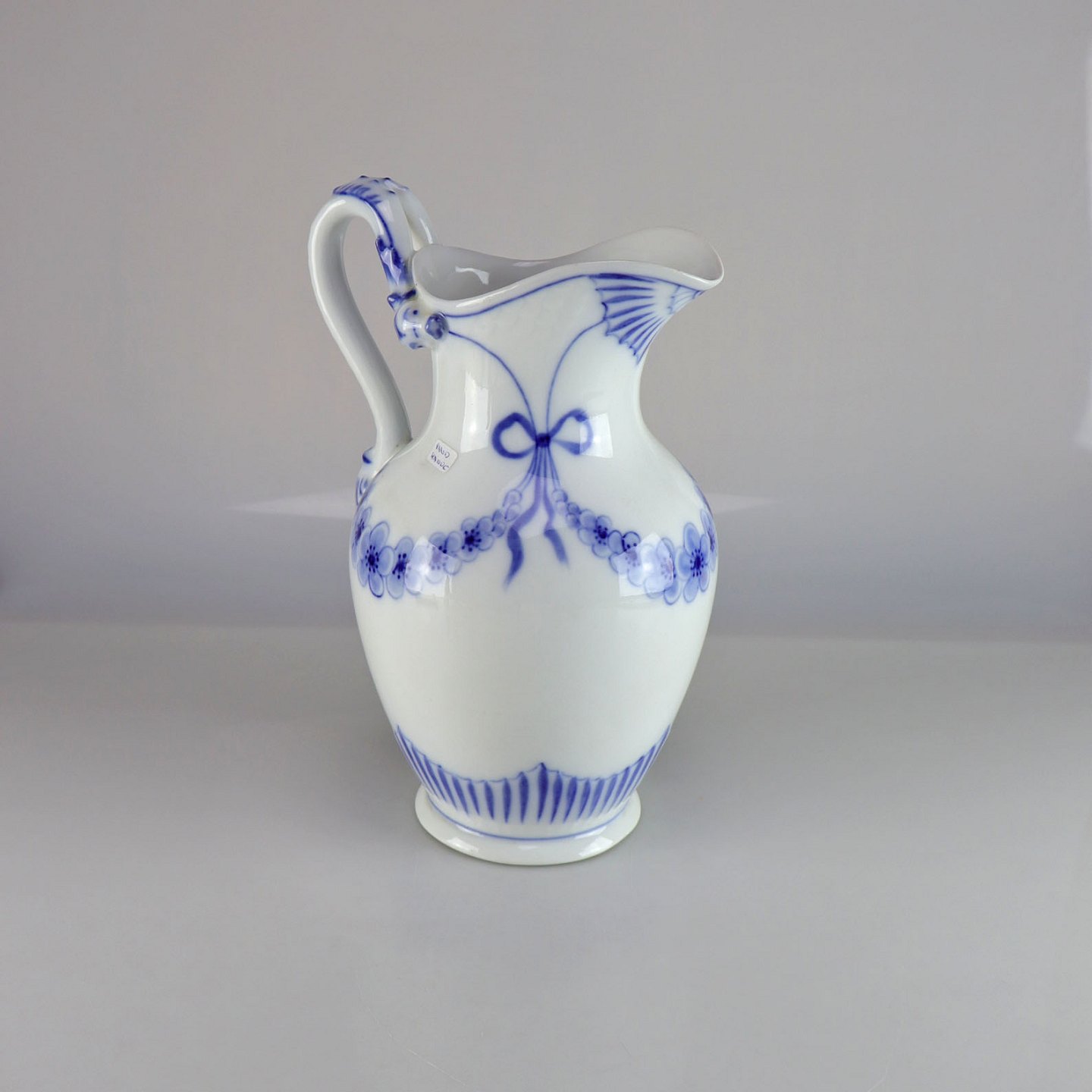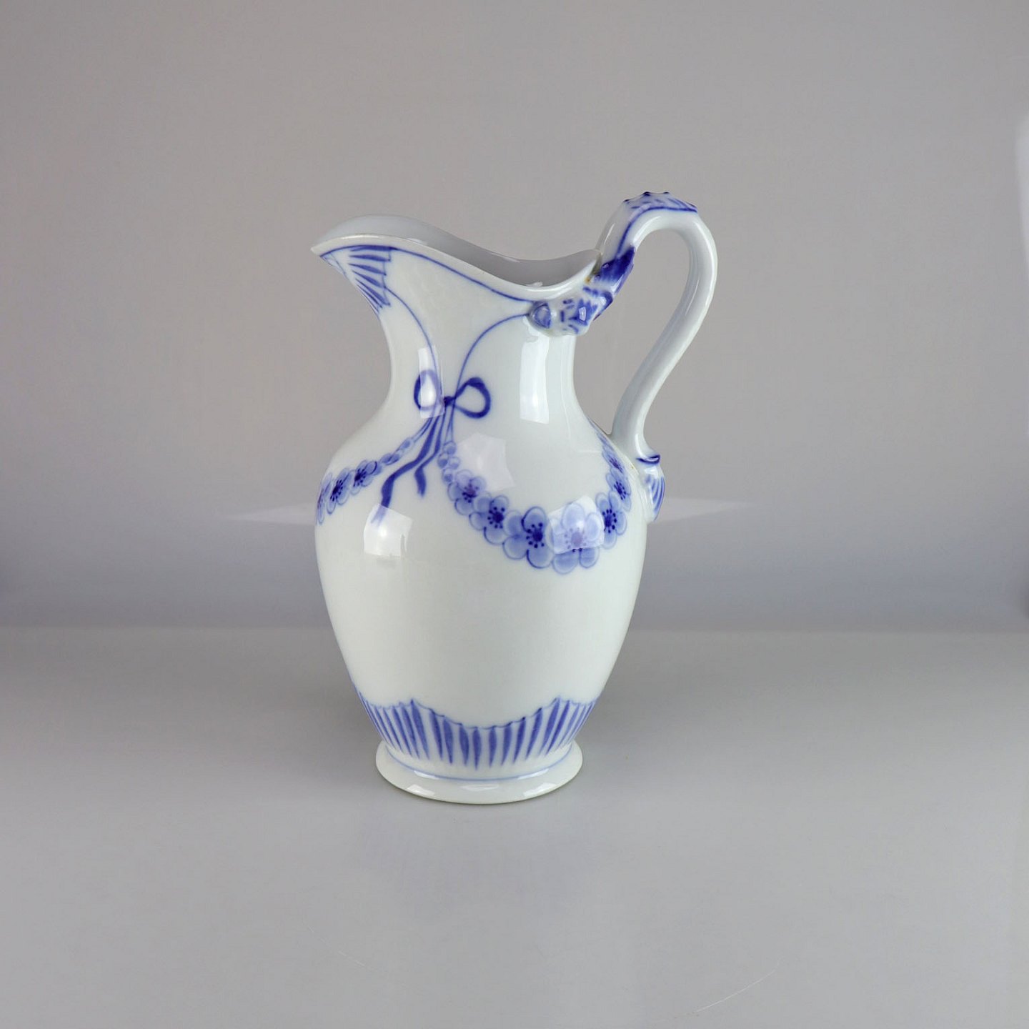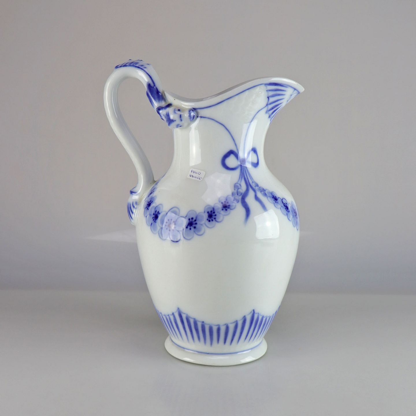 Kande i hvidt porcelæn med skelform og motiv af guirlander med blå blomster
