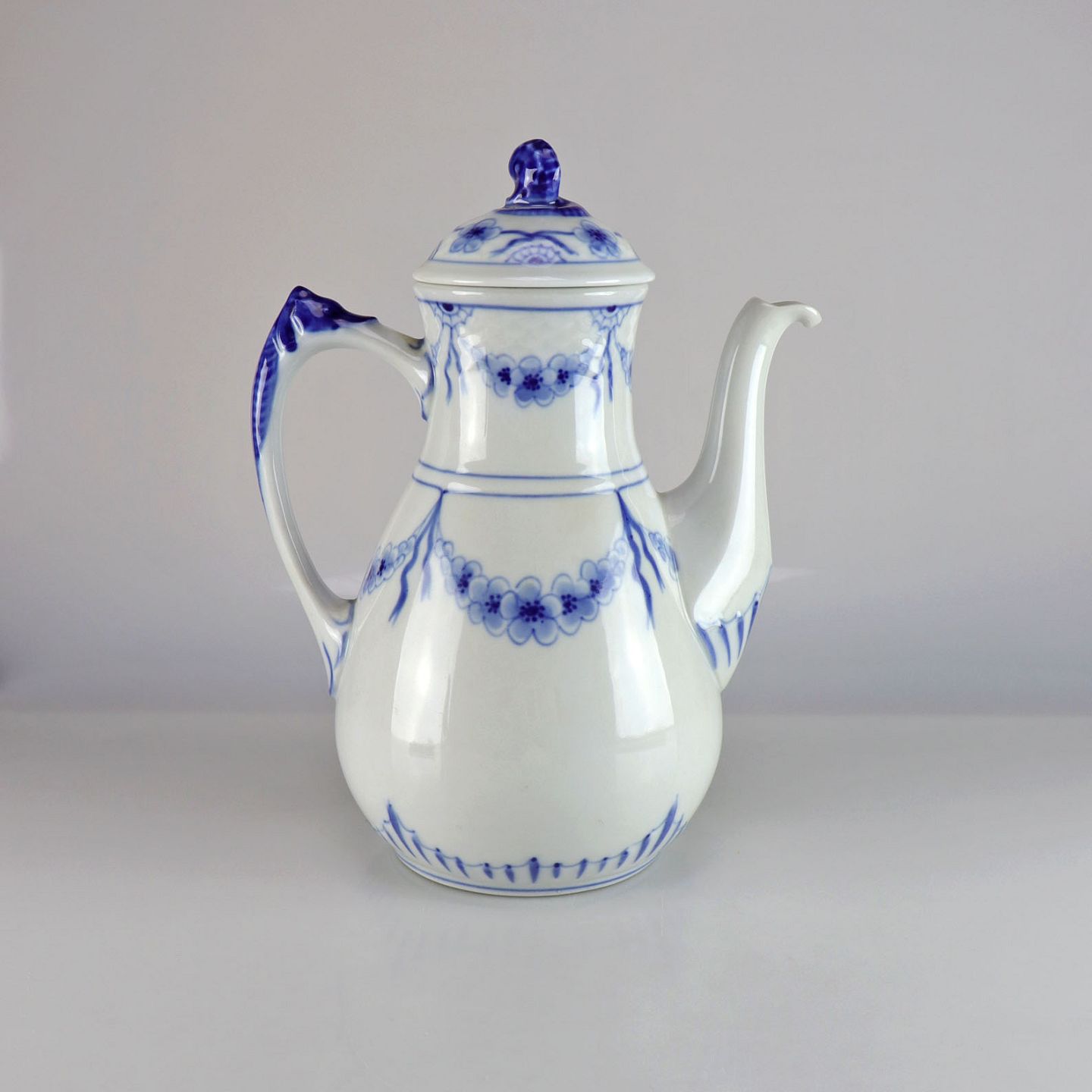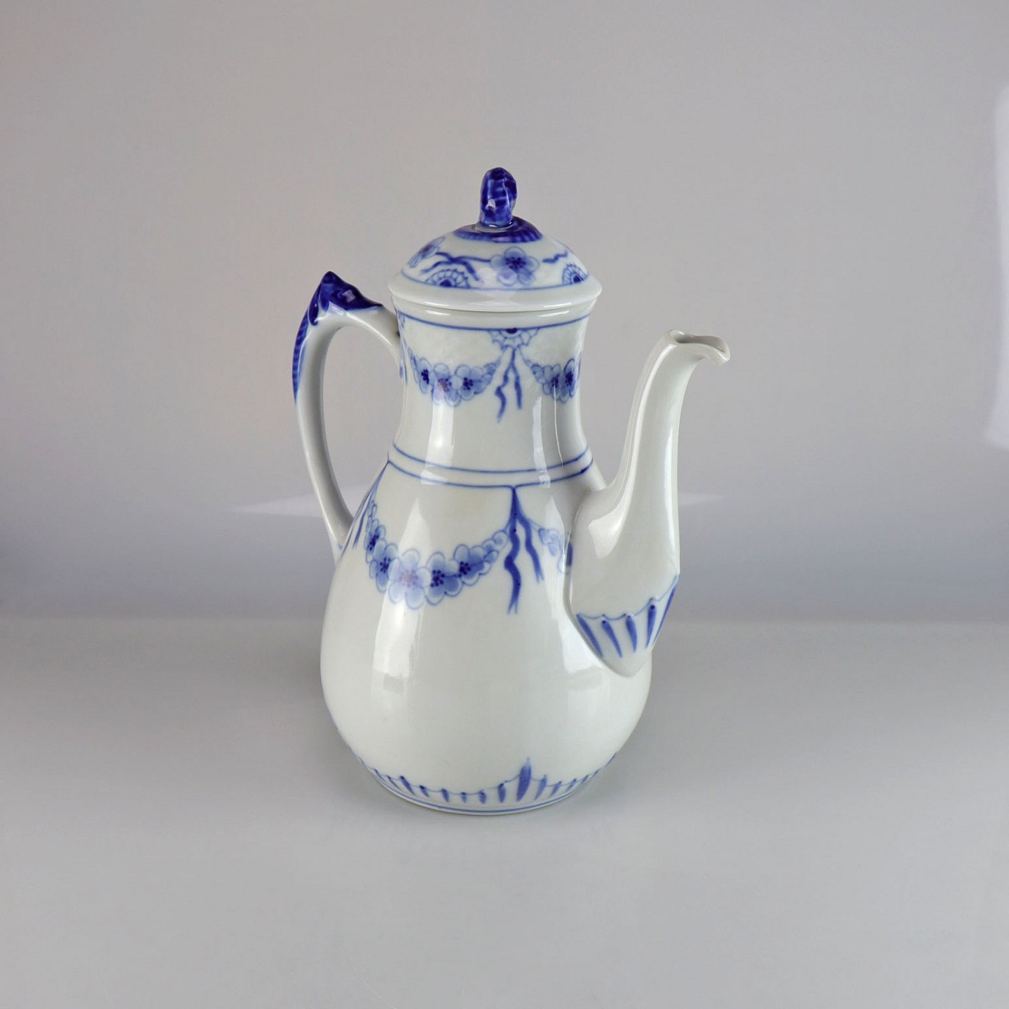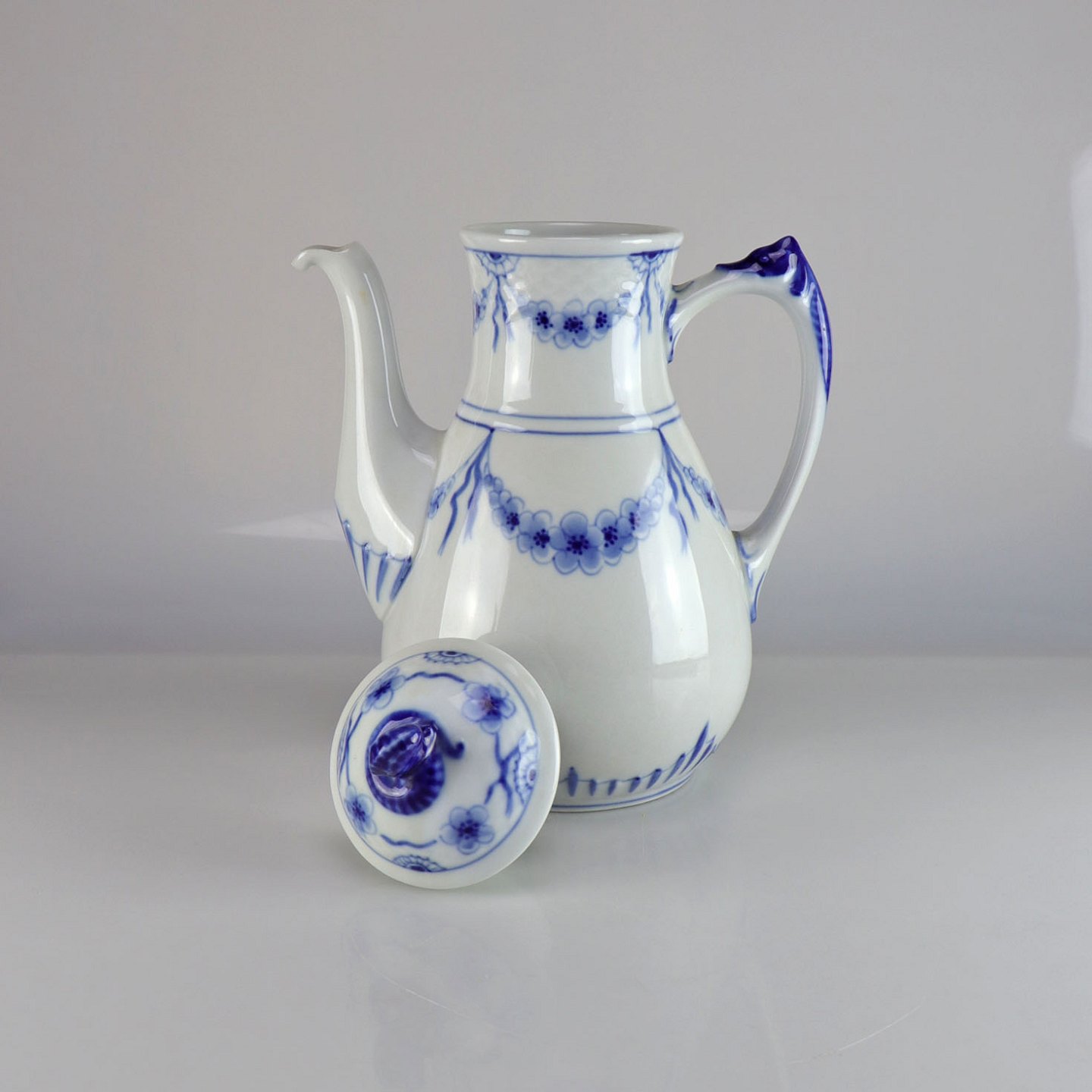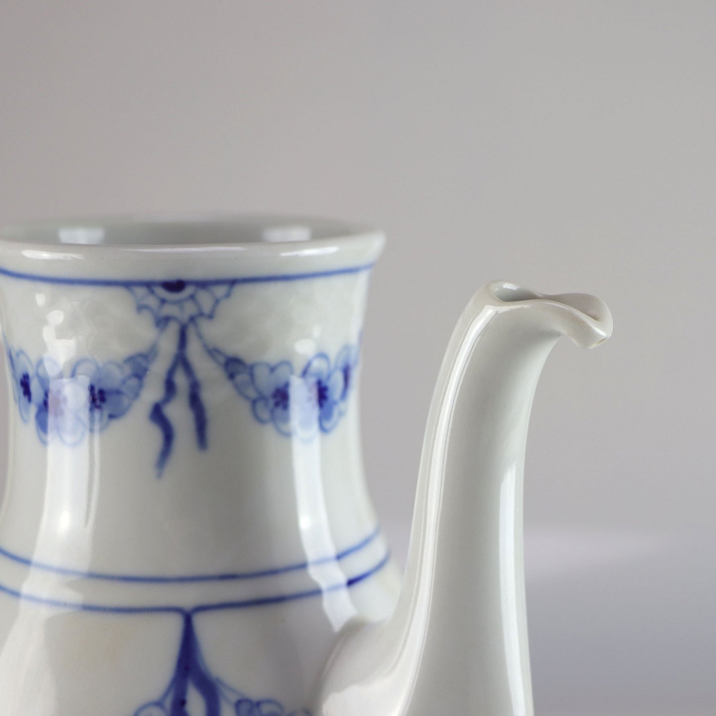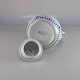Kande i hvidt porcelæn med skelform og motiv af guirlander med blå blomster