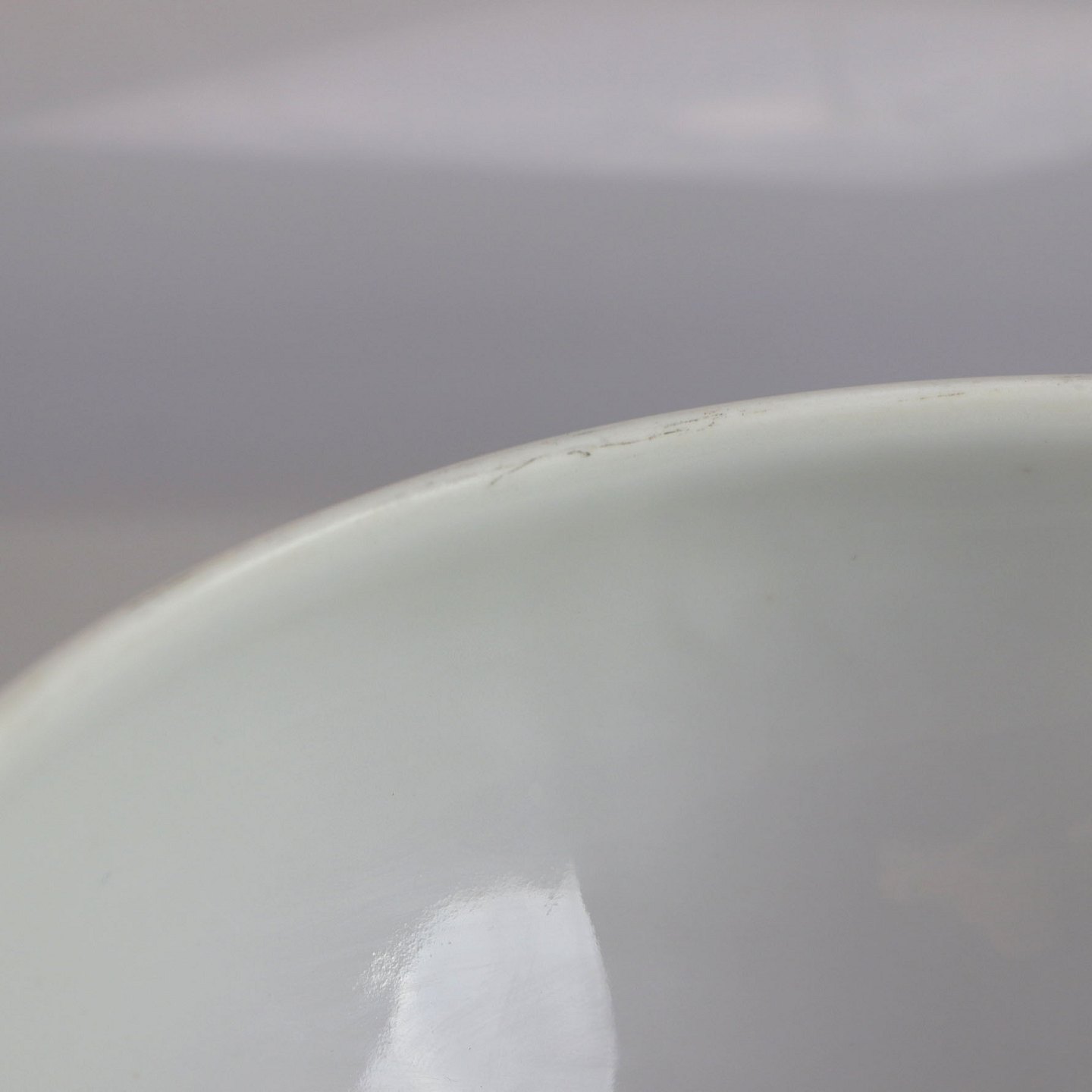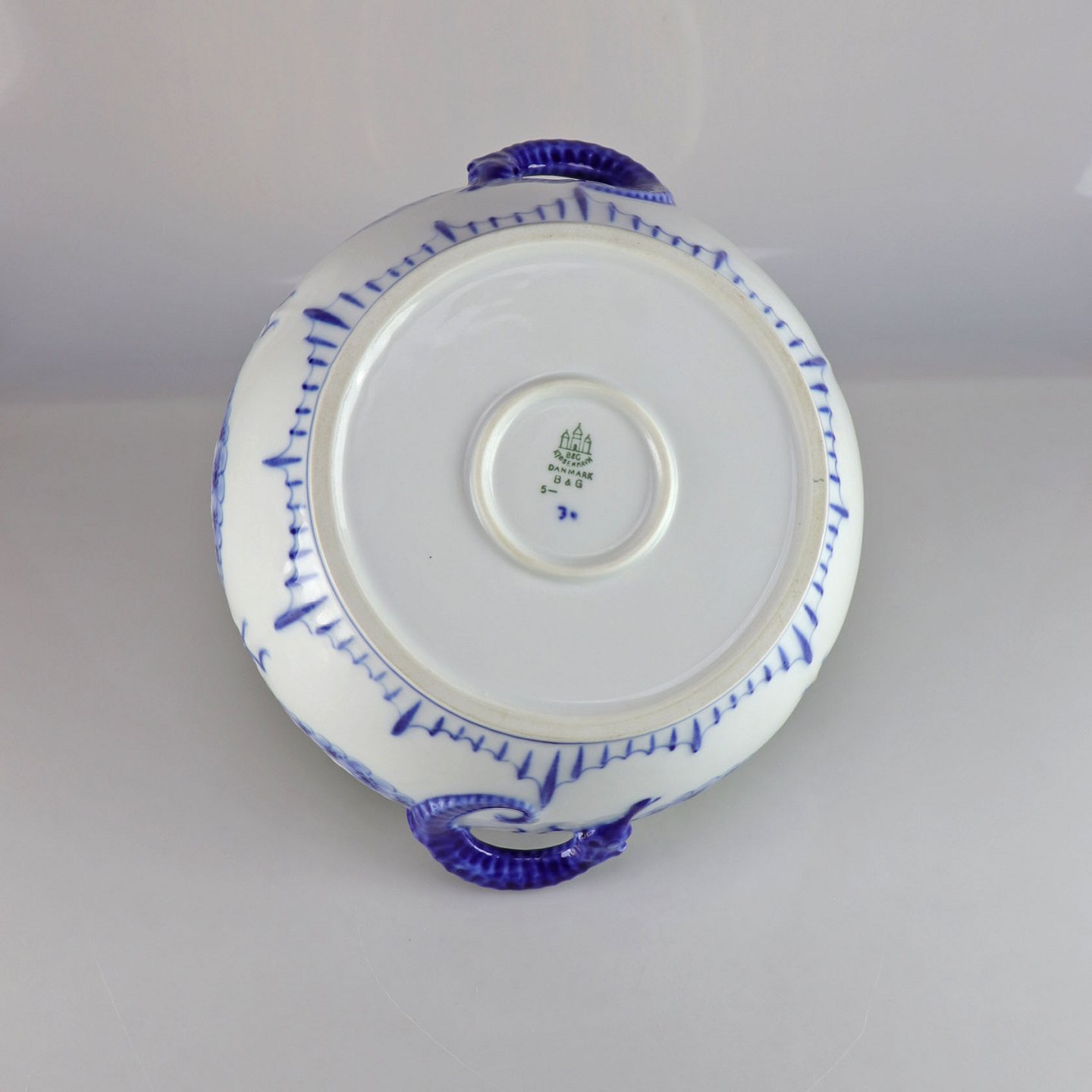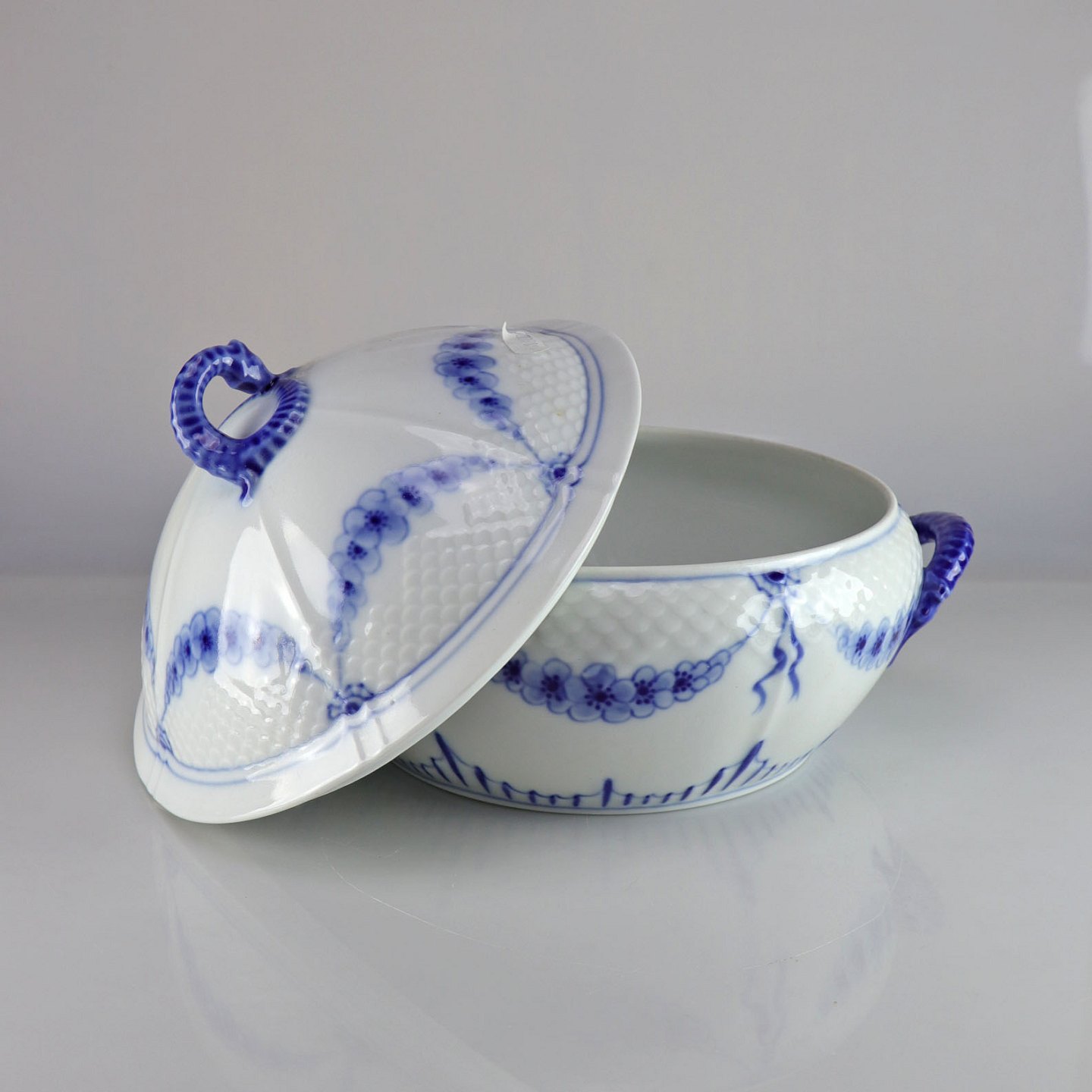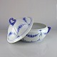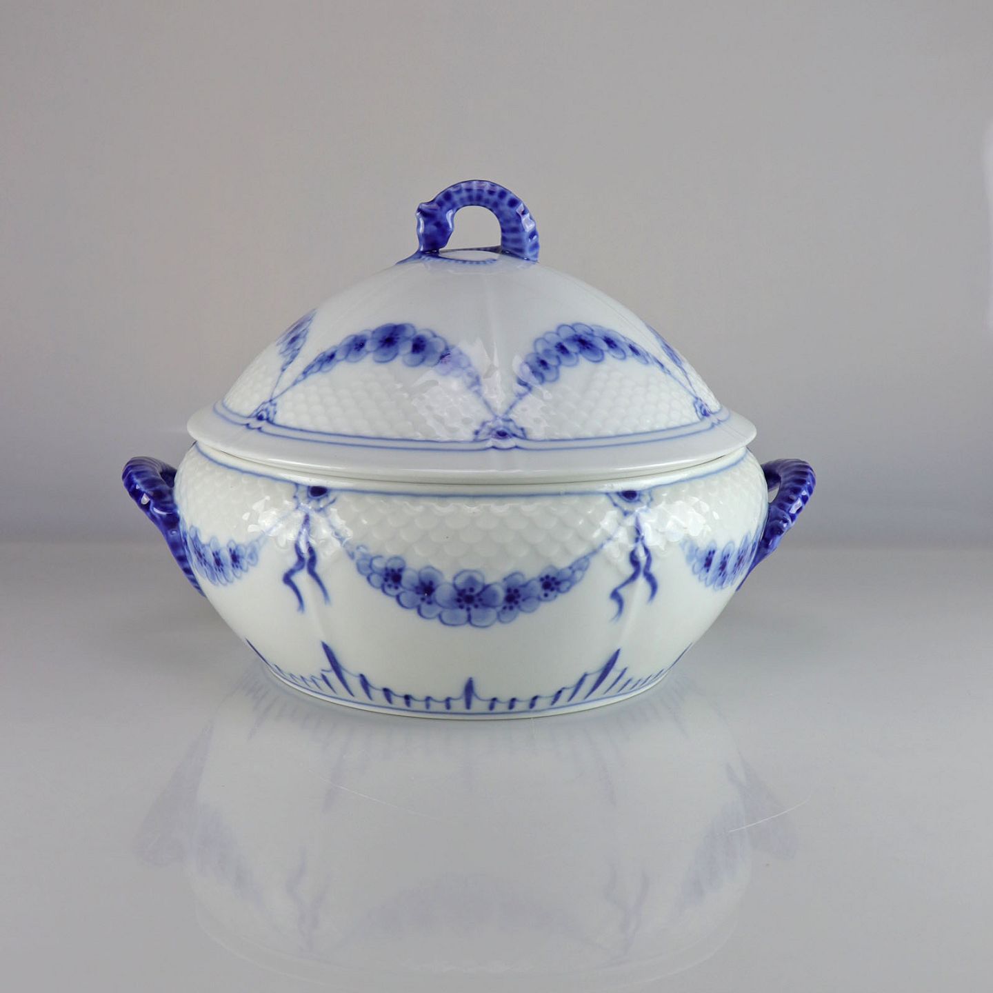 Lågfad i hvidt porcelæn med skelform og motiv af guirlander med blå blomster