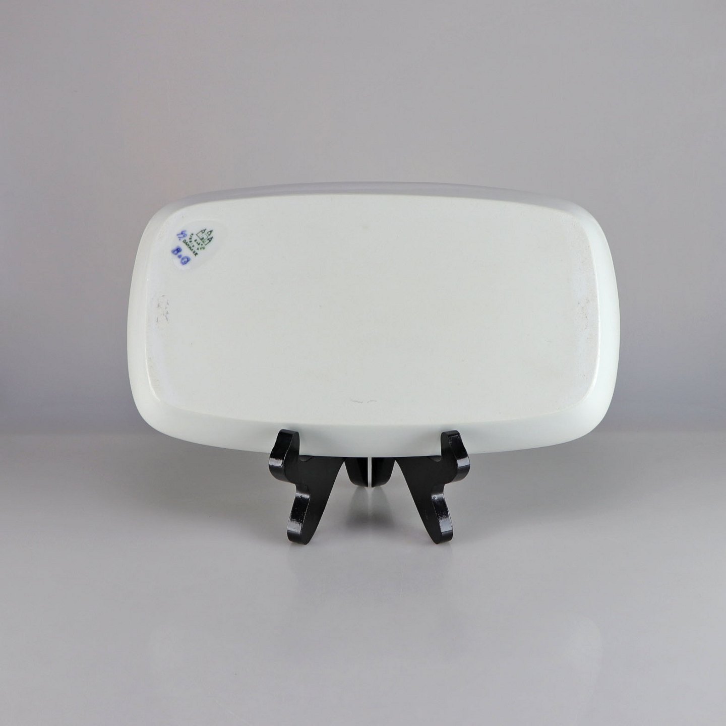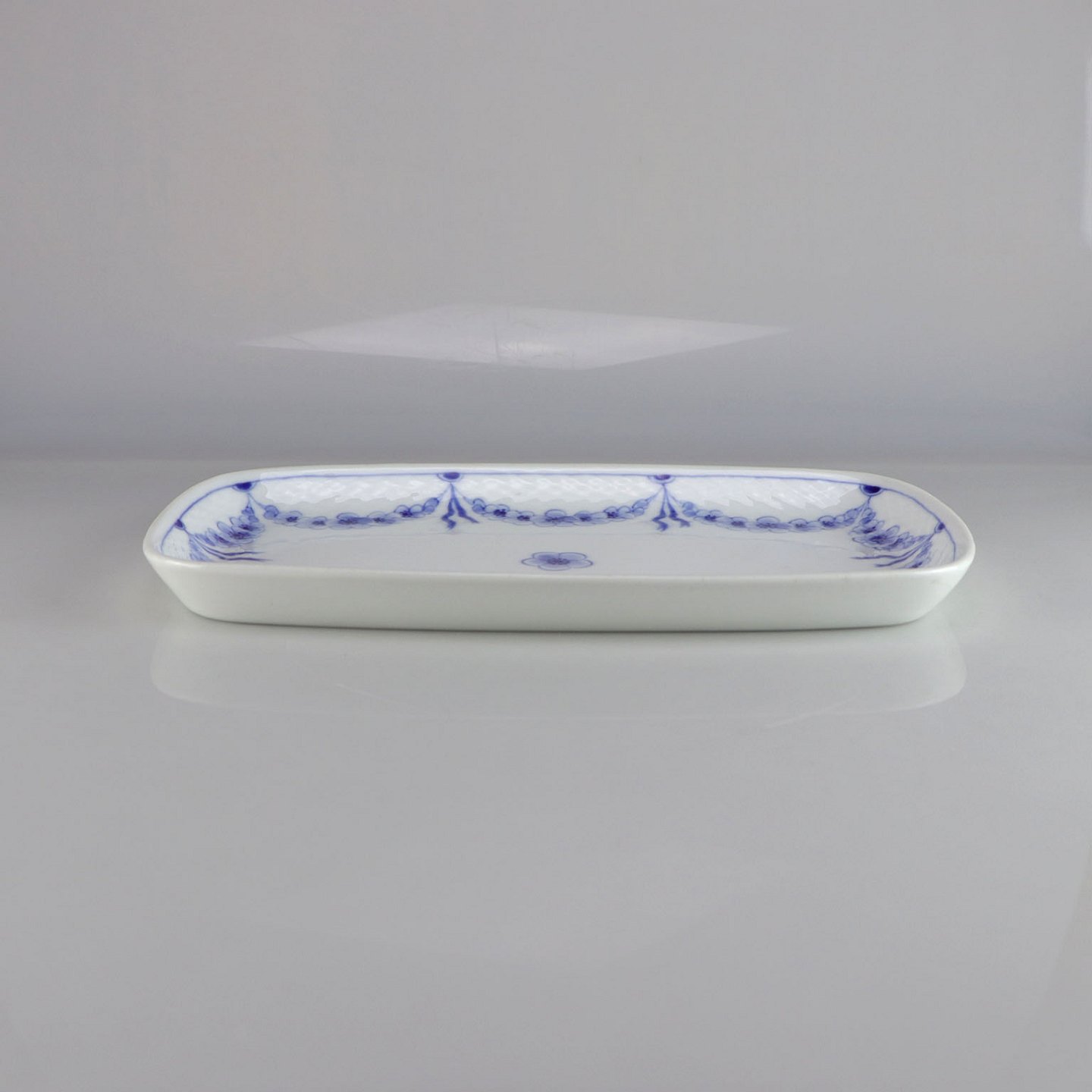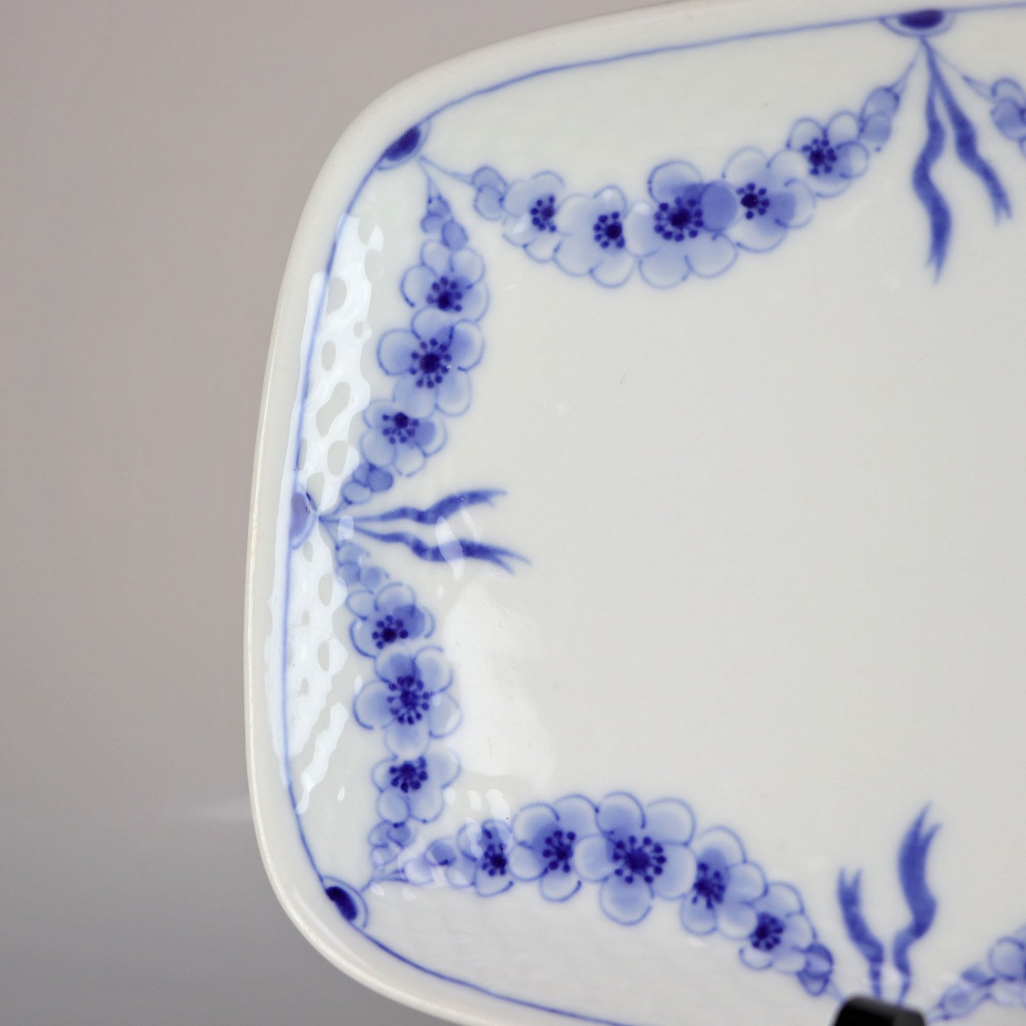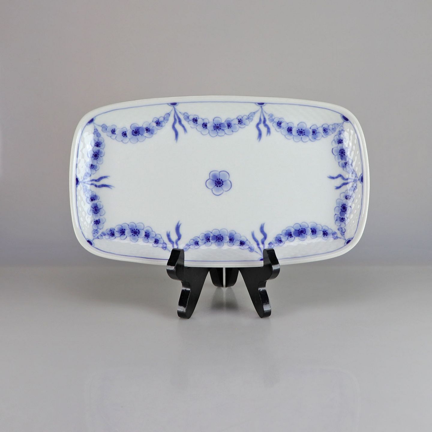 Serveringsfad i hvidt porcelæn med skelform og motiv af guirlander med blå blomster