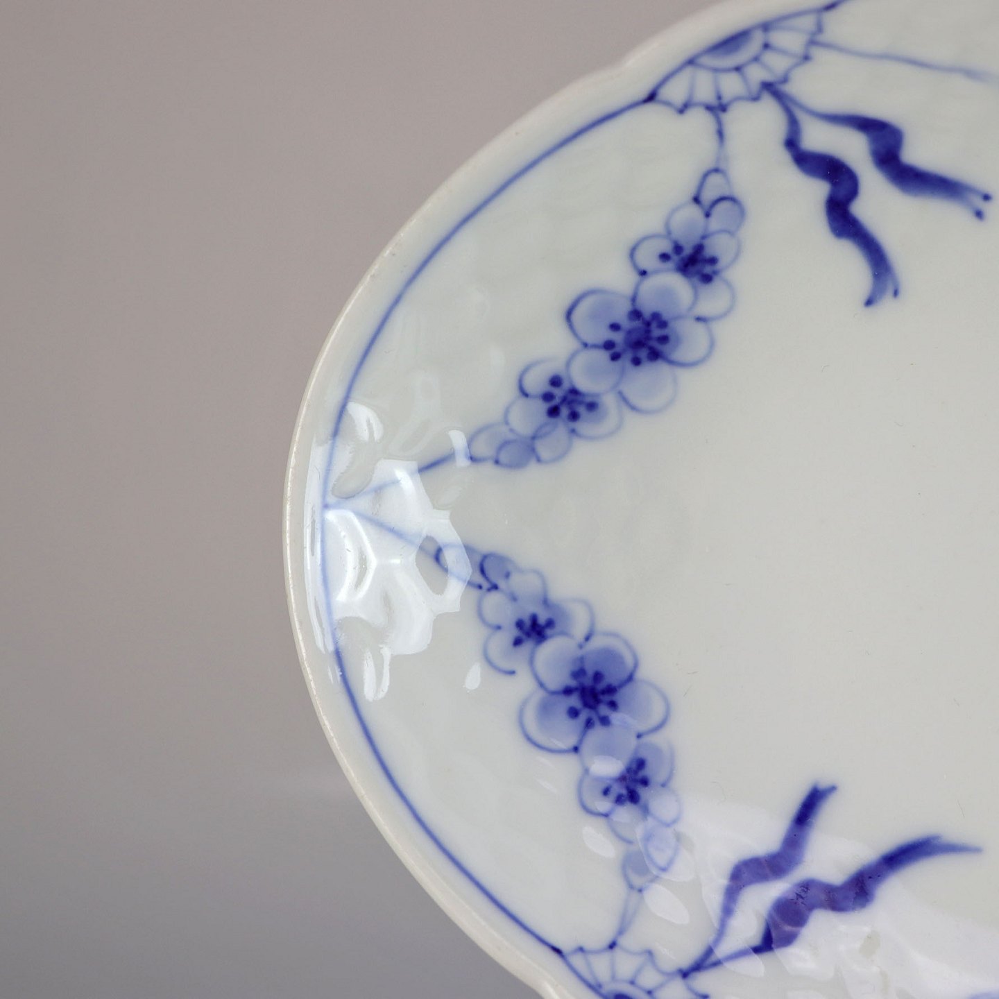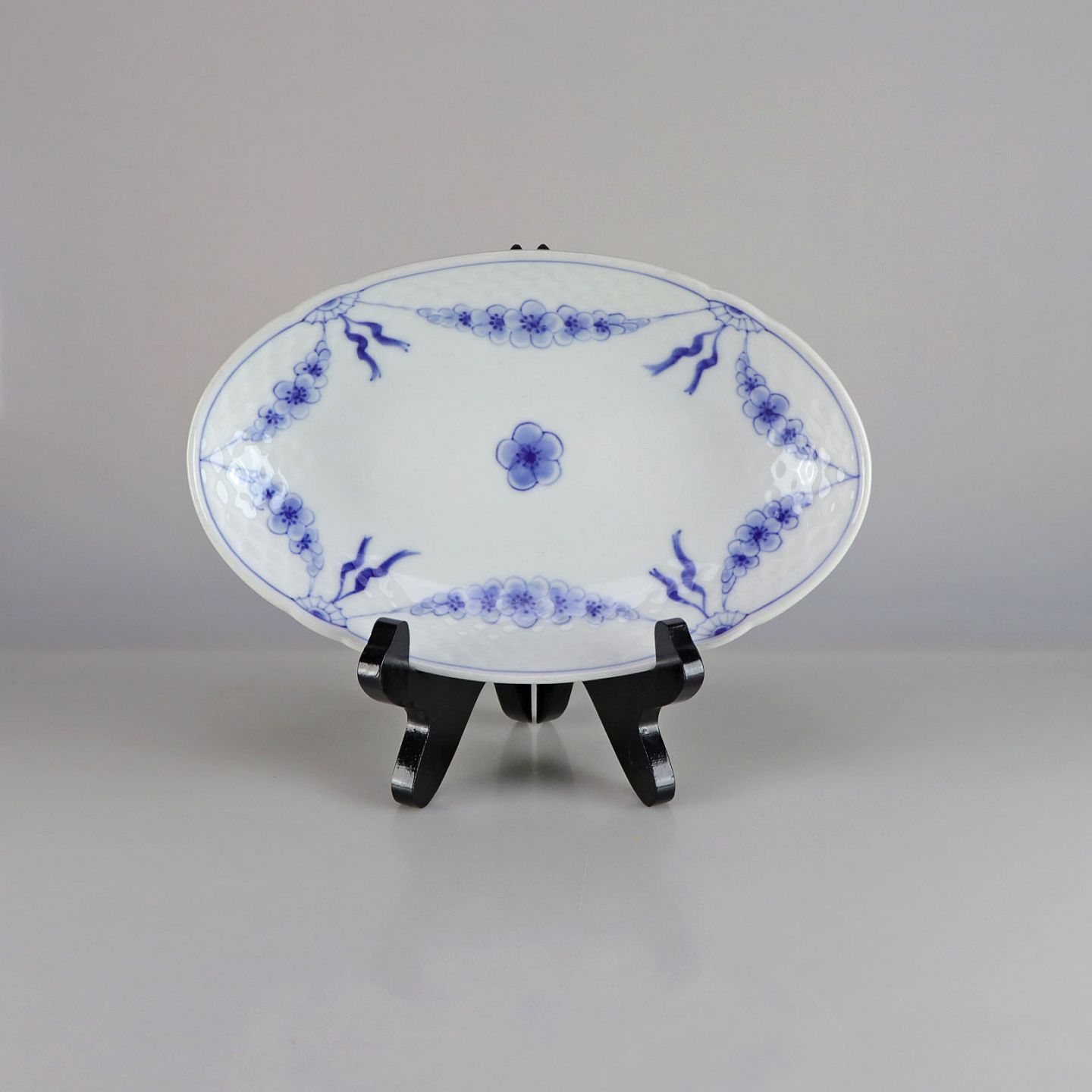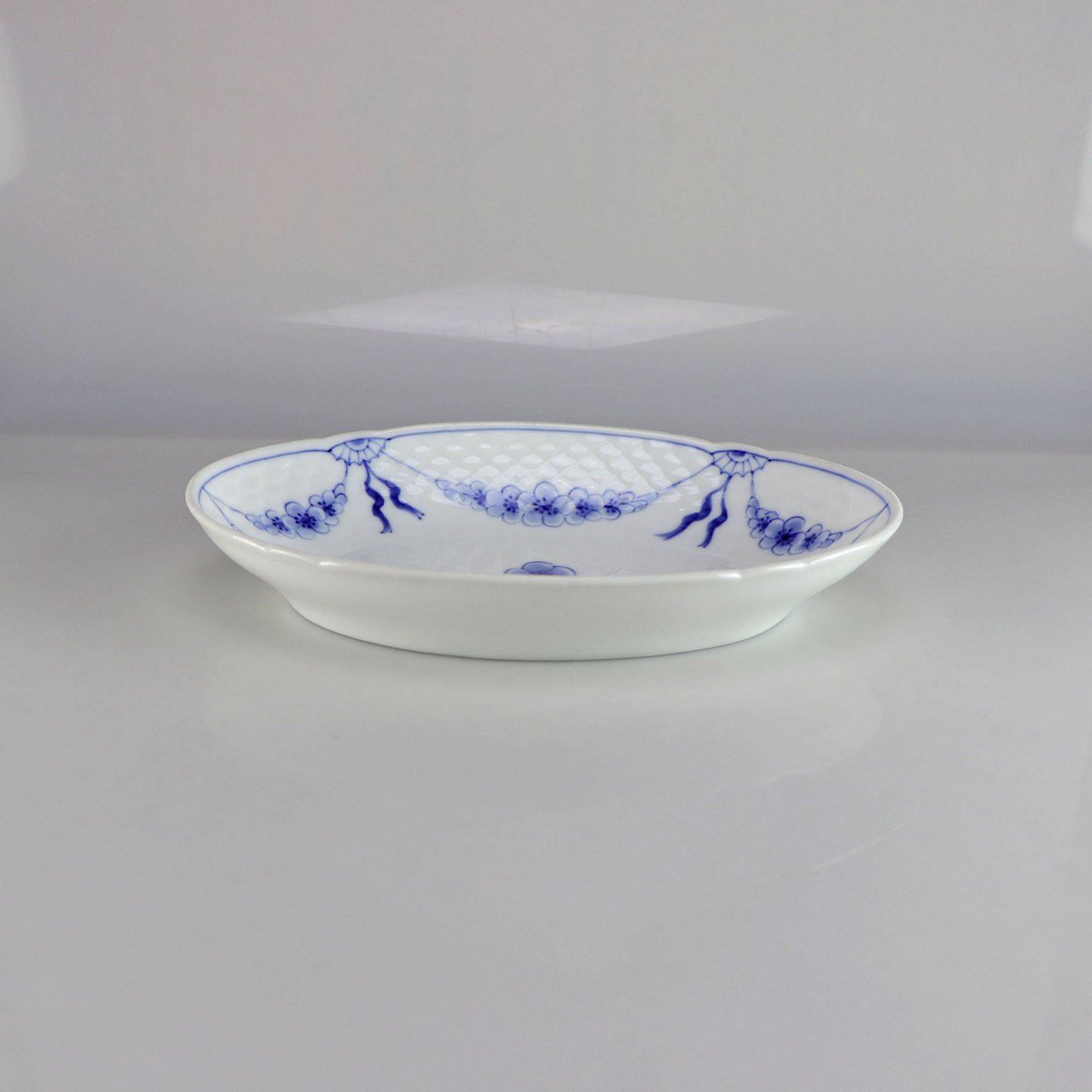 Fad i hvidt porcelæn med skelform og motiv af guirlander med blå blomster