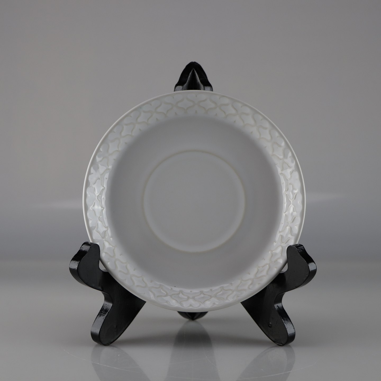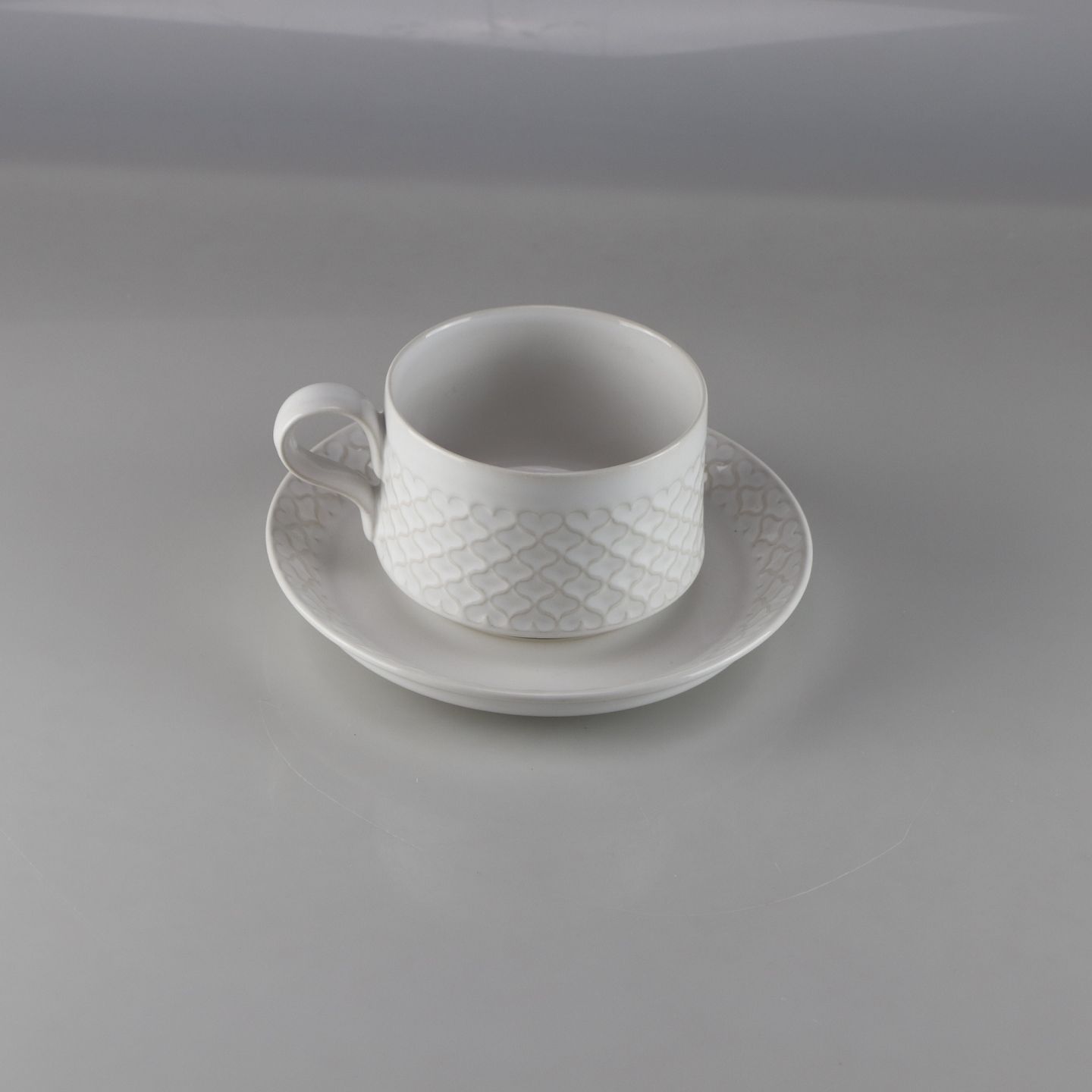 Kaffekop i stentøj. Kop og underkop i hvid stentøj med abstrakt mønster