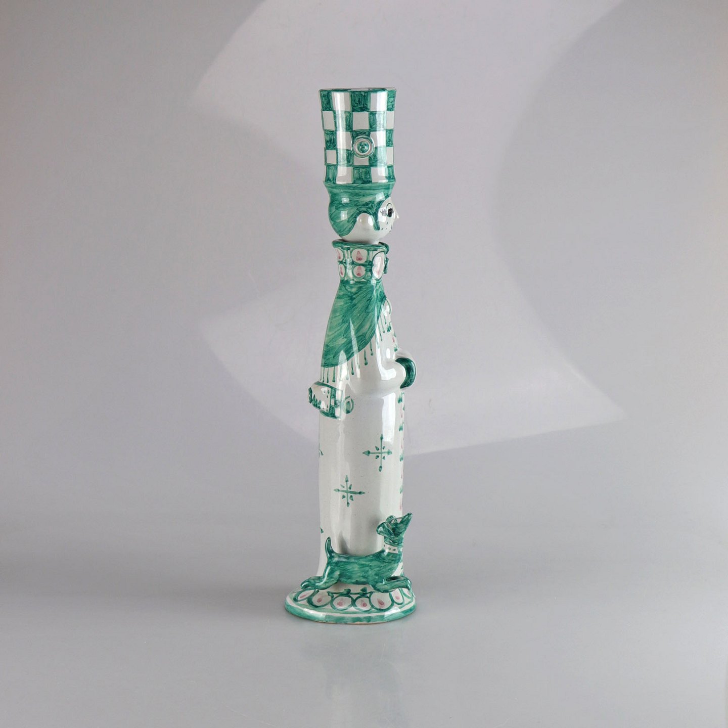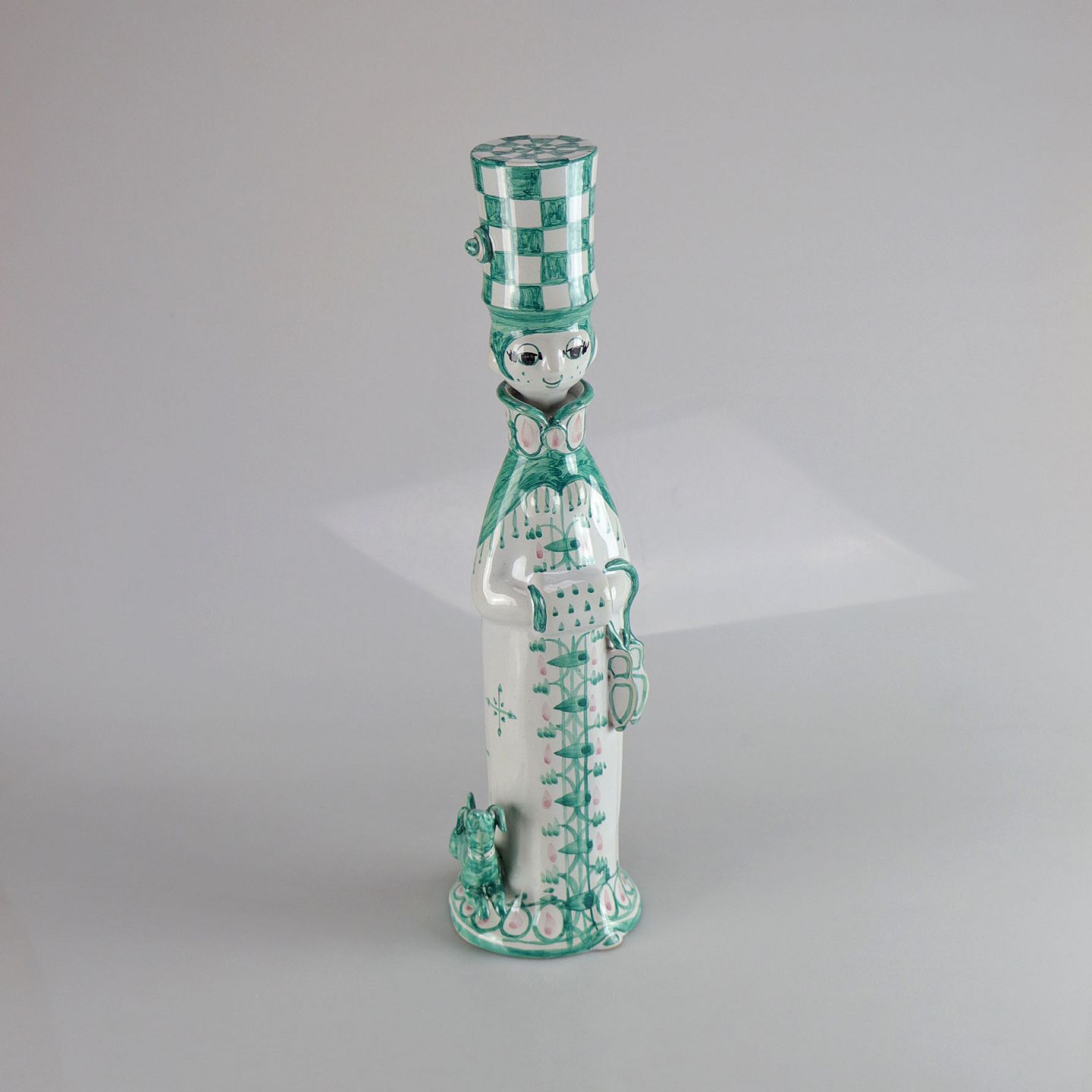 Glaseret keramik med motiv af kvinde med hund og skøjter i grøn dekoration