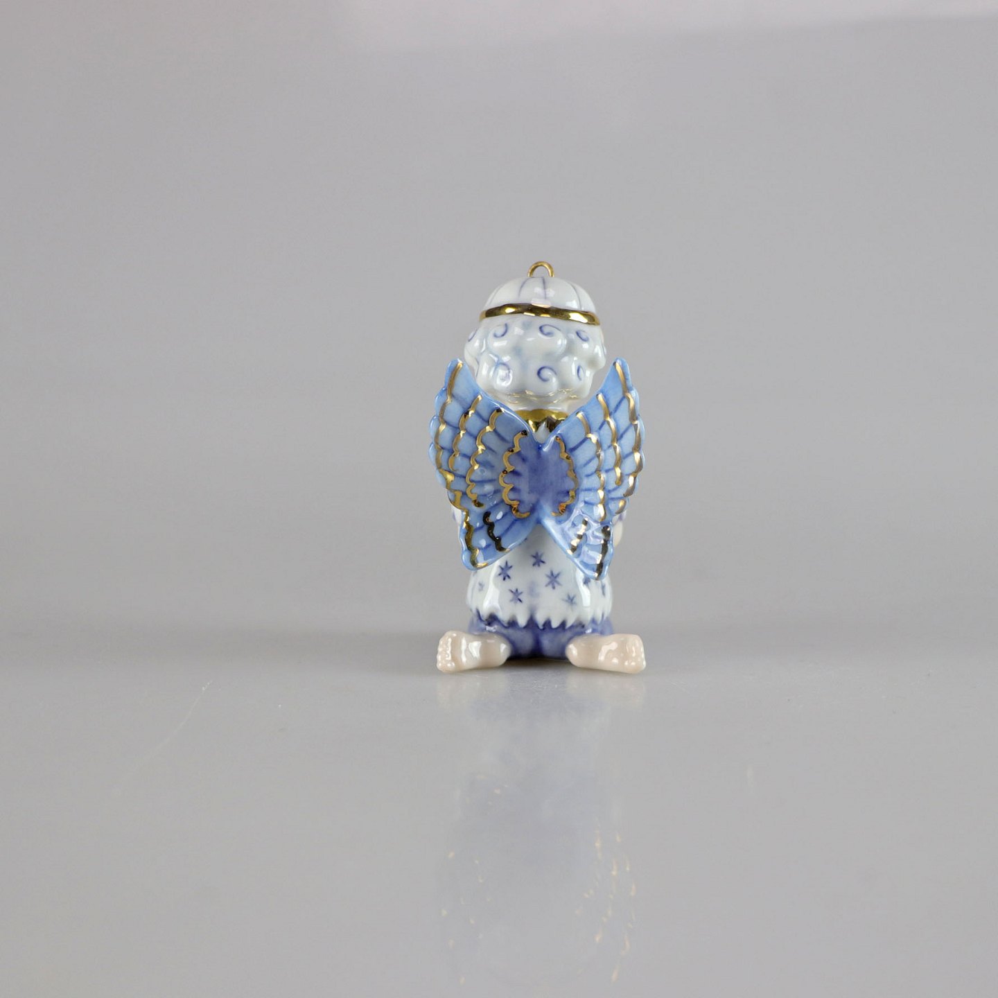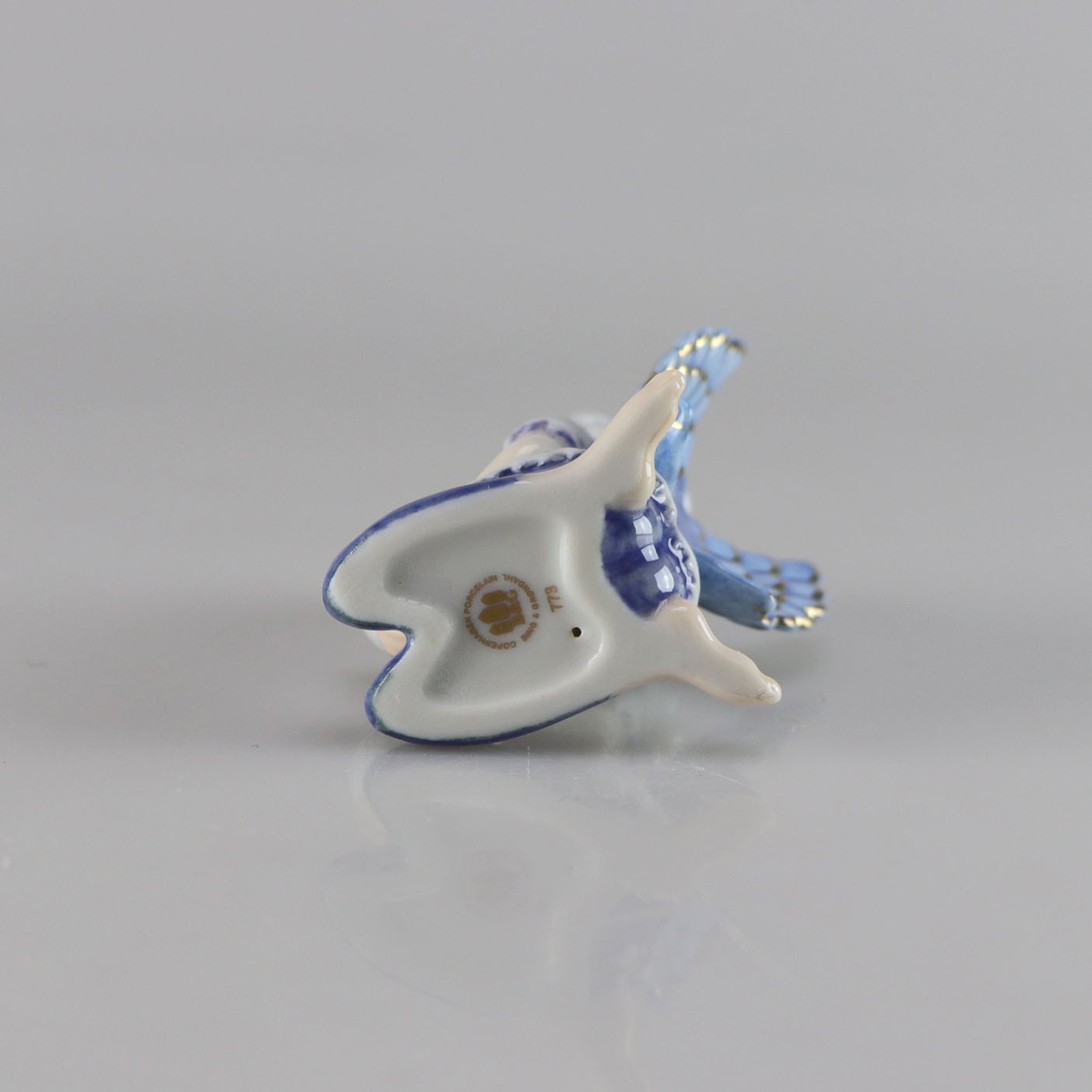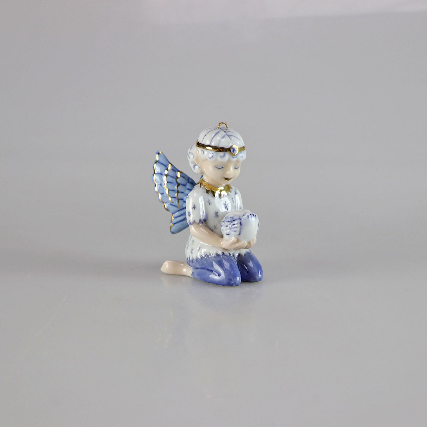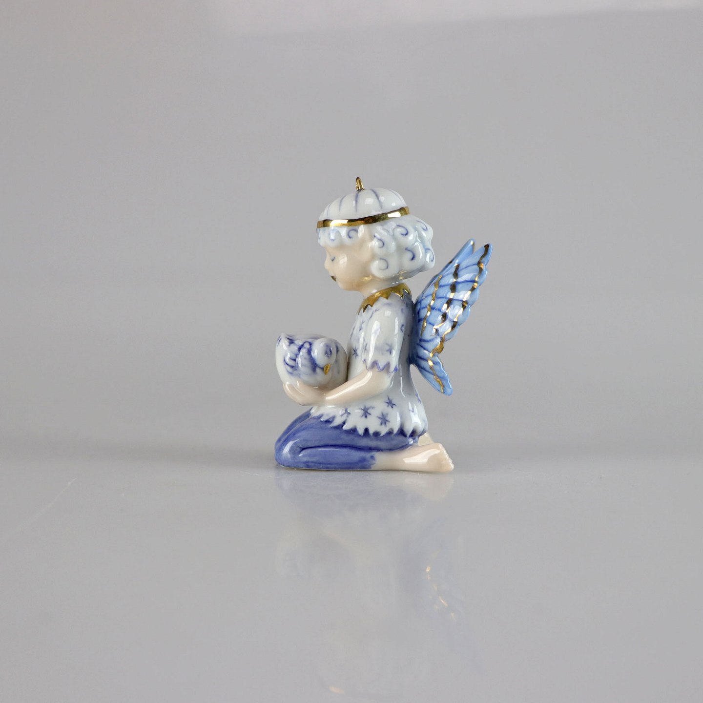 Lille porcelænsfigur med motiv af siddende alf med fugl i hænderne