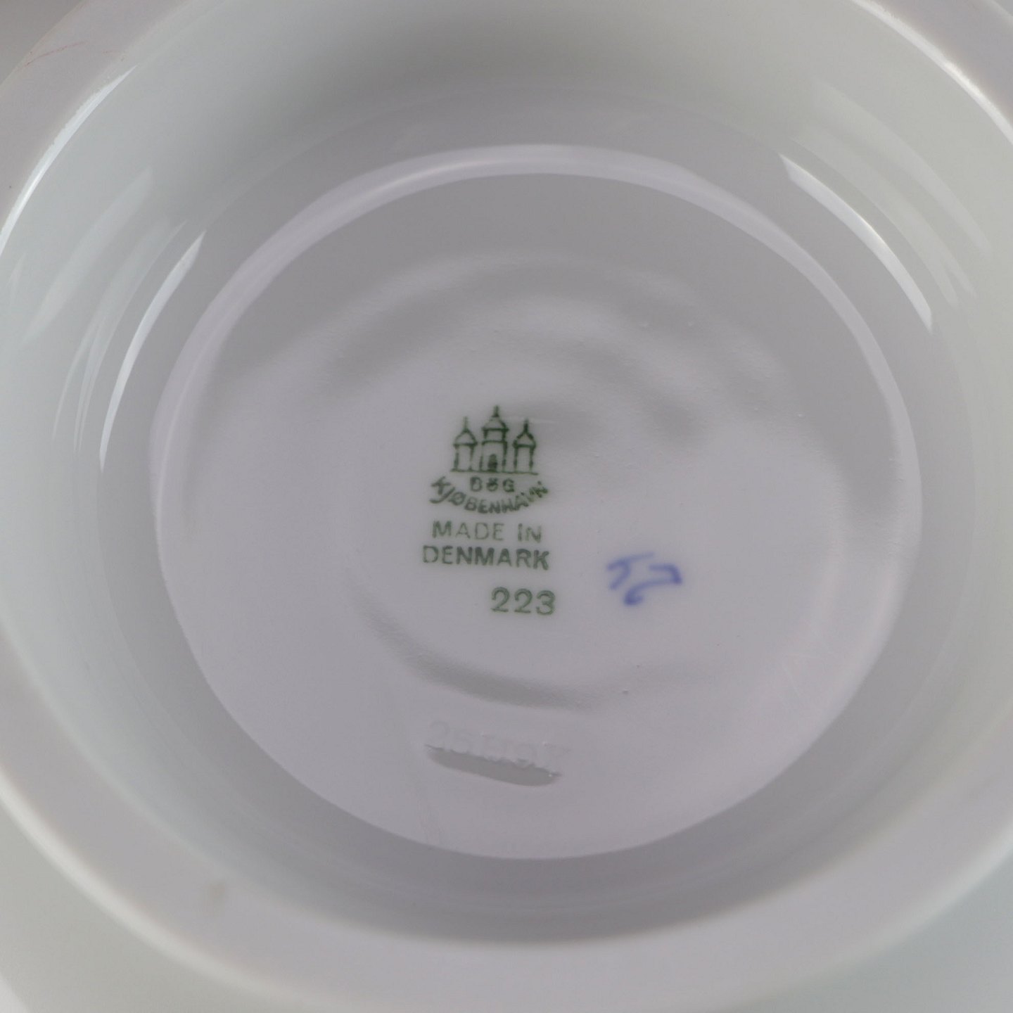 Fad i hvidt porcelæn med skelform og motiv af guirlander med blå blomster
