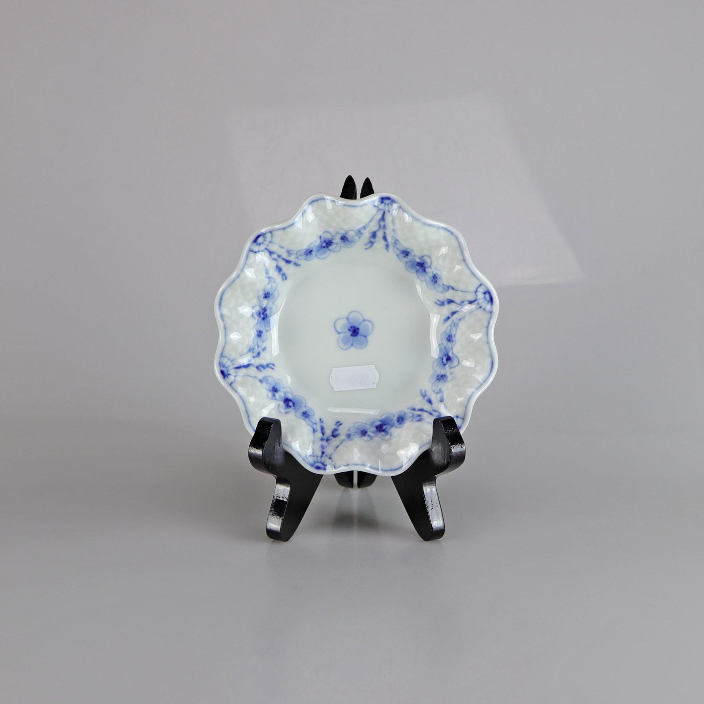 Kuvert asiet i hvidt porcelæn med skelform og motiv af guirlander med blå blomster