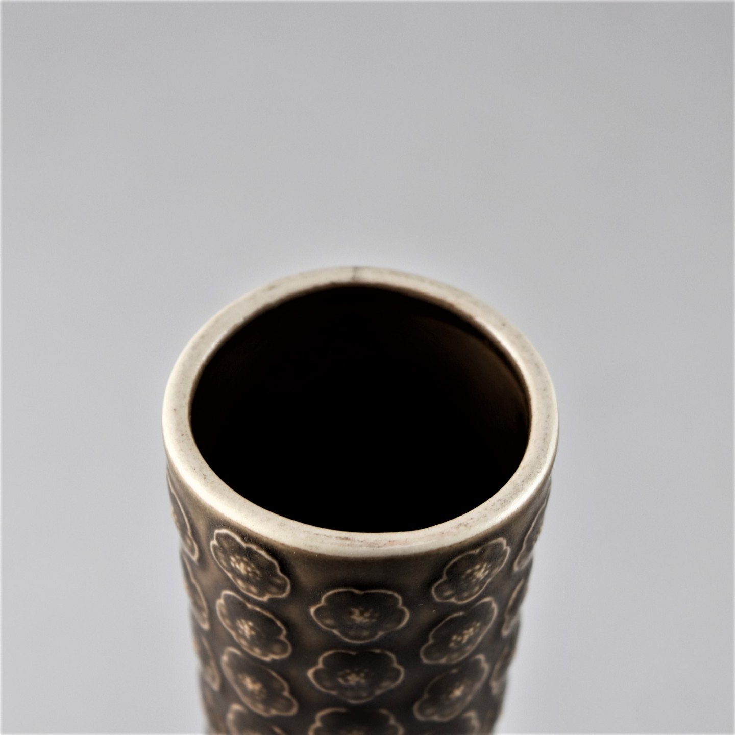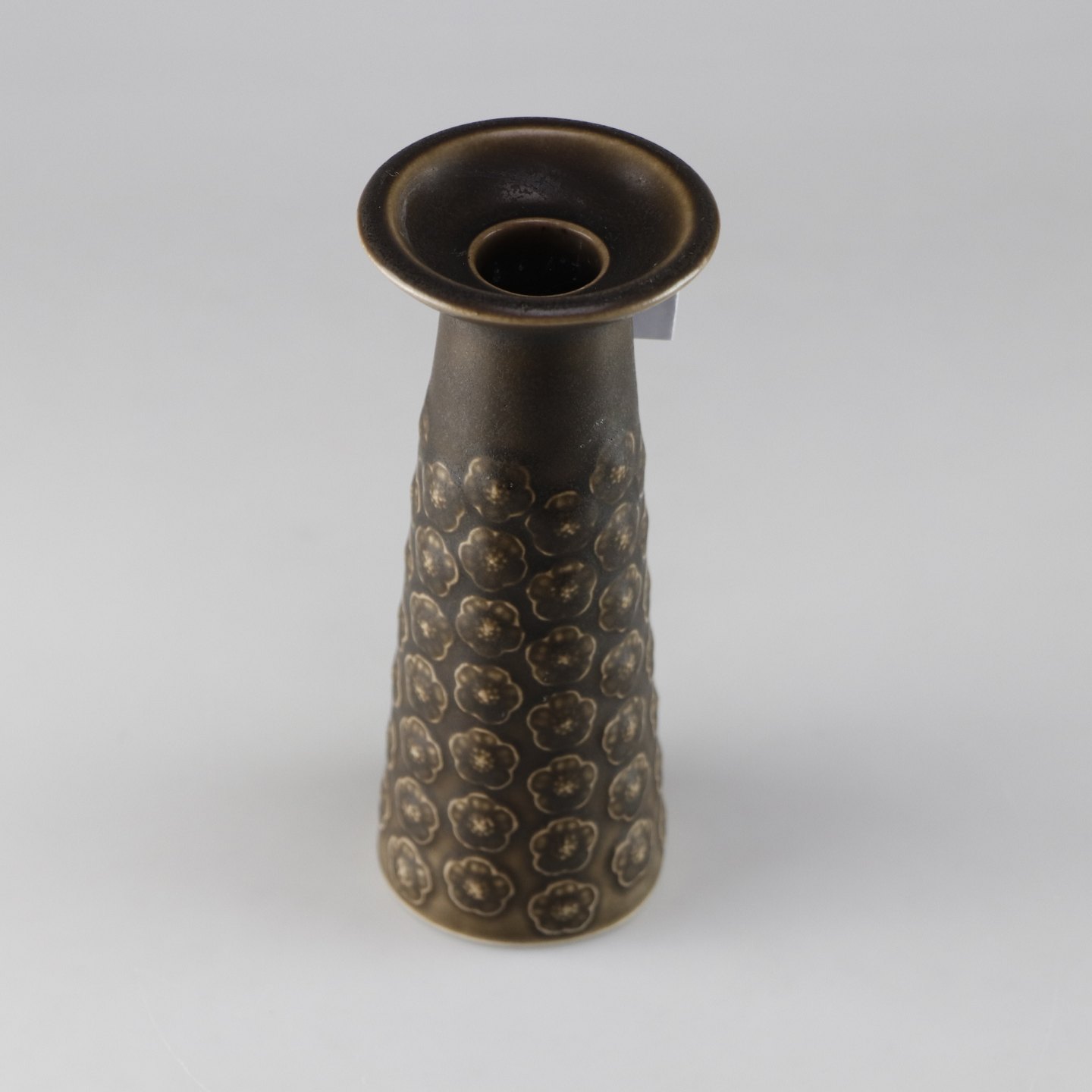 Stel i brun stentøj med blomster motiver. Den kan vendes så den enten er en vase eller en lysestage.