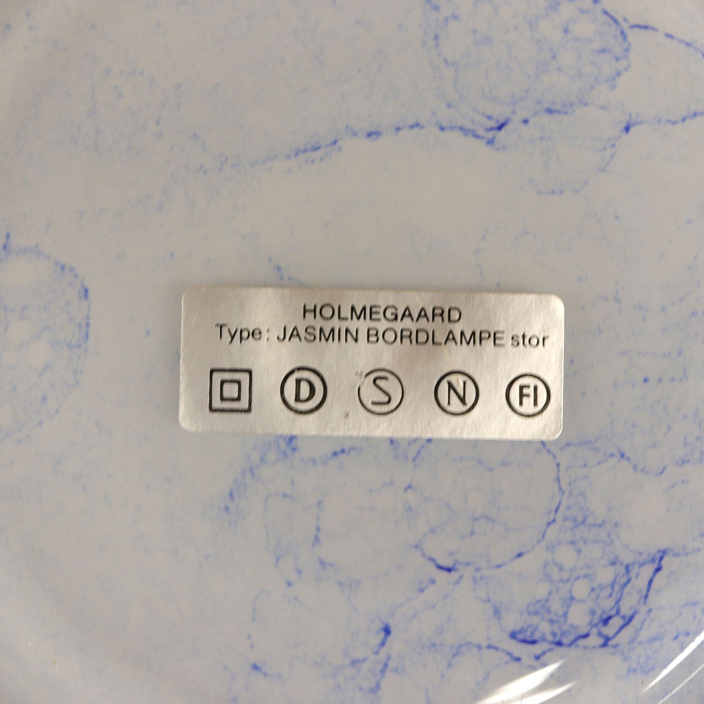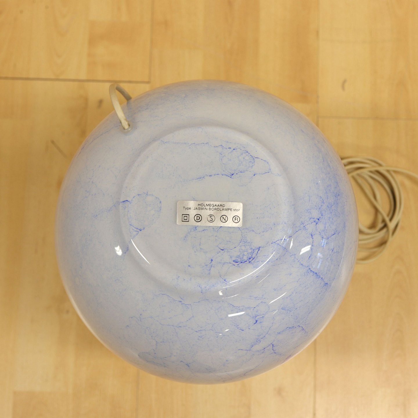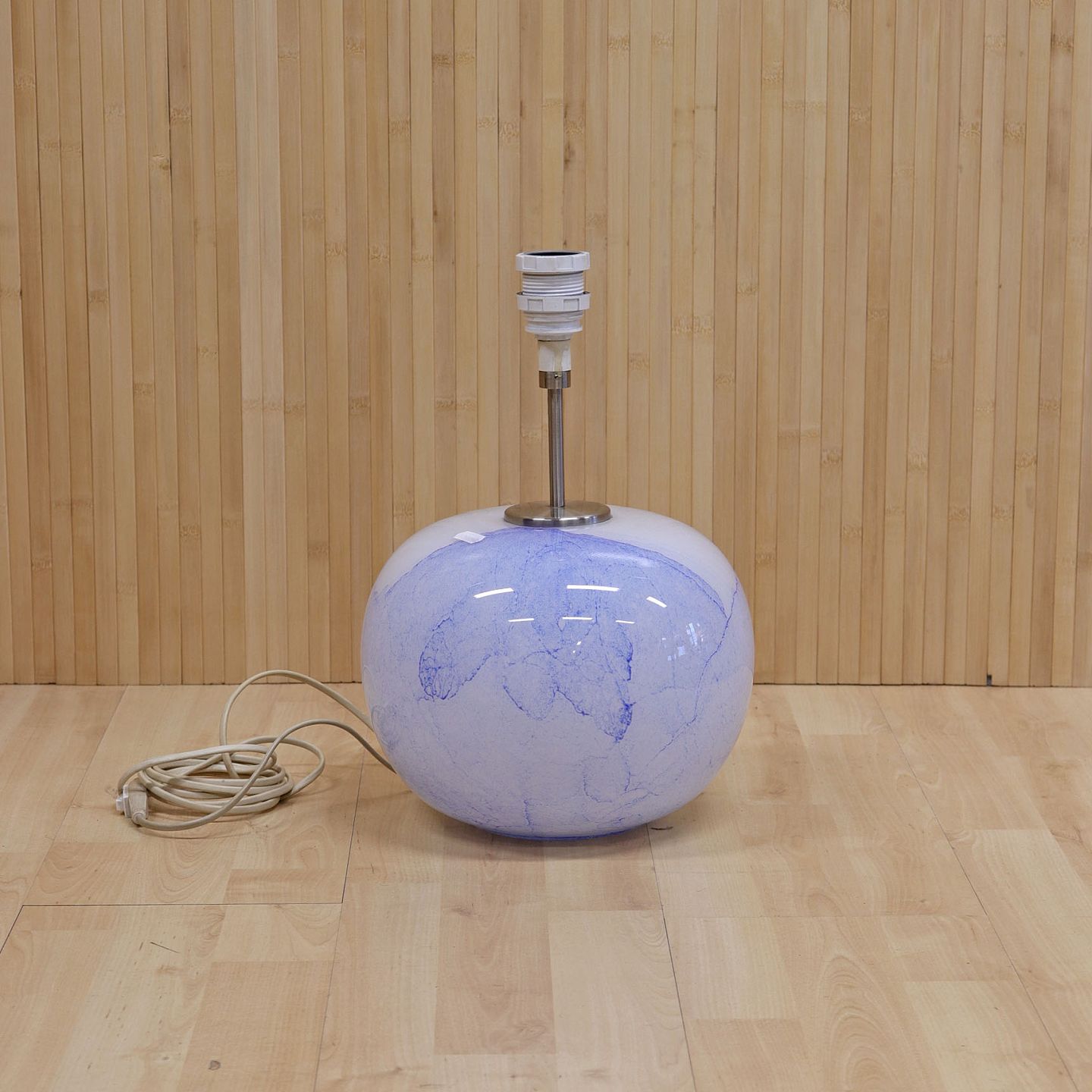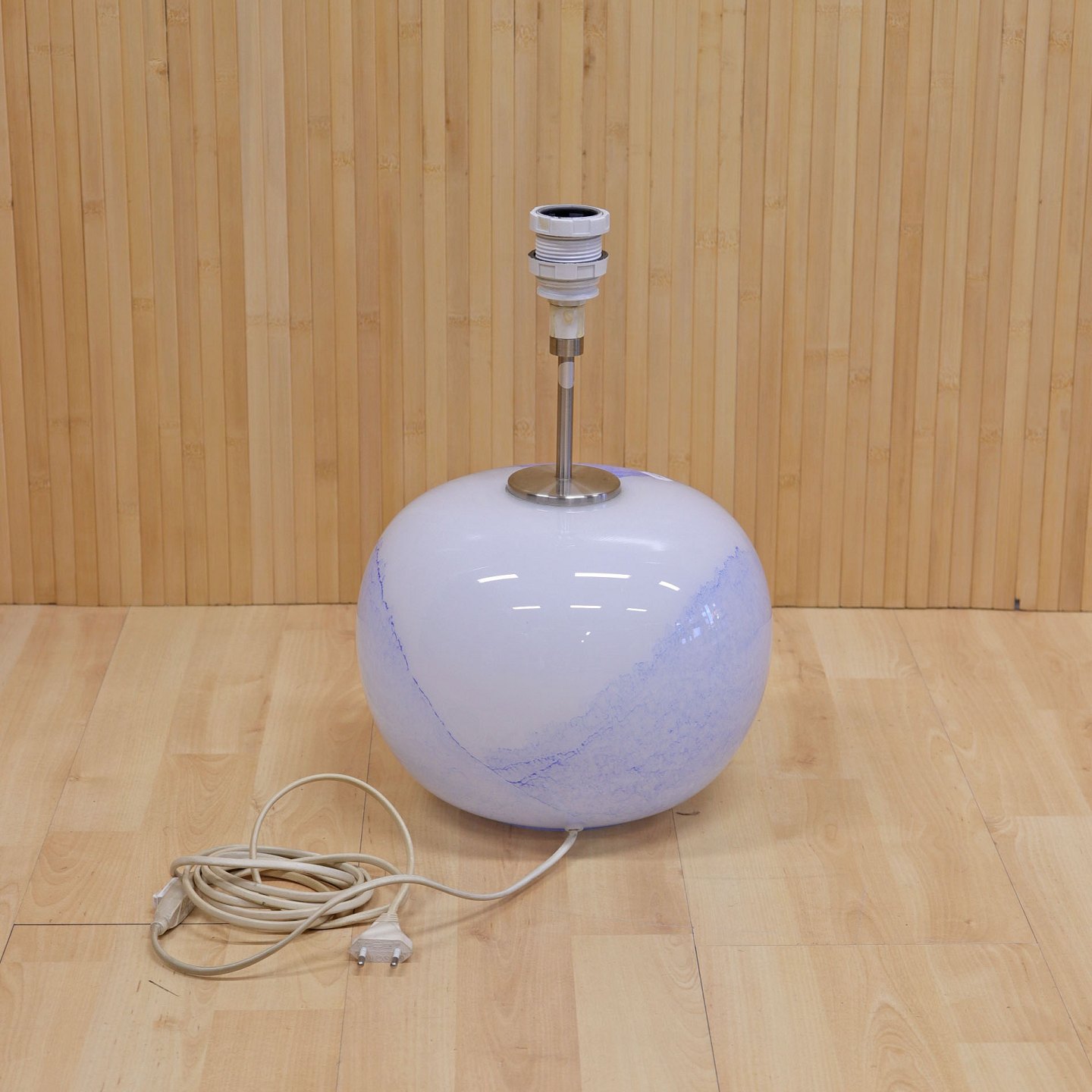 Rund opalhvid lampefod med abstrakt blåt mønster