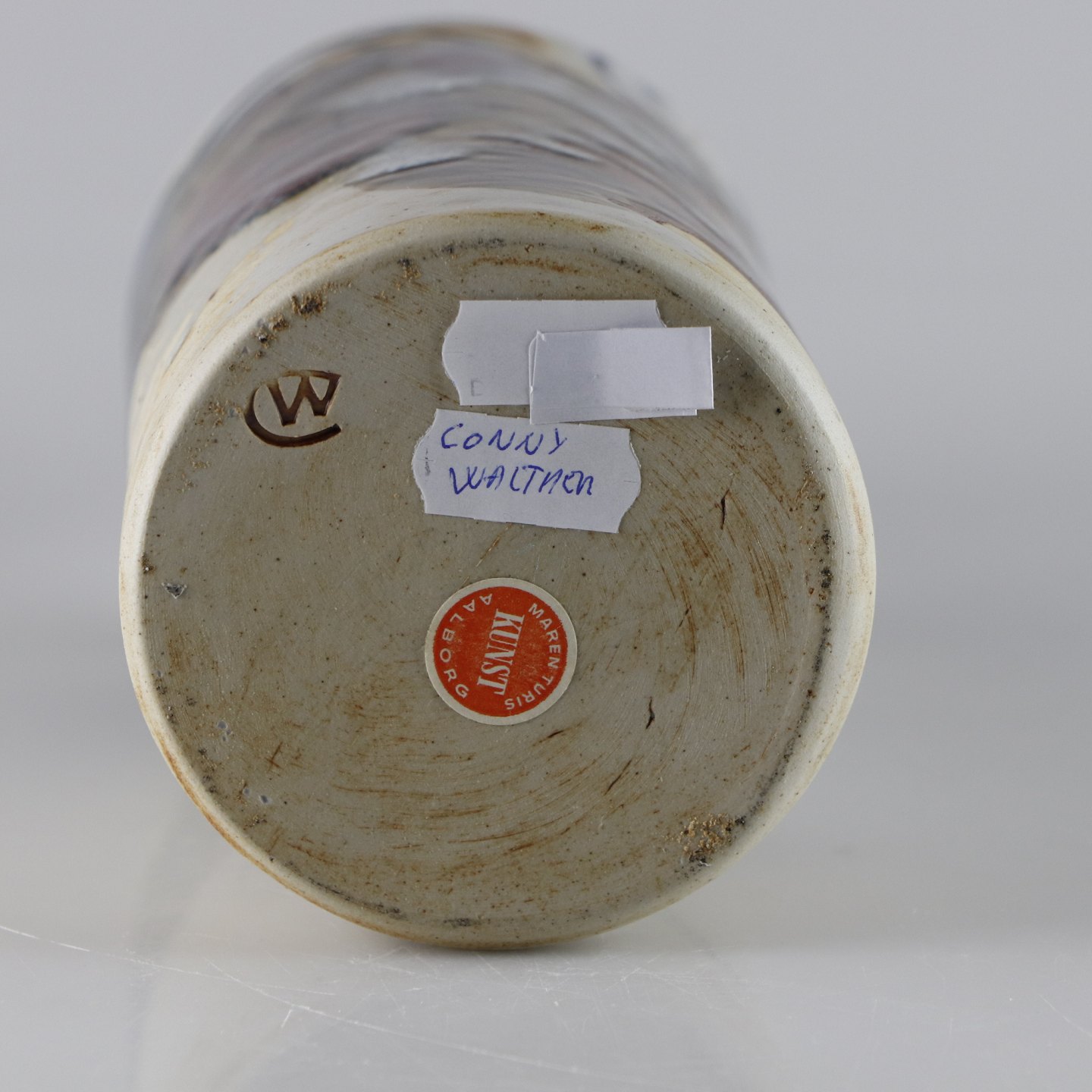Flaskeformet vase i stentøj med lys glasur med abstrakt blåt og brunt mønster