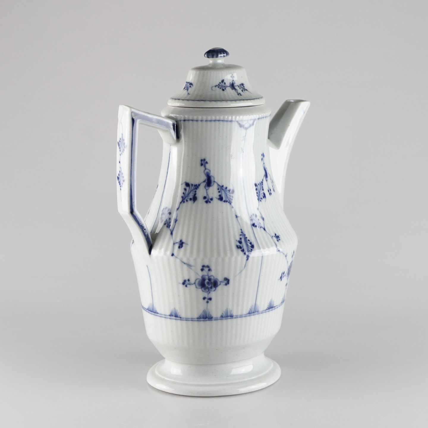Kongelig musselmalet riflet kande med hank og låg