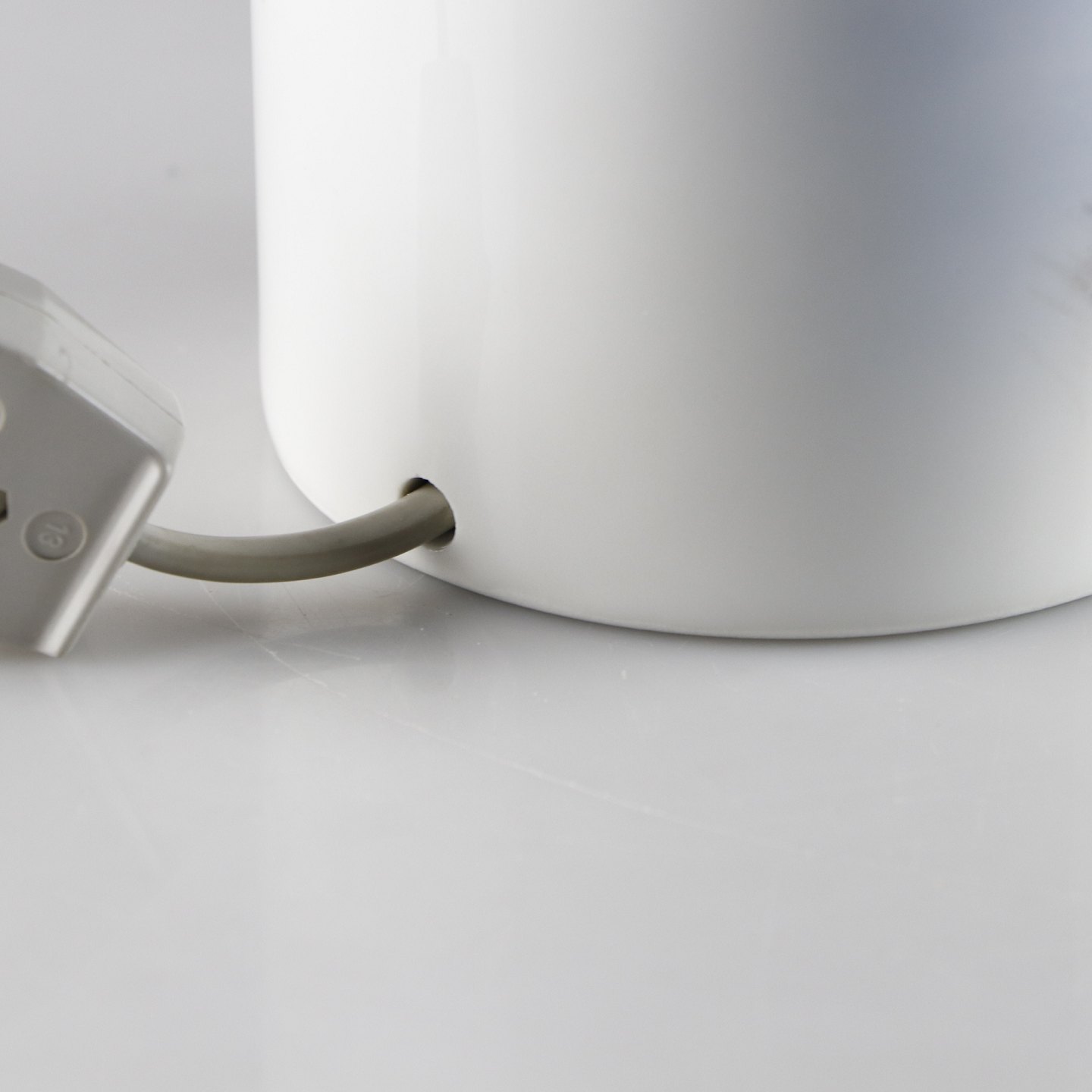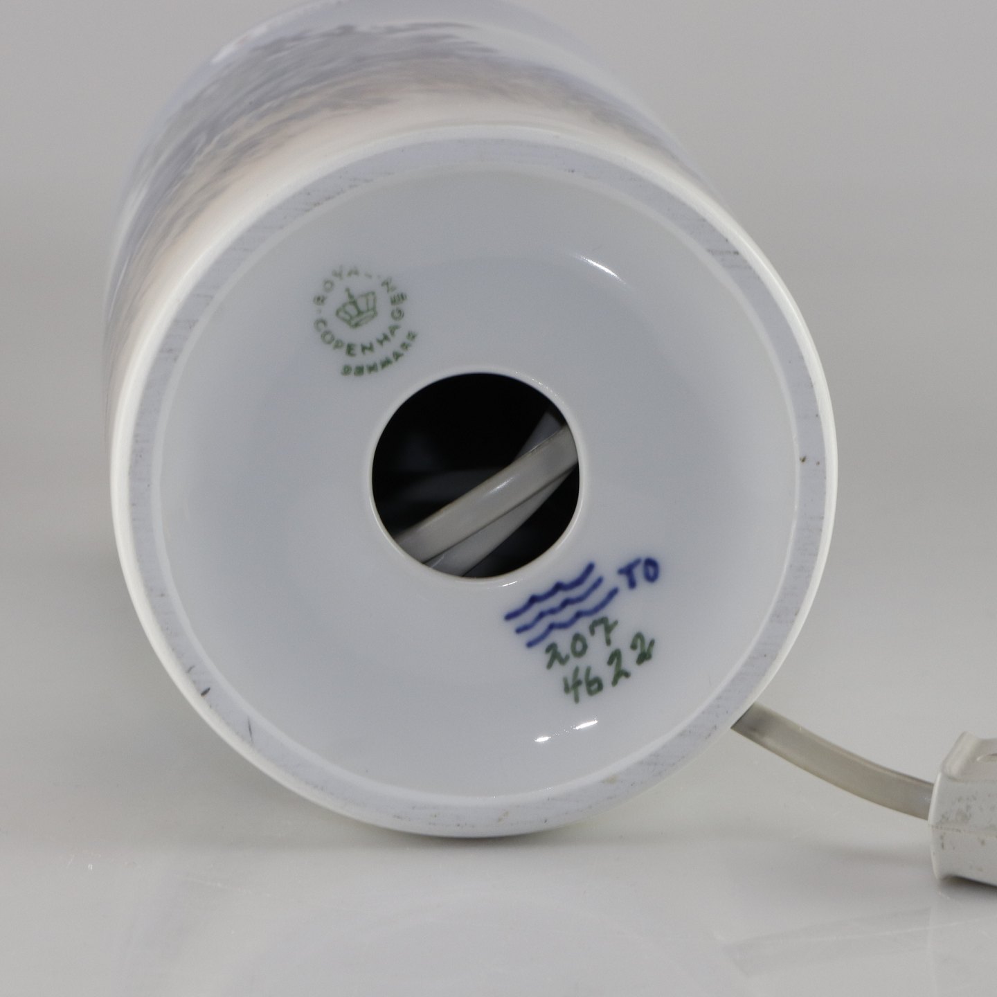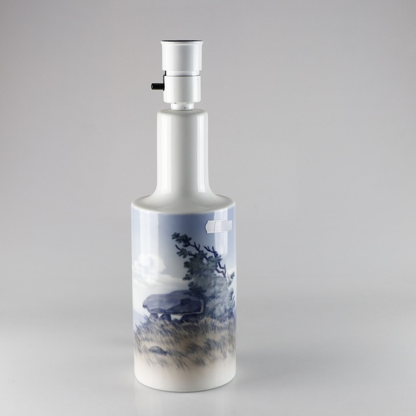 Lampefoden i hvid porcelæn med gradueret blåtonet baggrund dekoreret med en stendysse