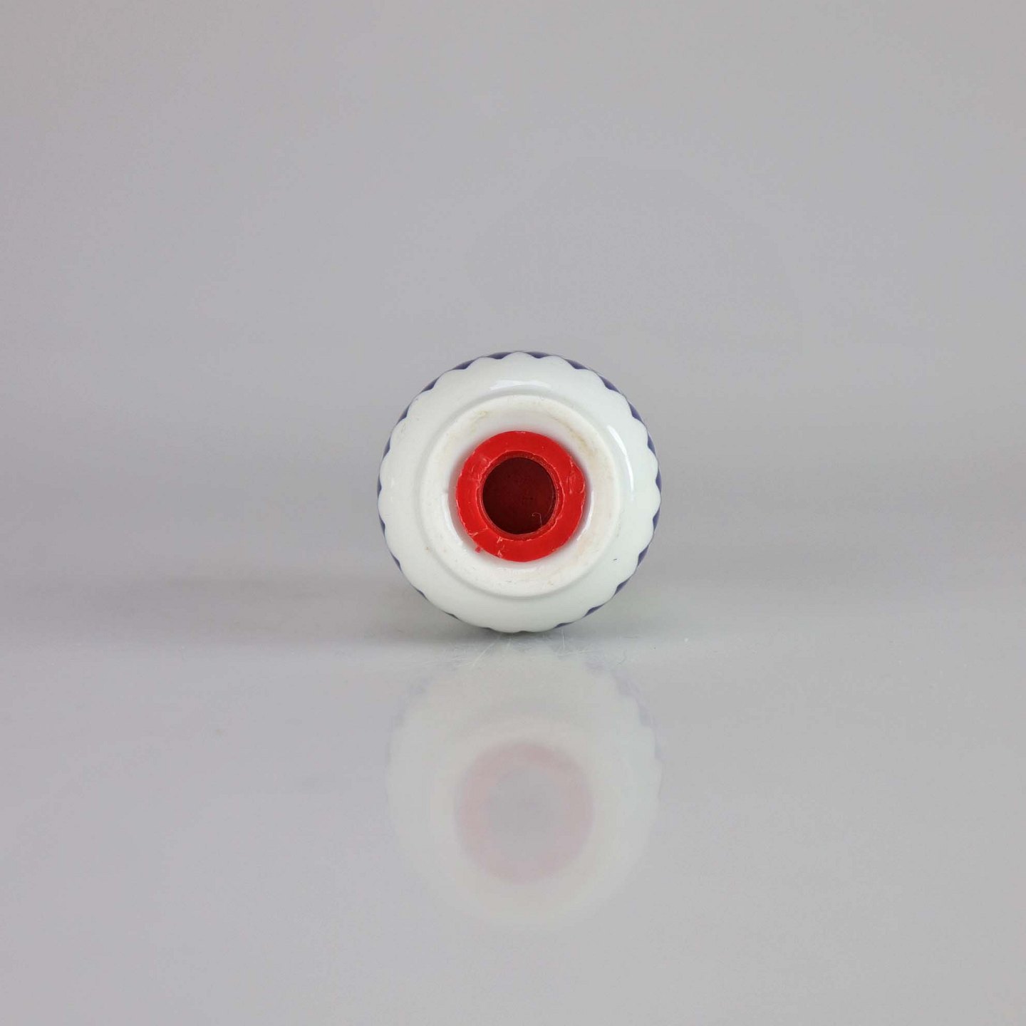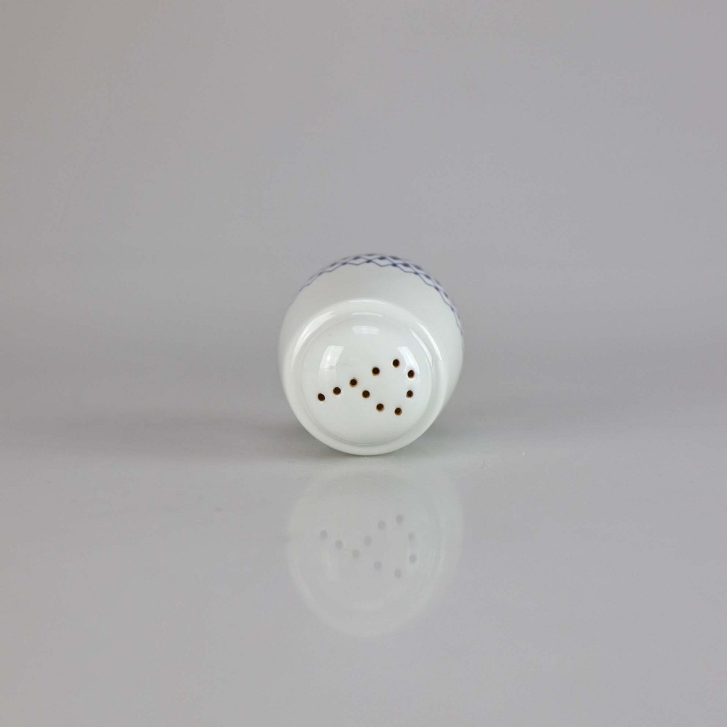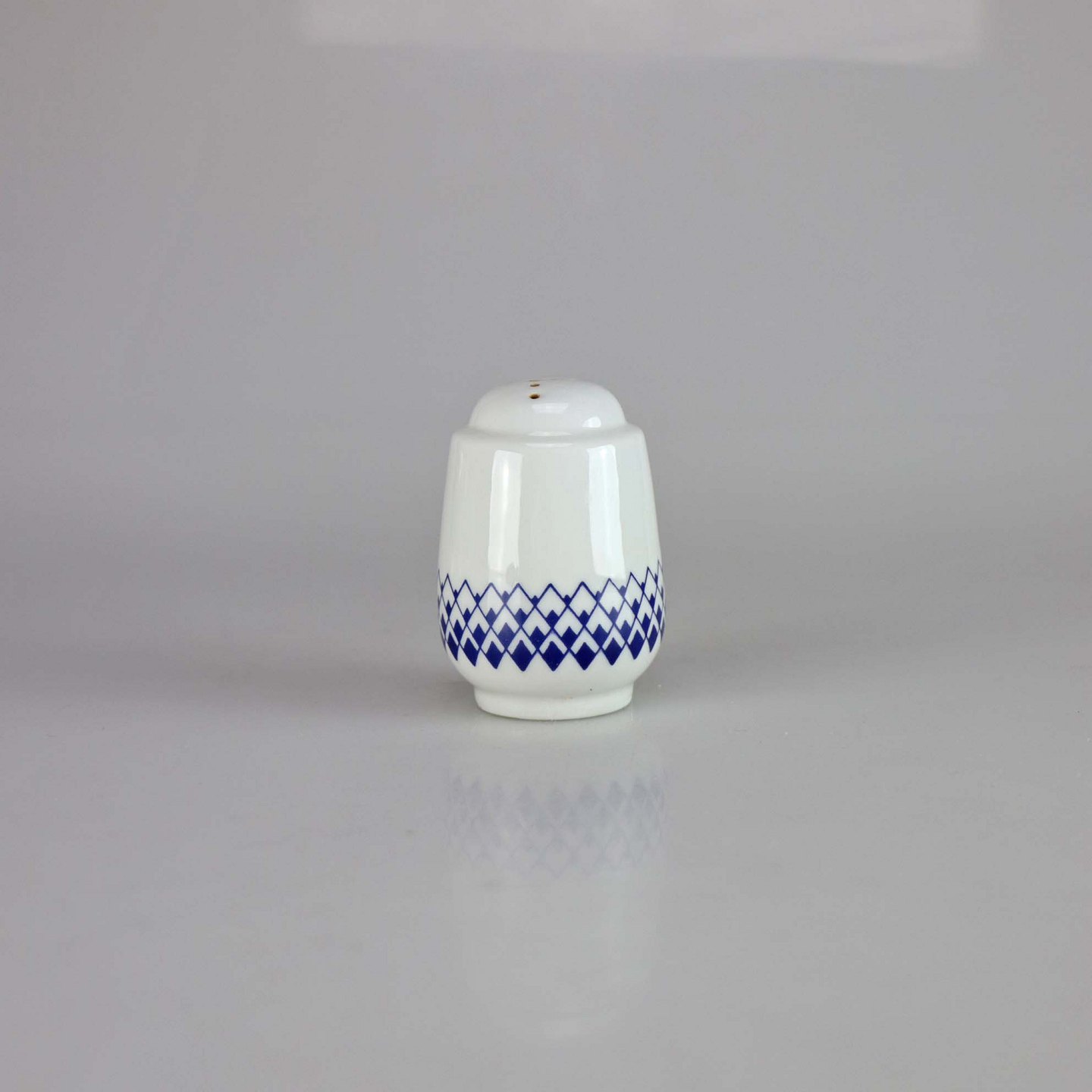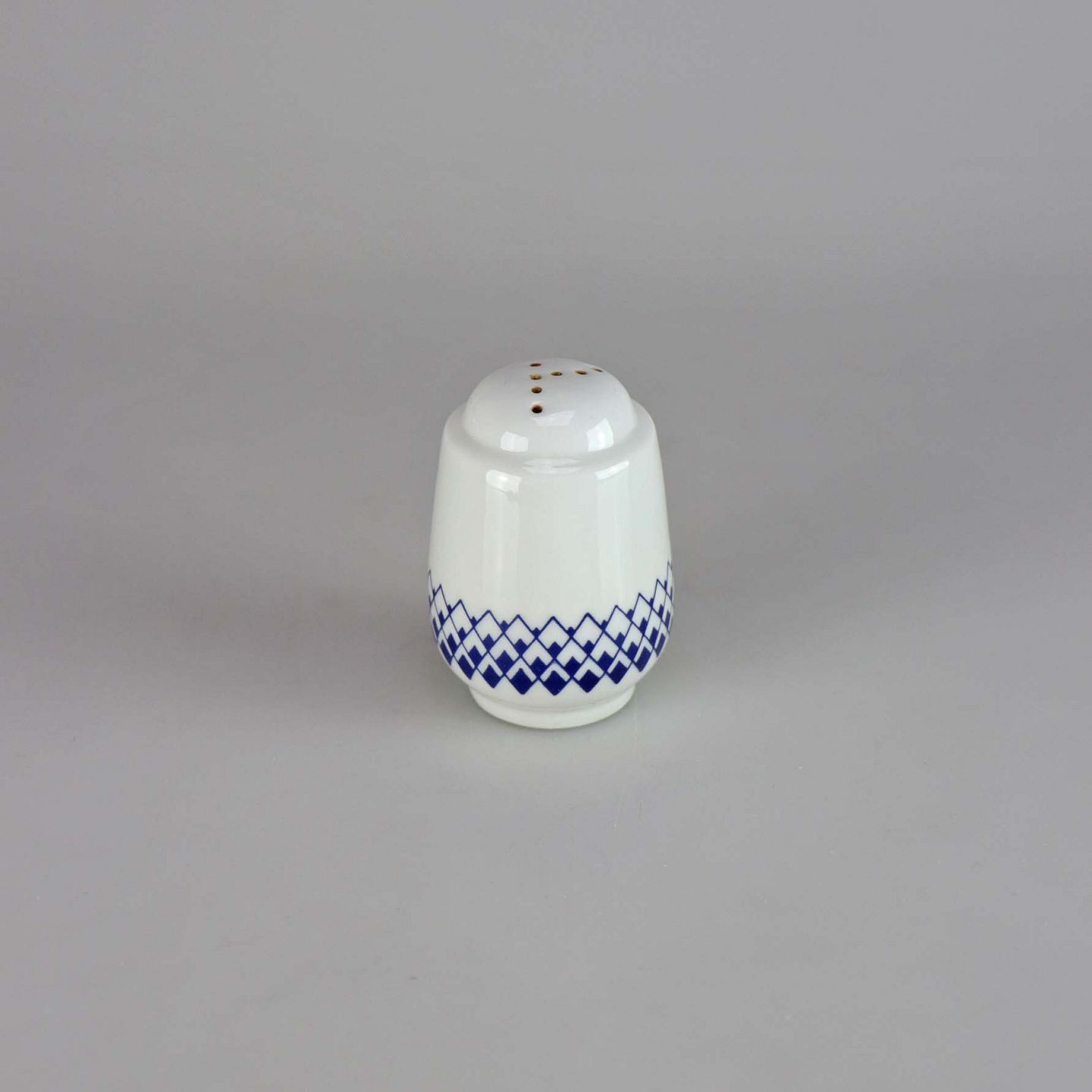 Glat hvidt porcelæn med mørkeblå rombe dekoration