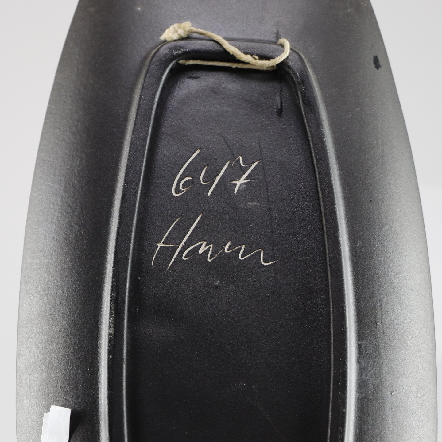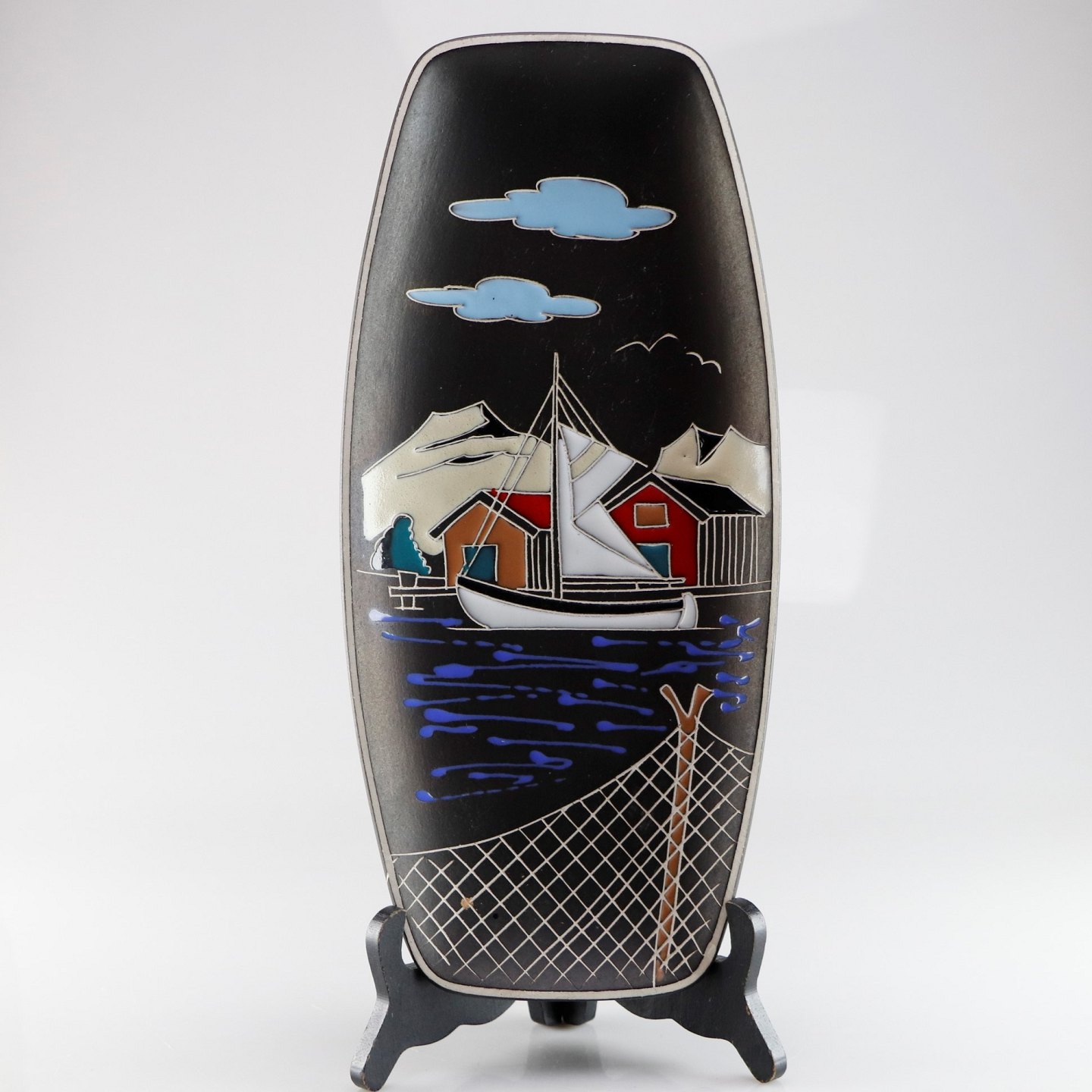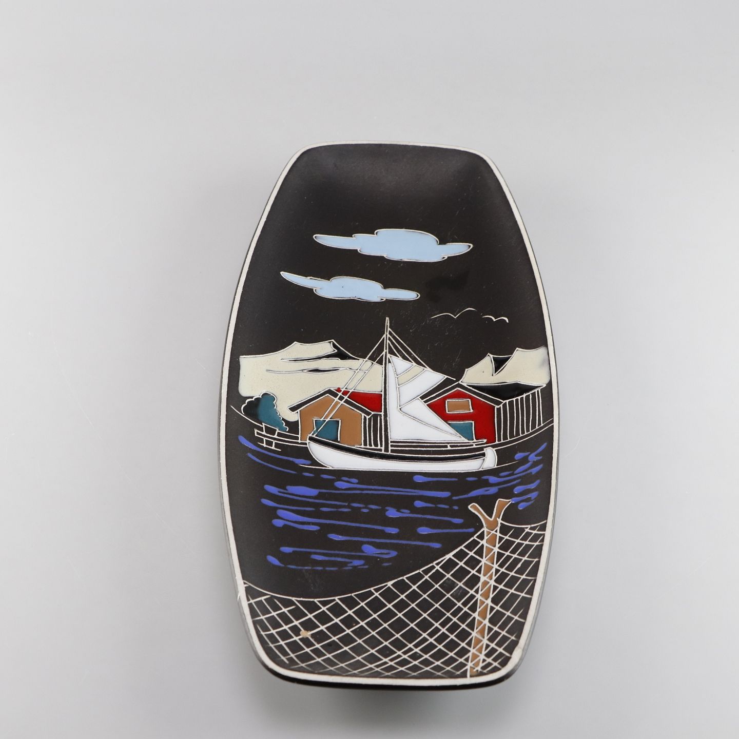 Keramiktallerken med farvet motiv af et skib, bygninger og fiskenet