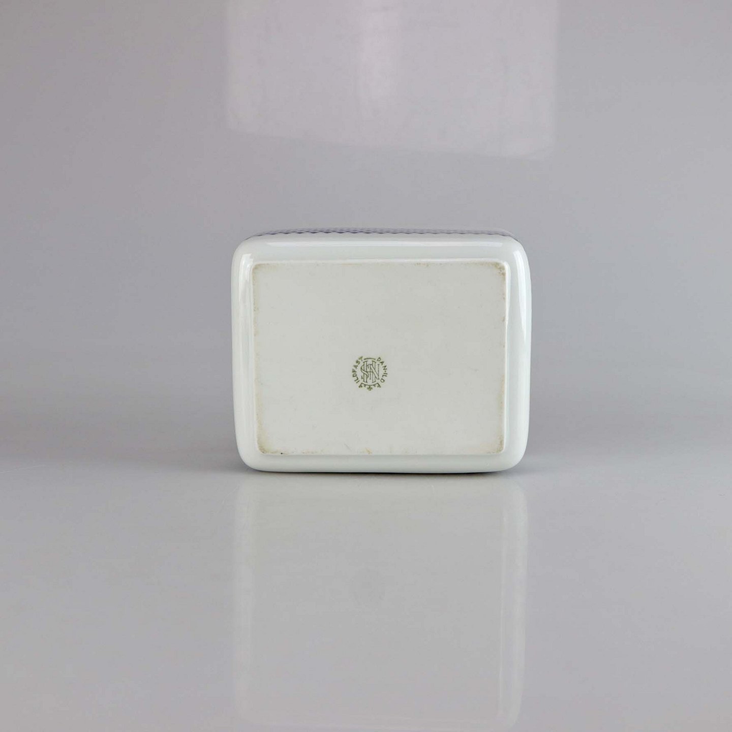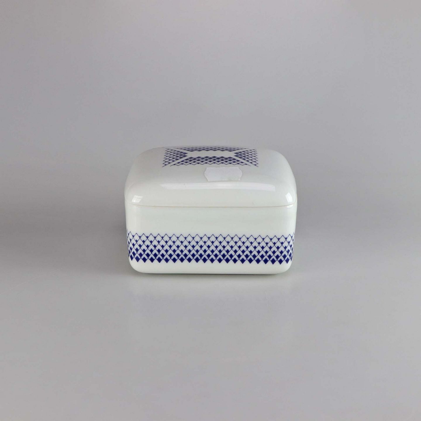 Glat hvidt porcelæn med dekoration af mørkeblå romber