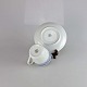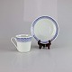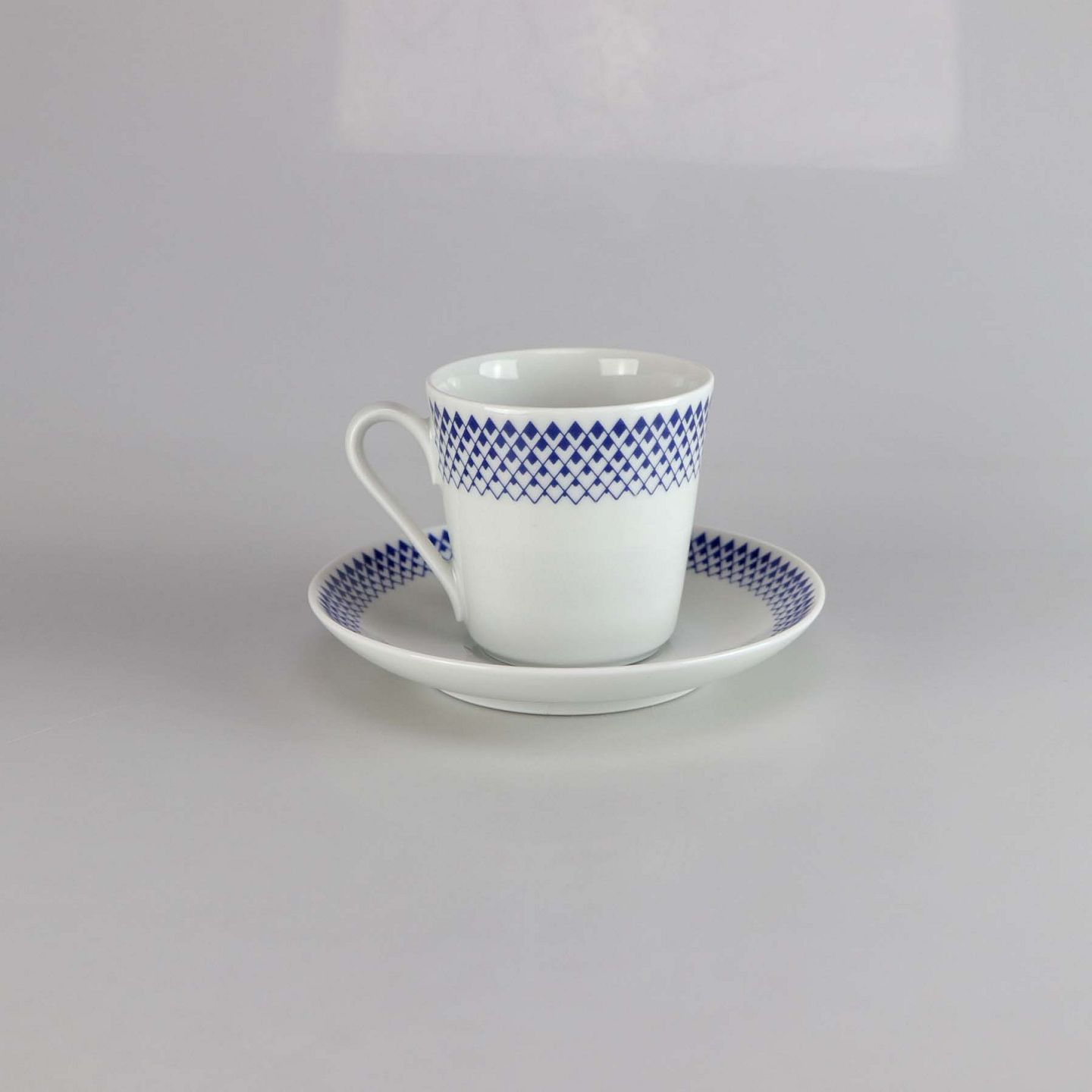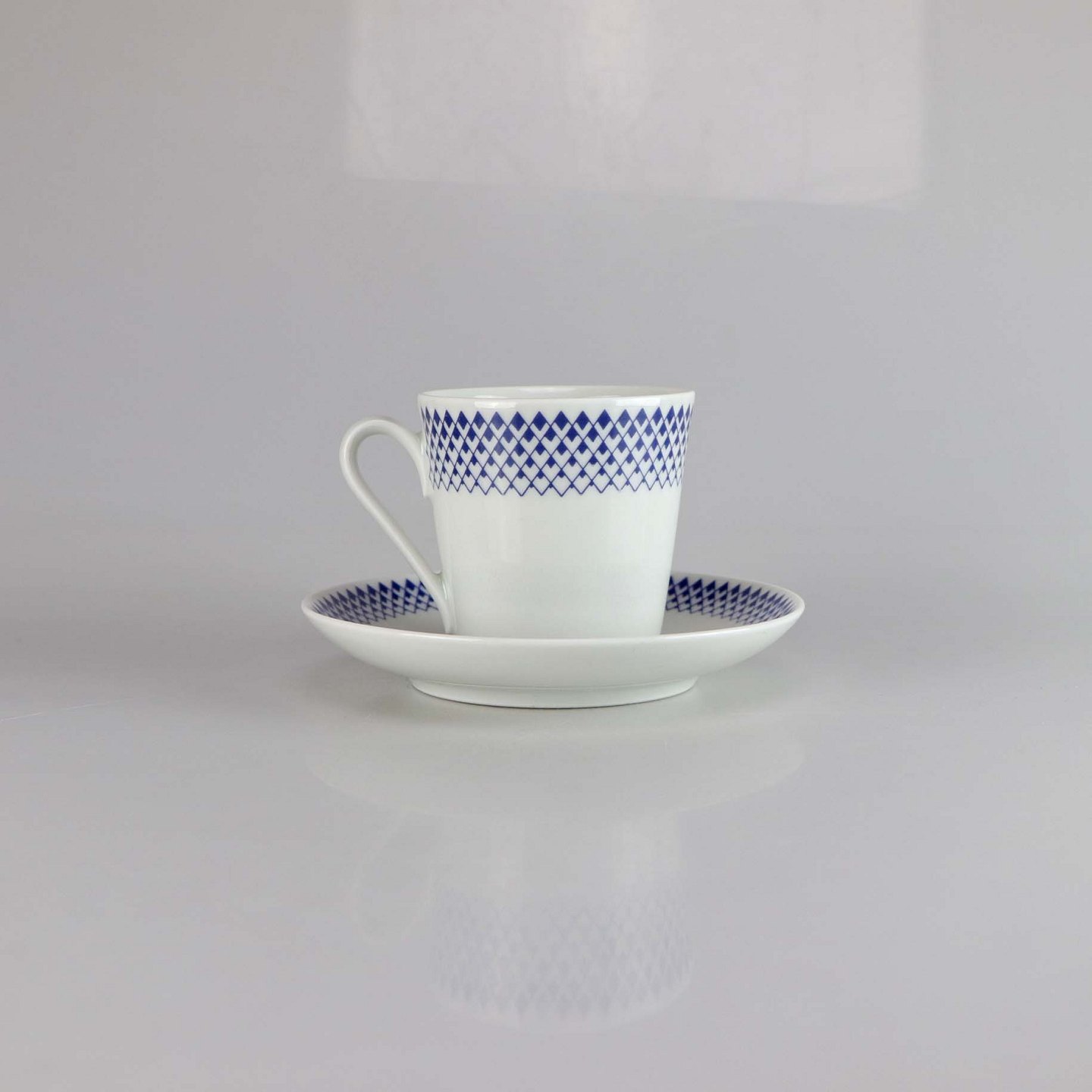 Glat hvidt porcelæn med dekoration af mørkeblå romber