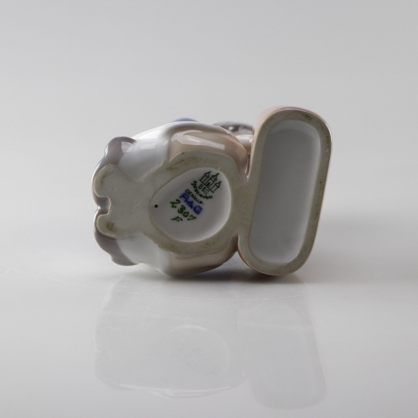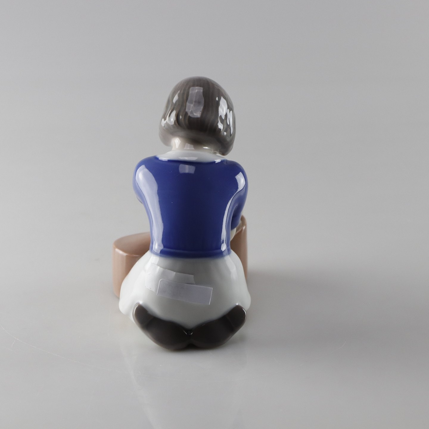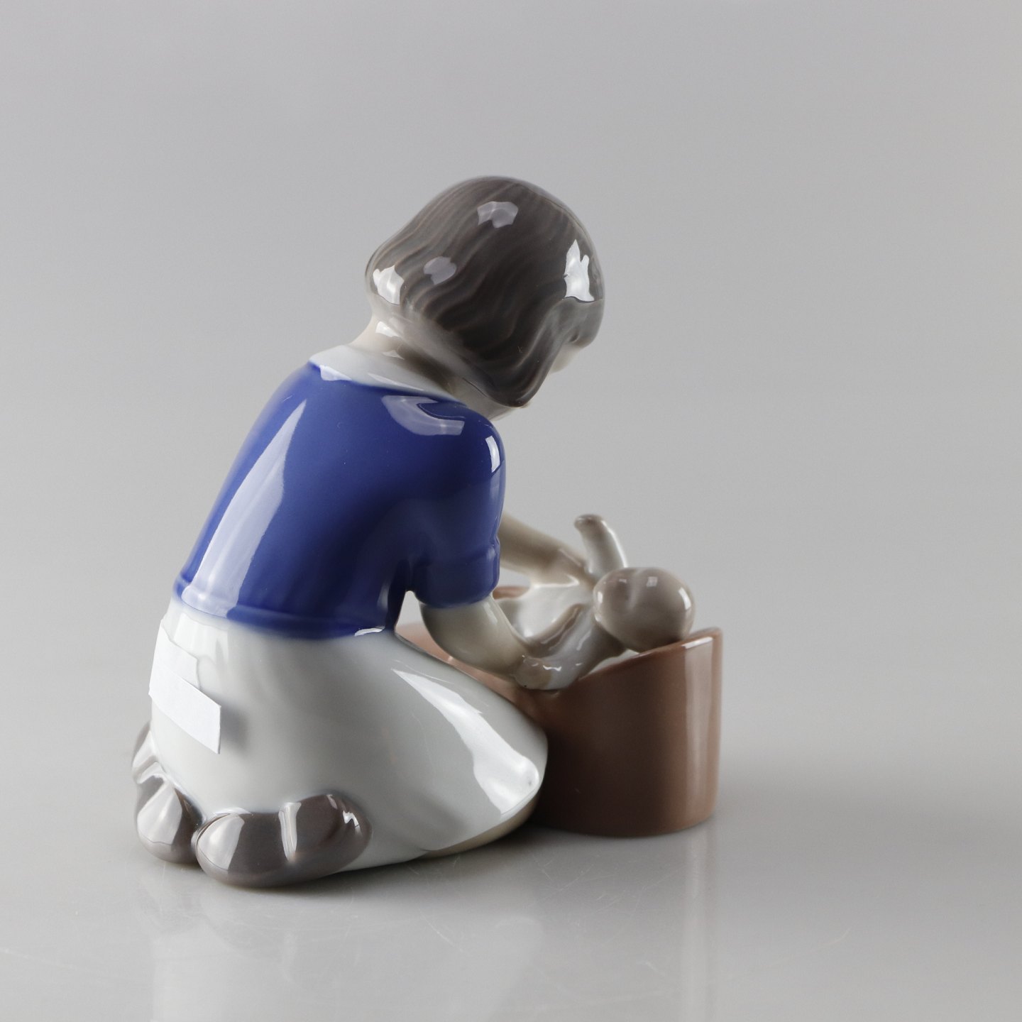 Figur af porcelæn som forestiller en kvinde som tager et barn op af en lift