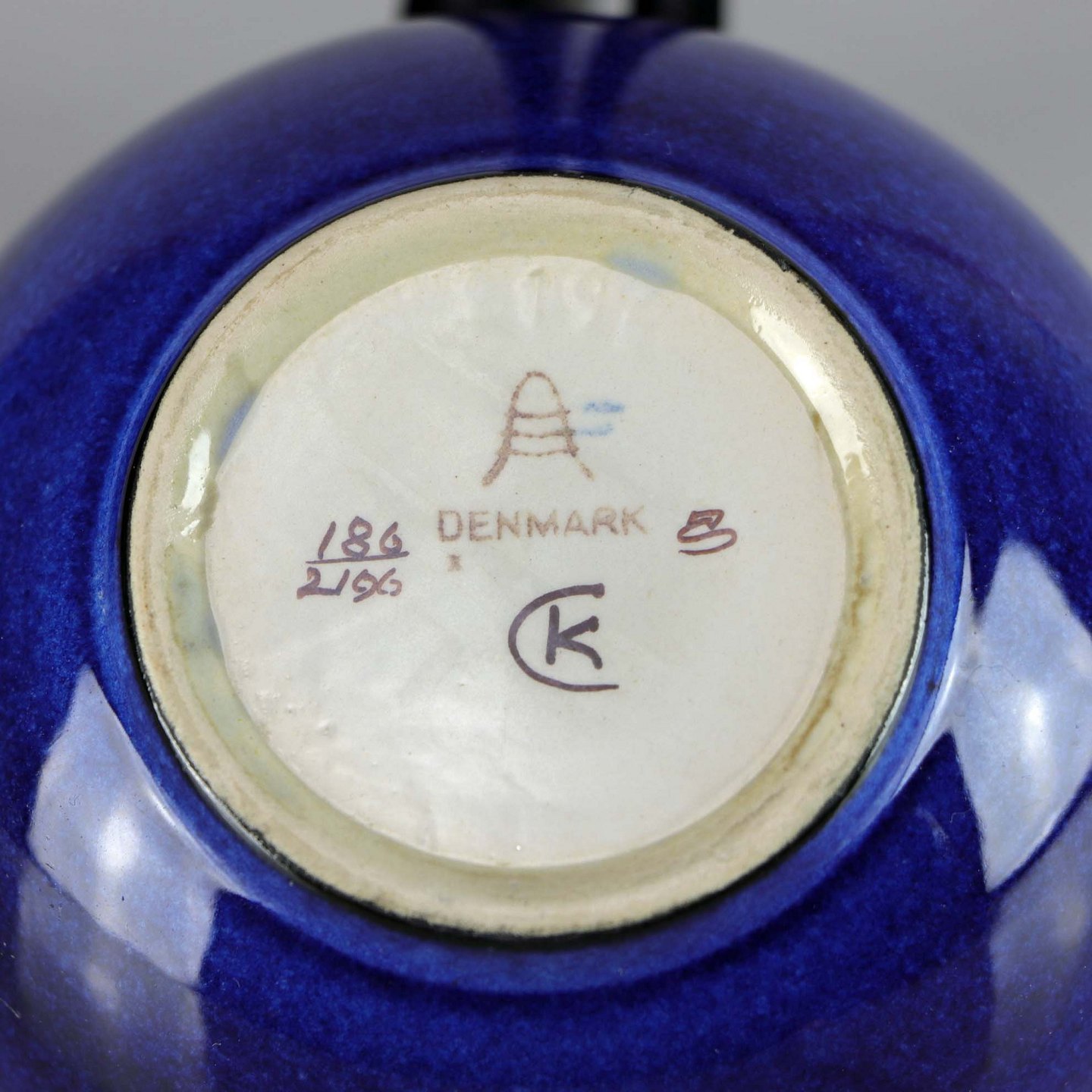 Skålen er signeret CK og er af kunstfajance med blå farve udenpå og med blomstermotiv indeni
