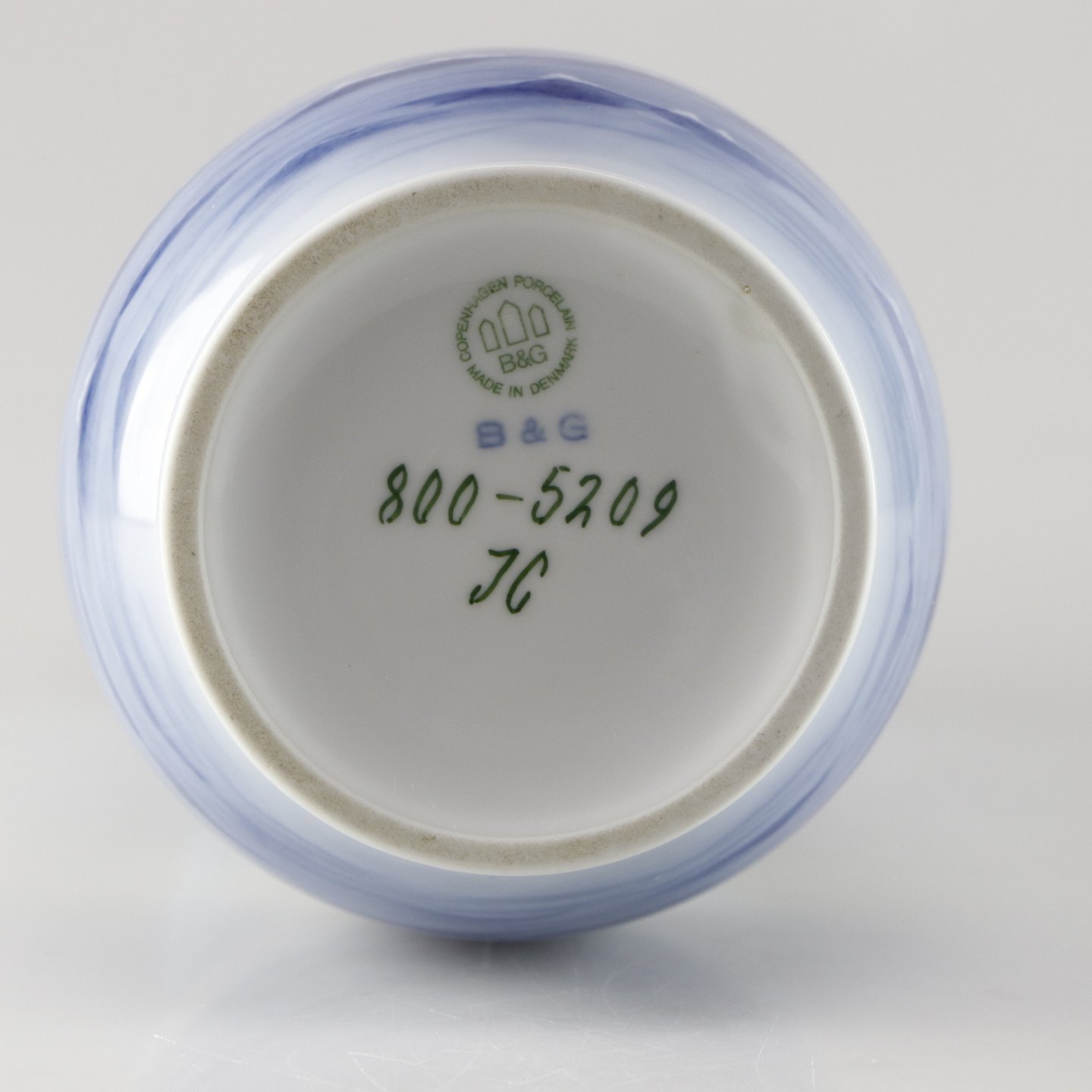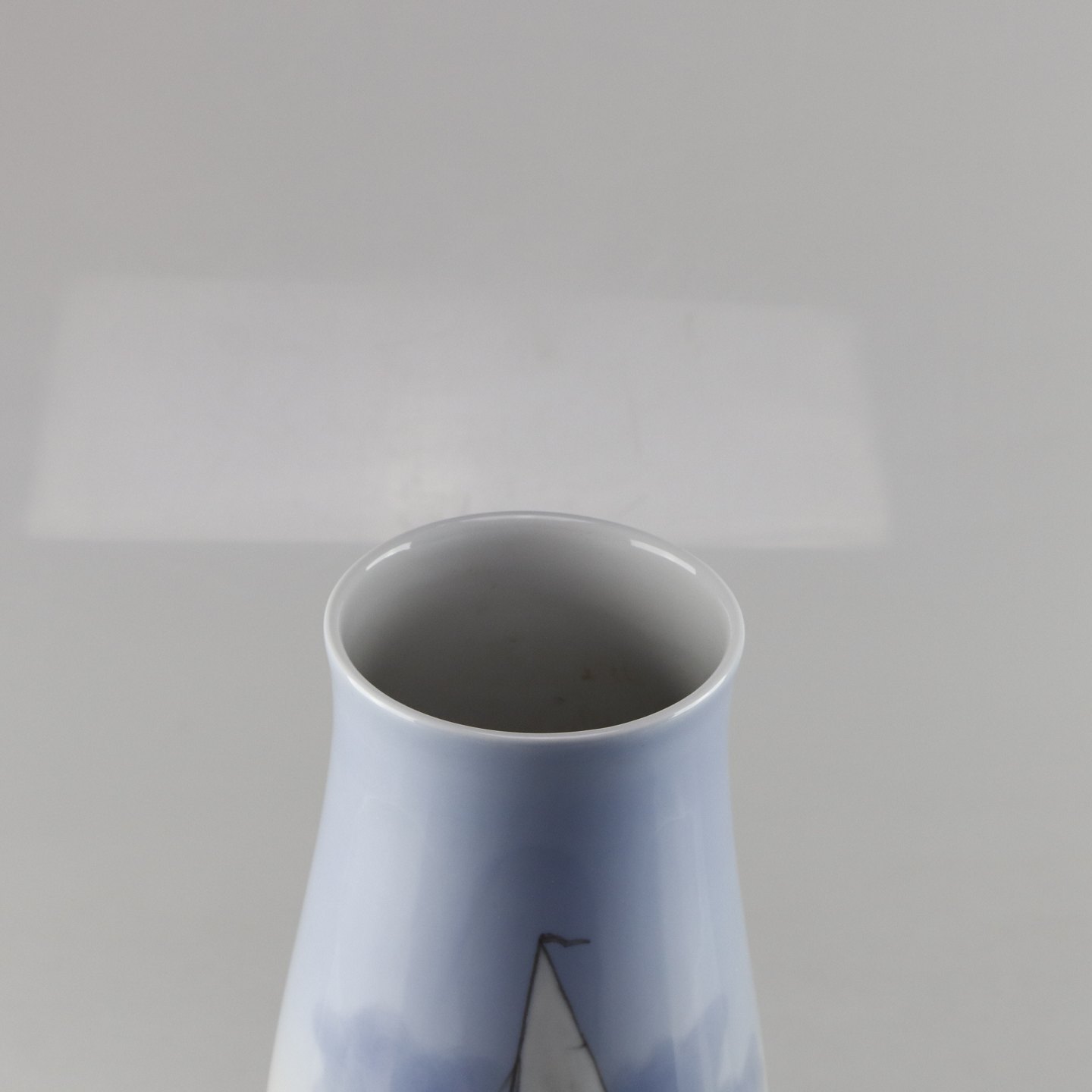 Vase i blå og hvide farver med motiv af sejlbåd på havet
