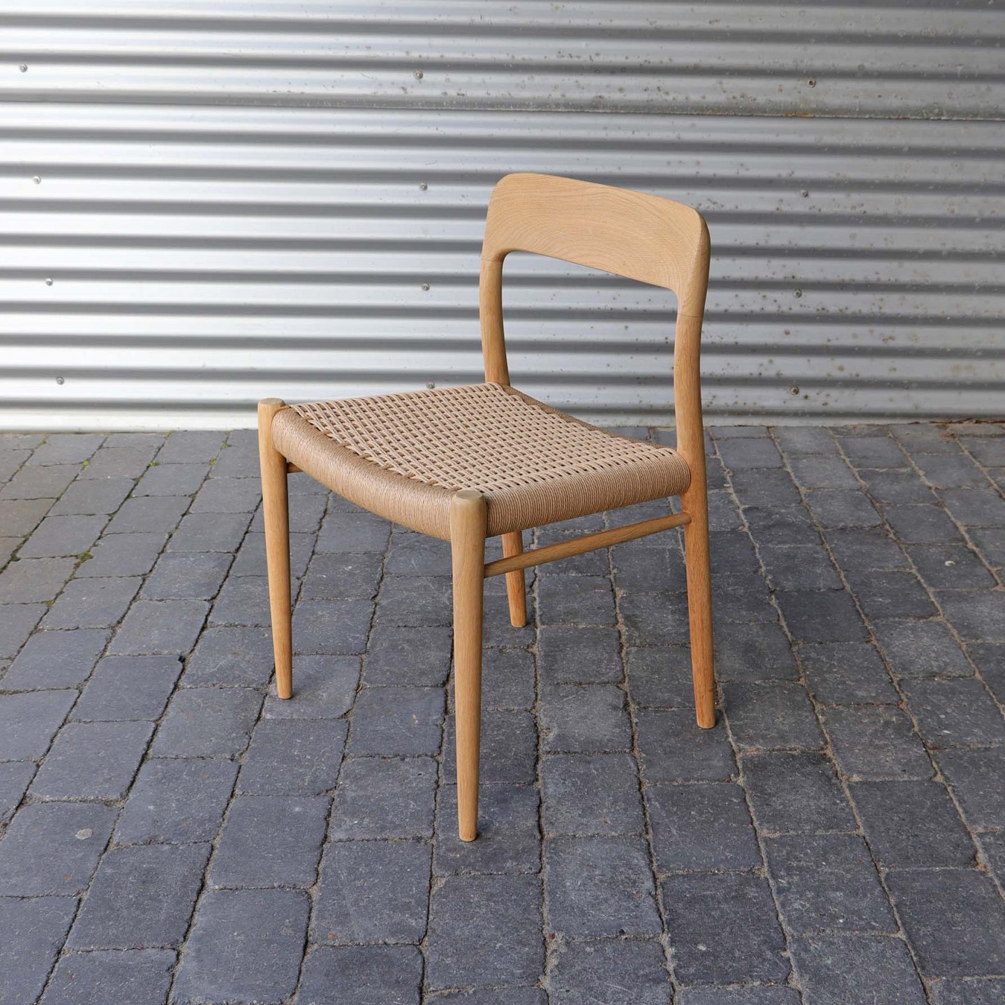 Et styk spisebordsstole model 75 i sæbehandlet eg med nye sæder i papirgarnsflet