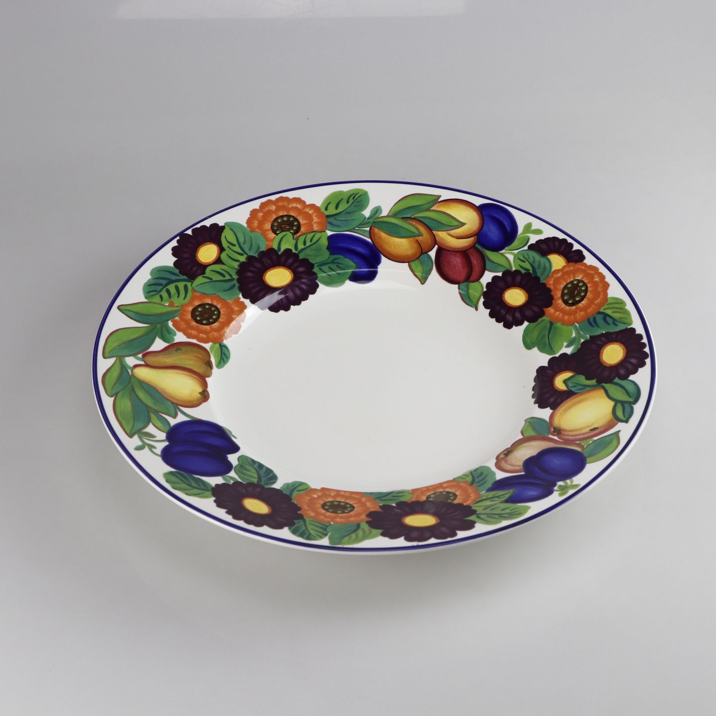 Serveringsfad i glat hvidt porcelæn med blå kant og dekoreret med sommerblomster og frugter.