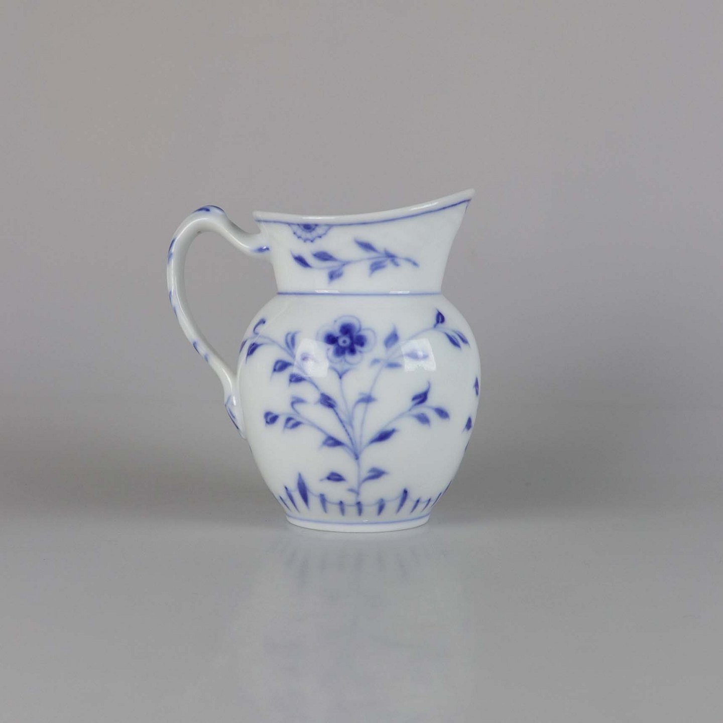 Mælkekande i hvidt skælformet porcelæn med blå motiver af blomster og sommerfugle.