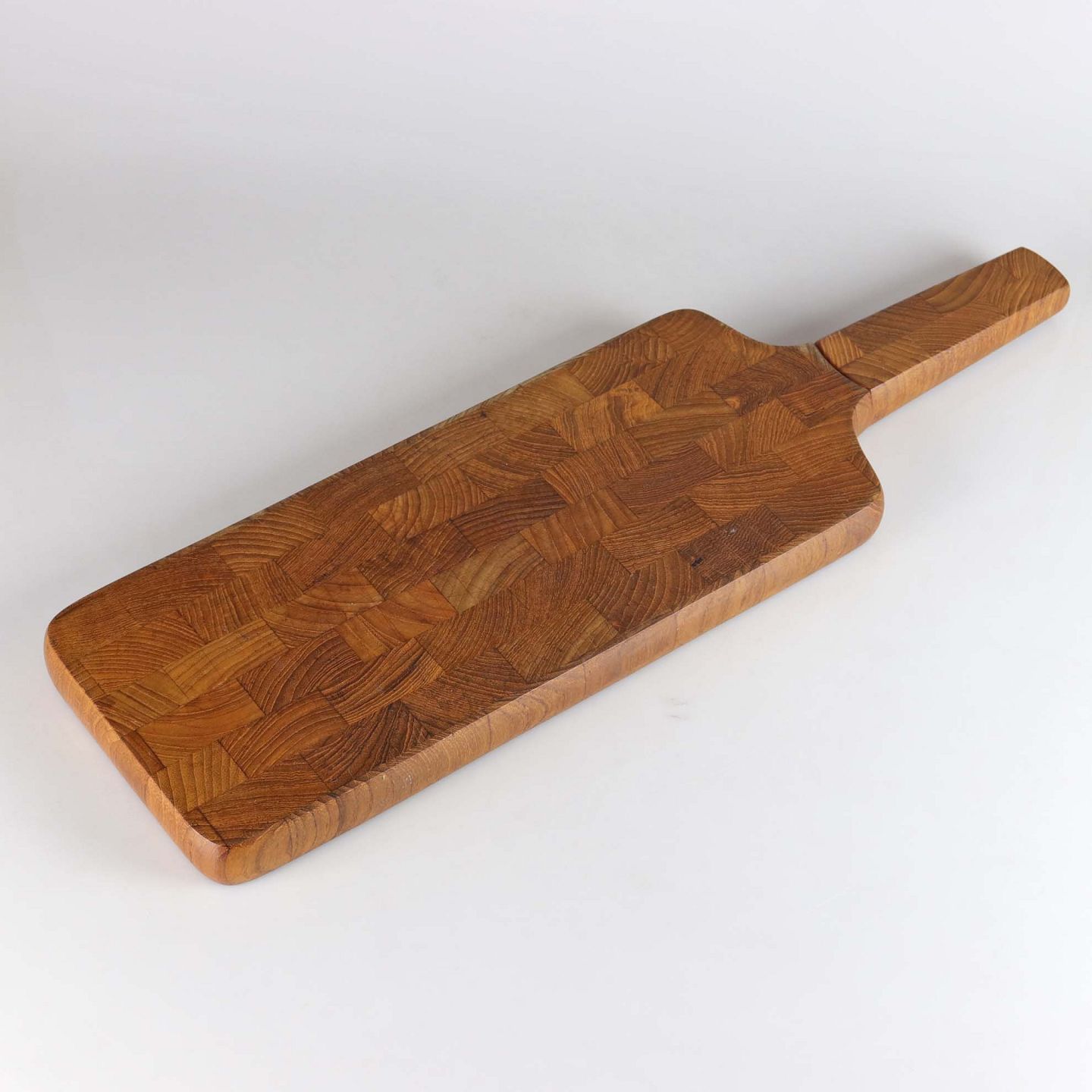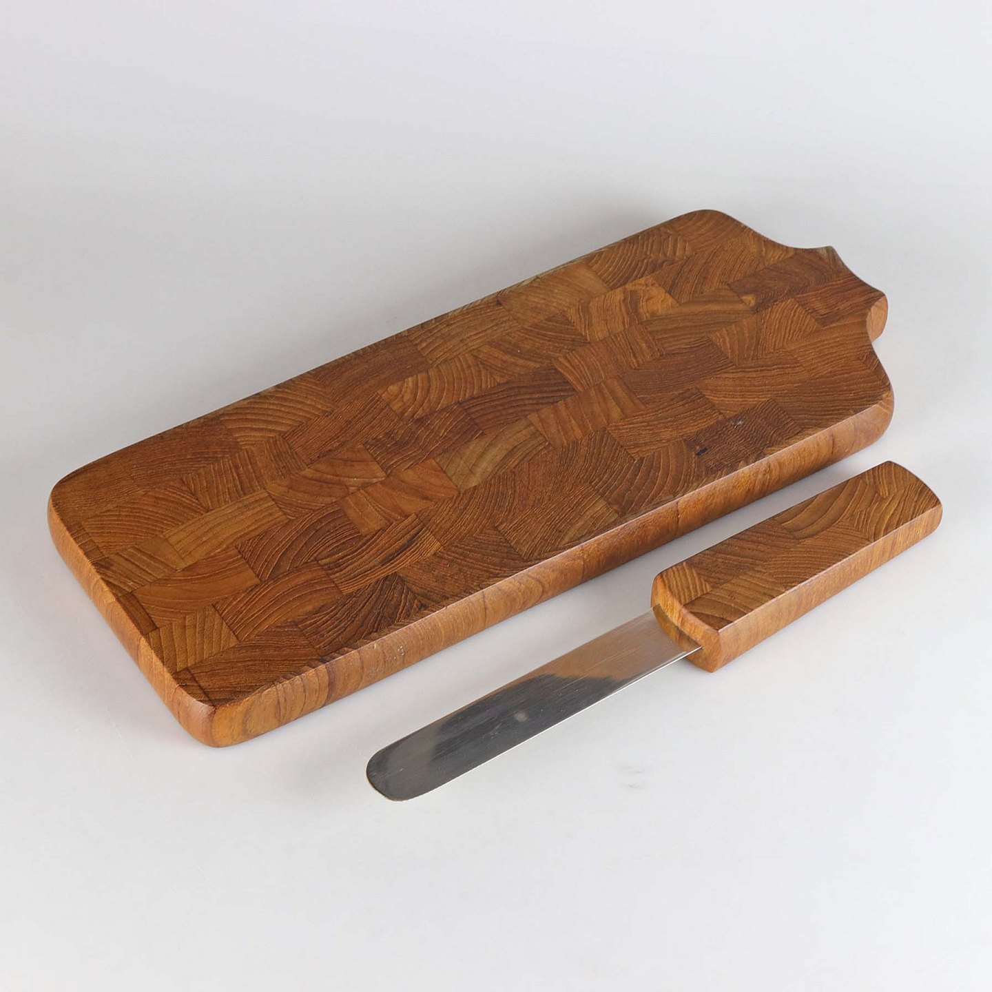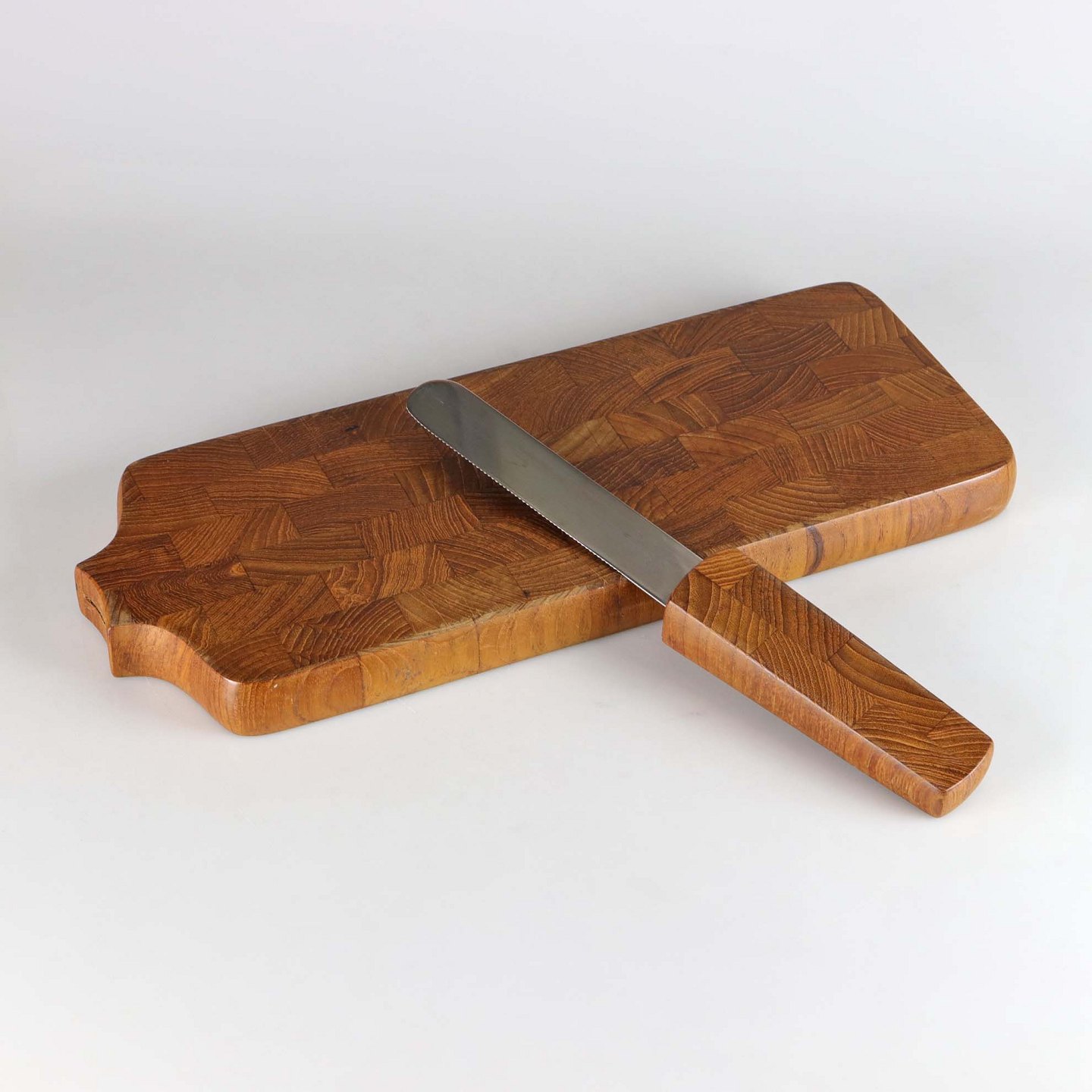 Aflangt skærebræt i teaktræ med indbygget brødkniv