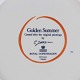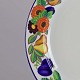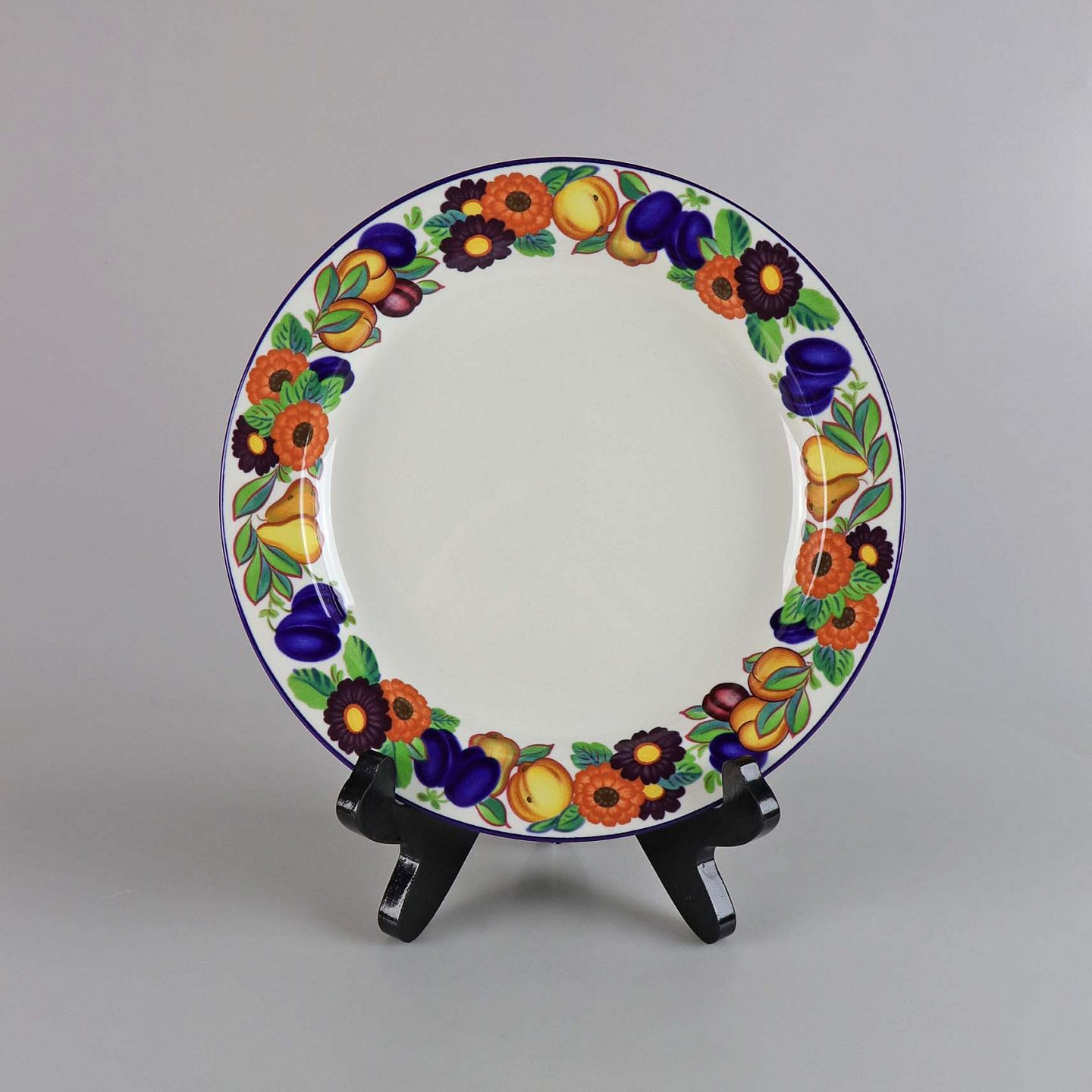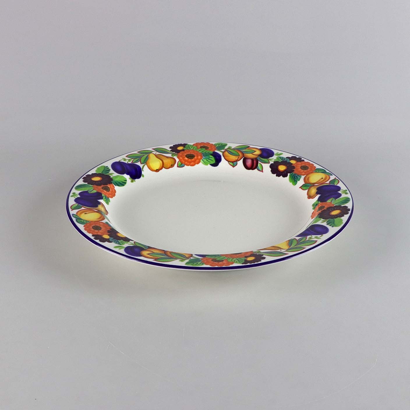 Tallerken i glat hvidt porcelæn med blå kant og dekoreret med sommerblomster og frugter.