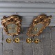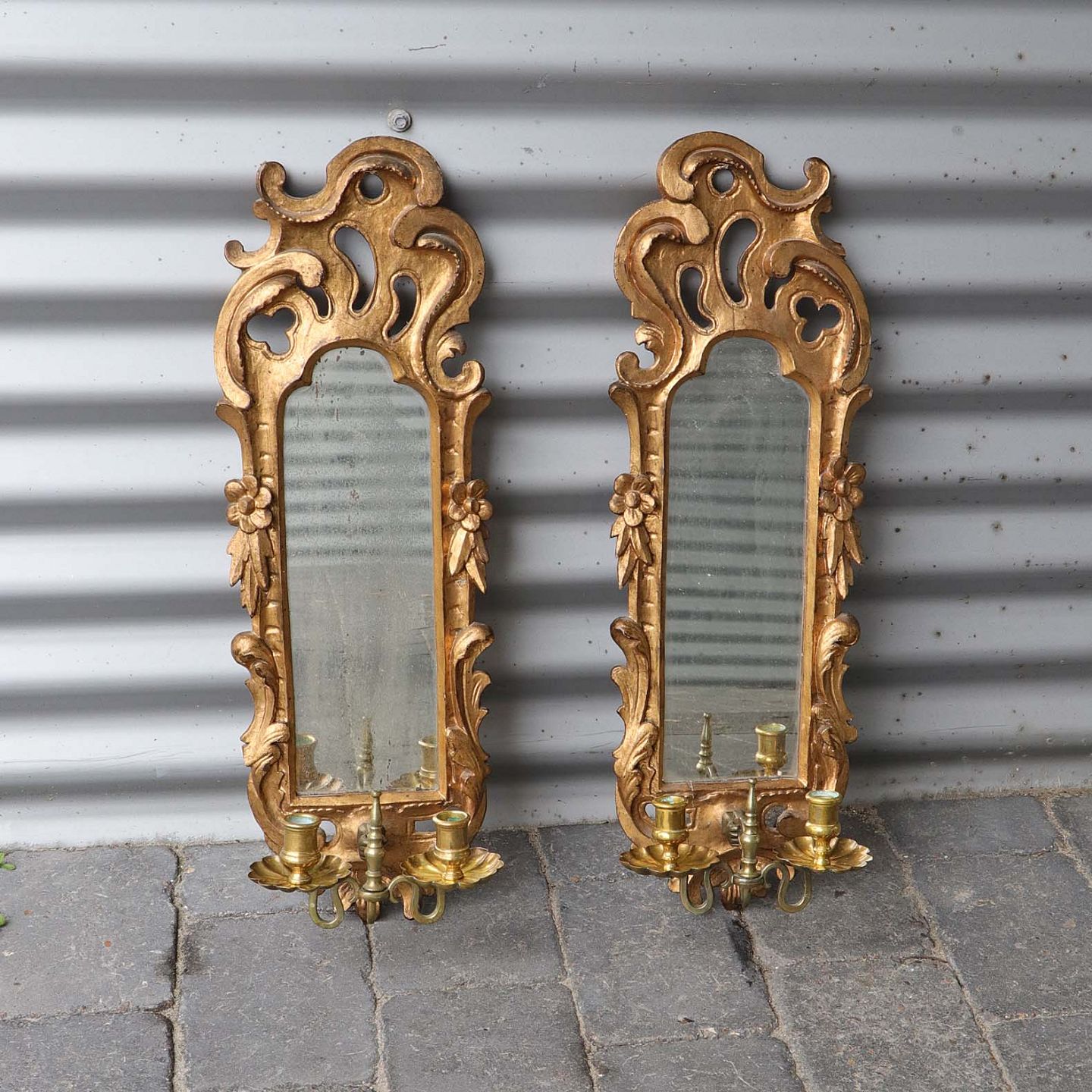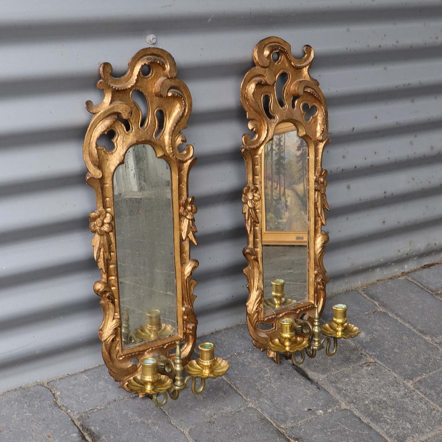 Et sæt antikke lysestager med spejl til ophæng på væg.