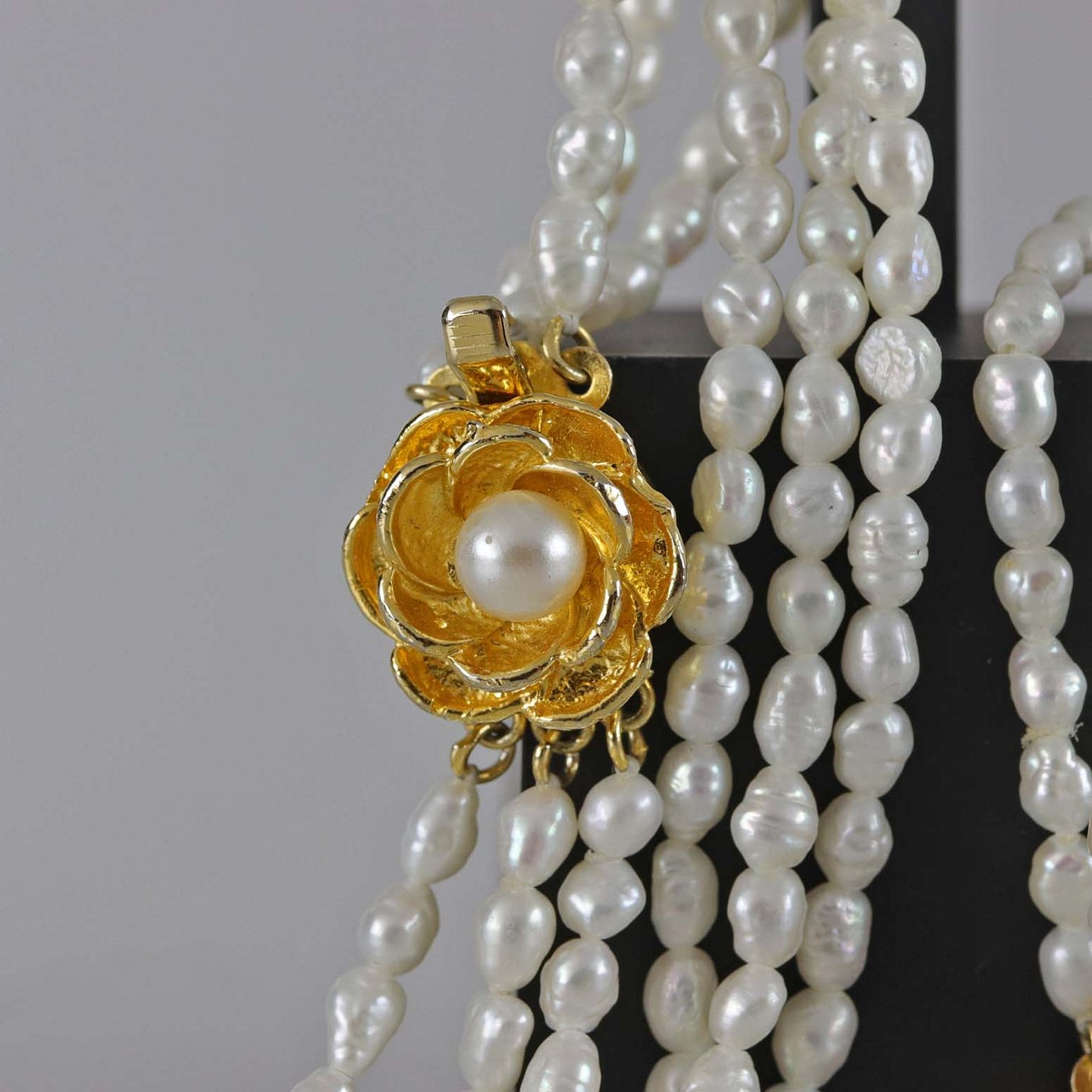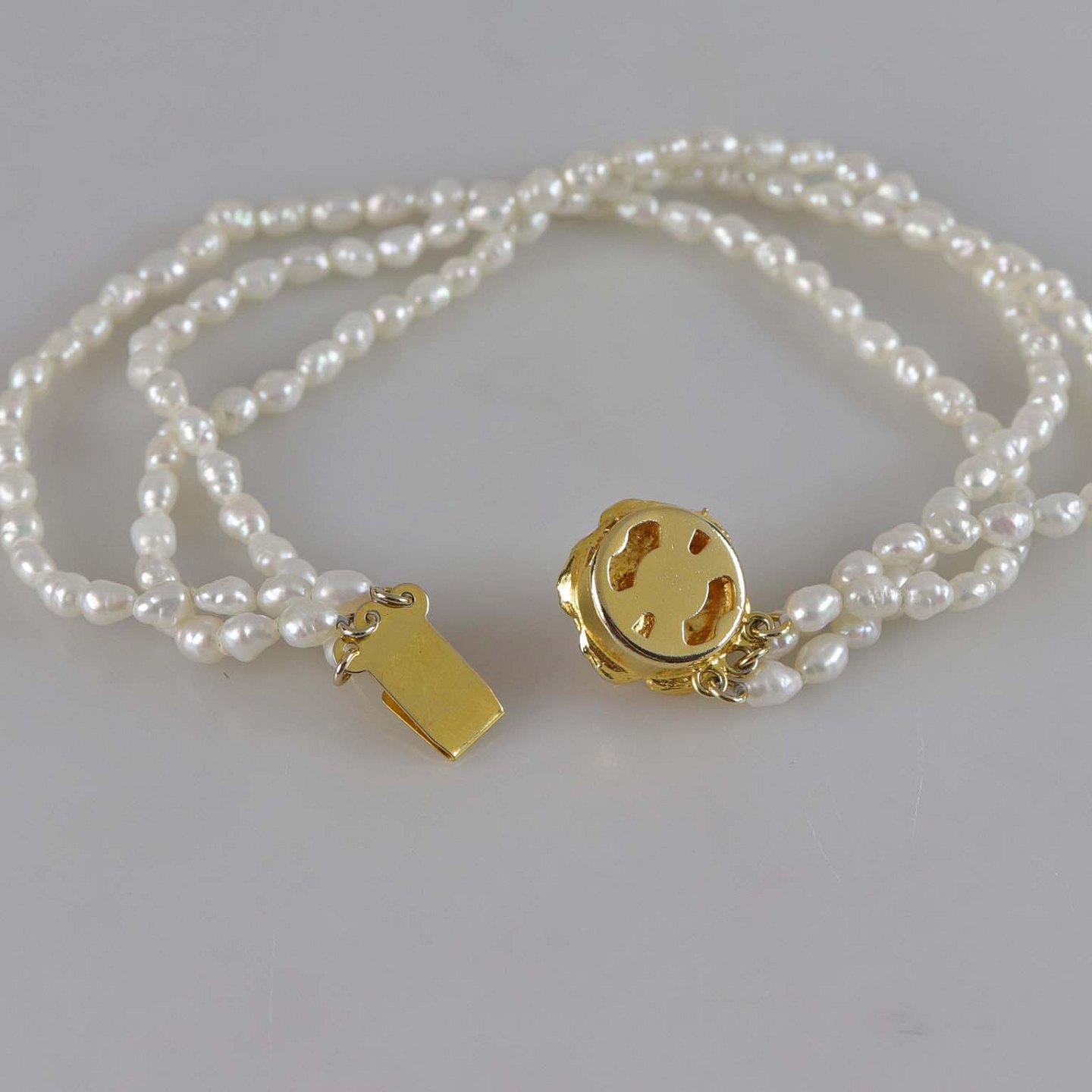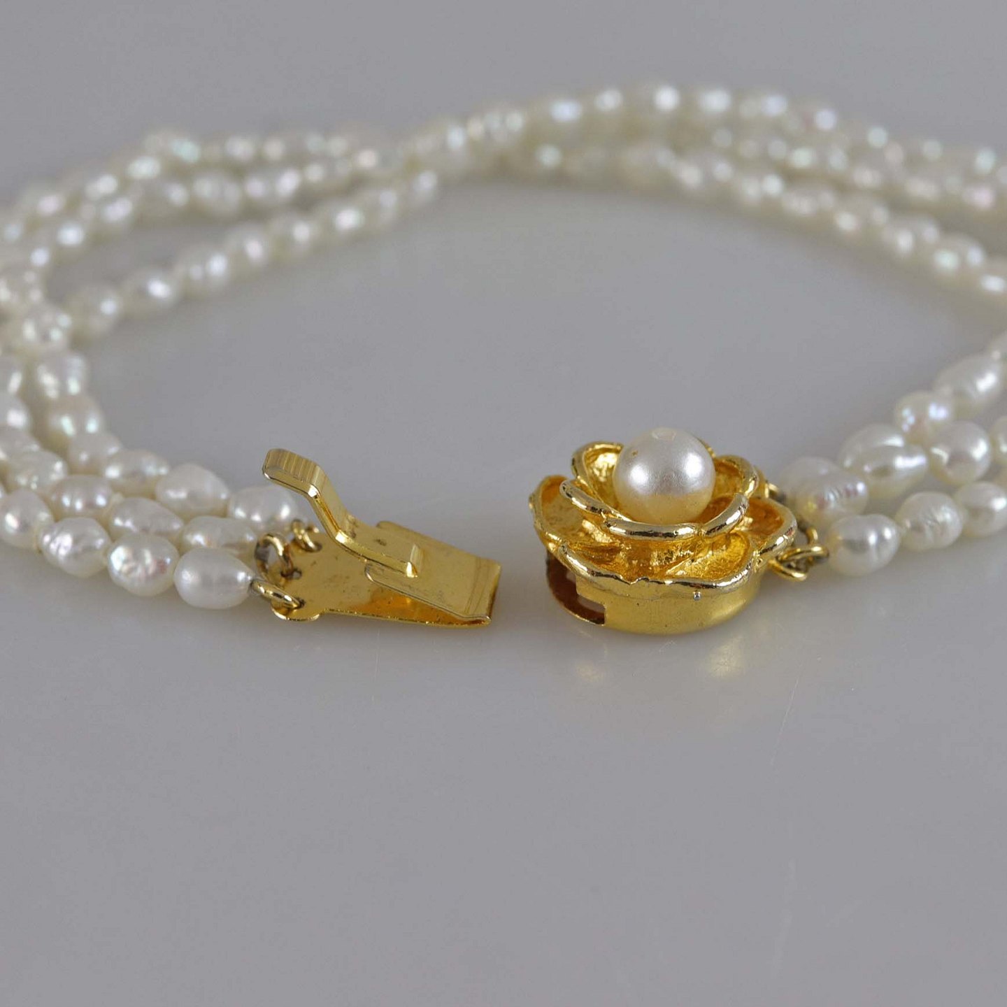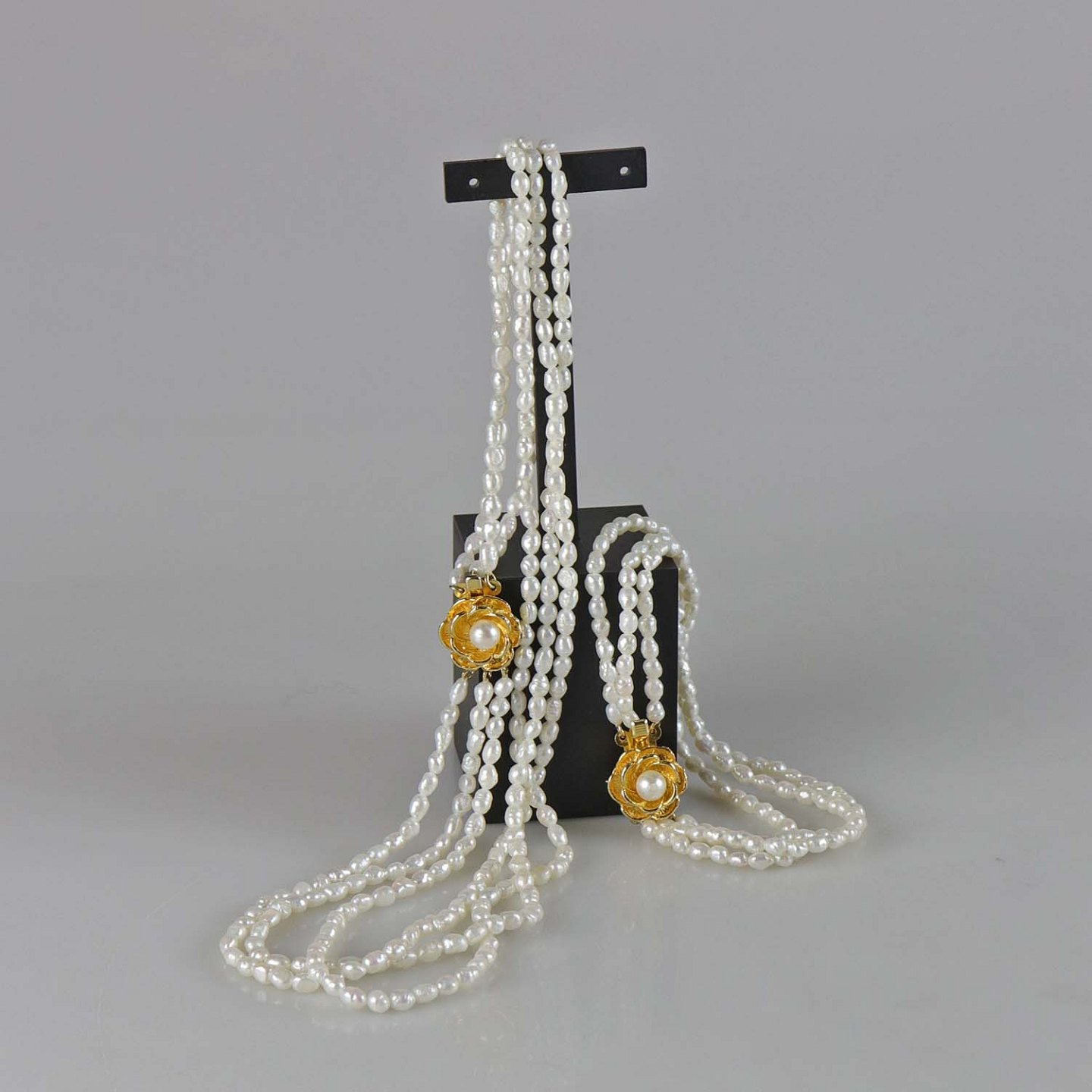 3-radet perlekæde og armbånd med gyldne roser som lås