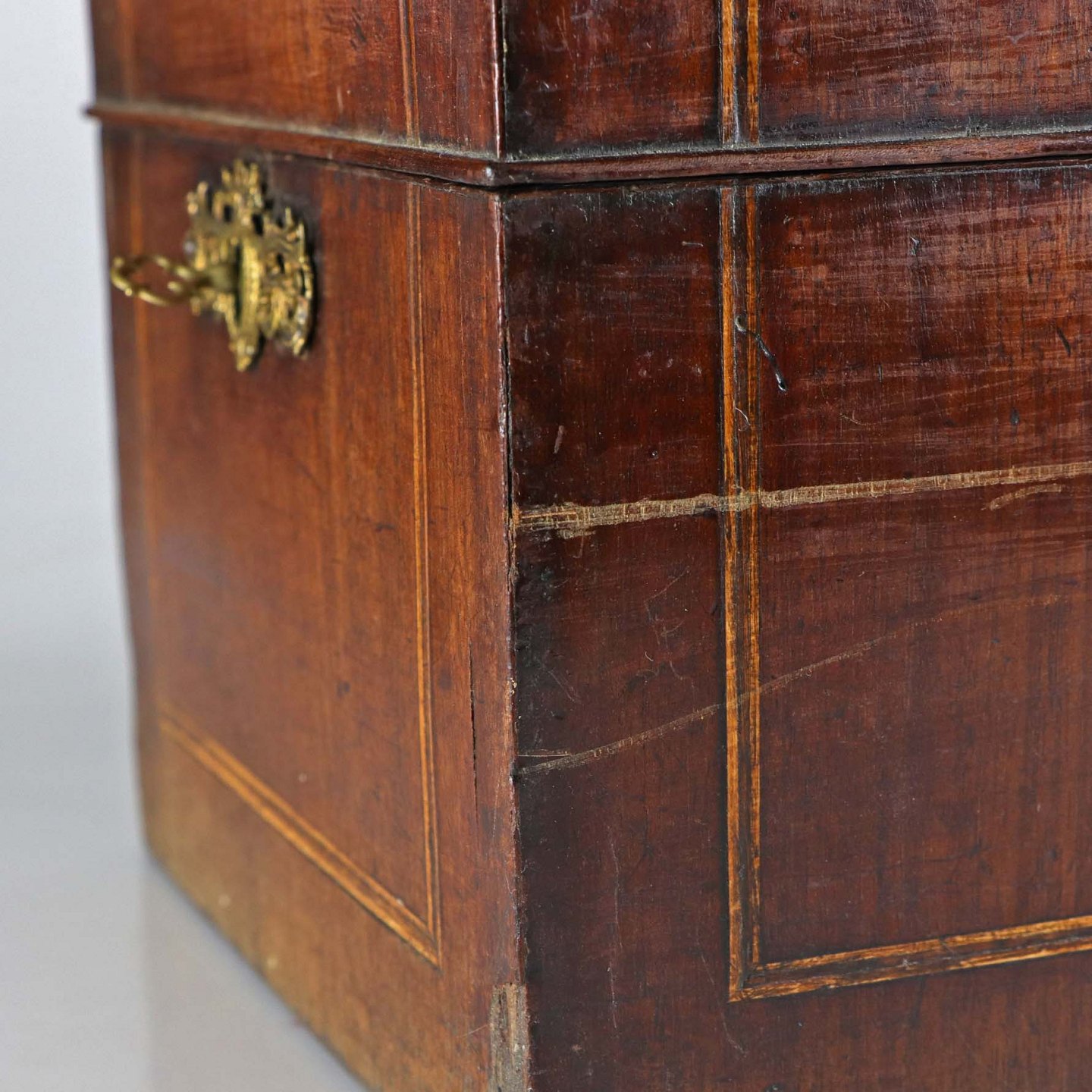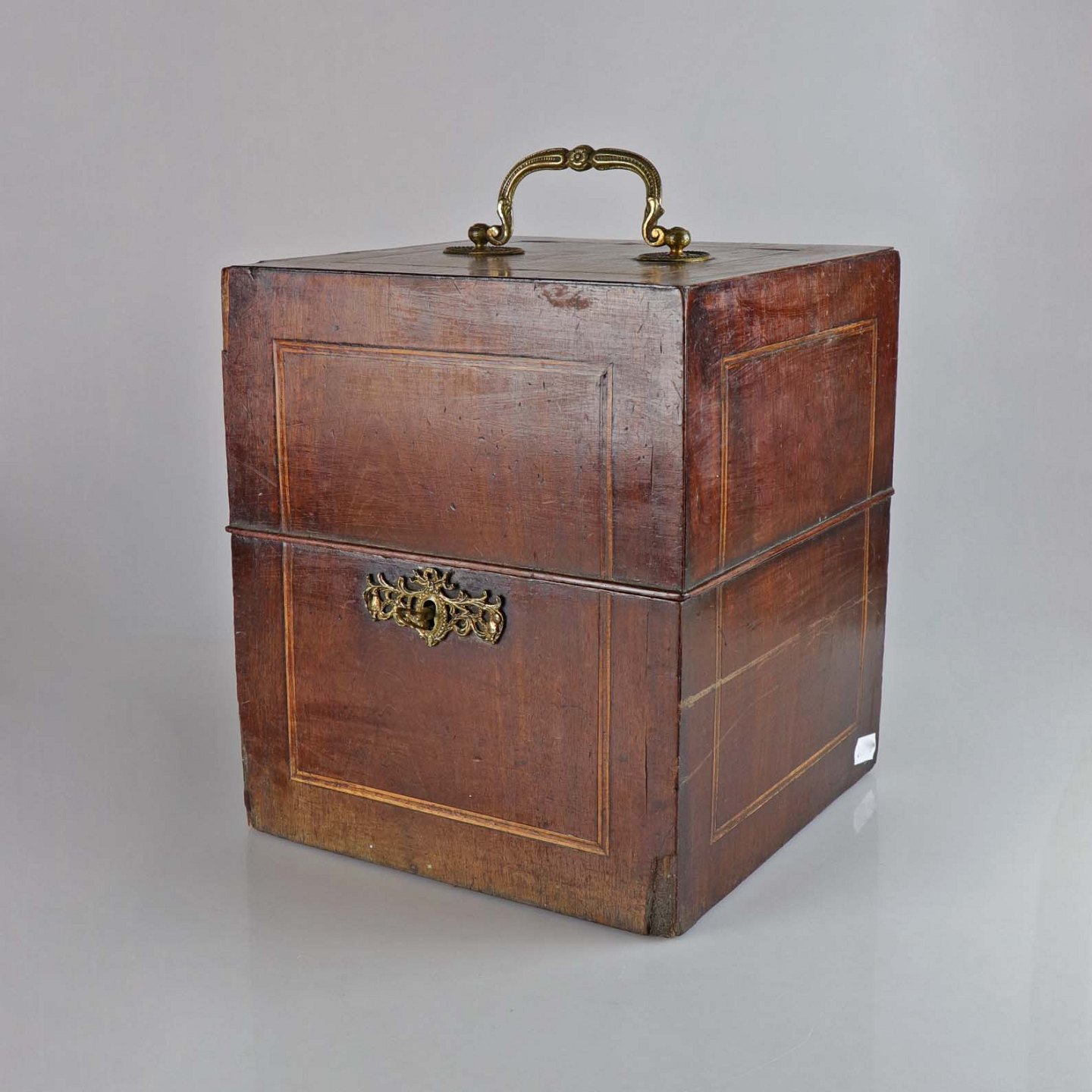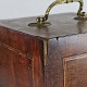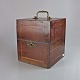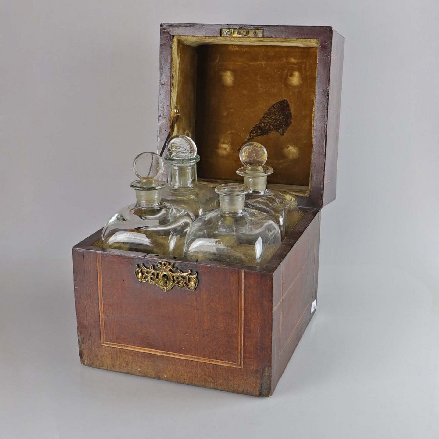 Tantalus med plads til 4 karafler. Skrinet er af lakeret træ med messing håndtag og lås og er foret med stof