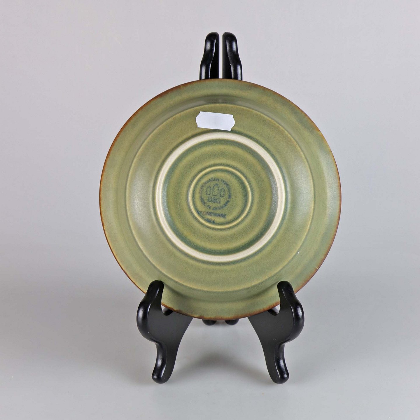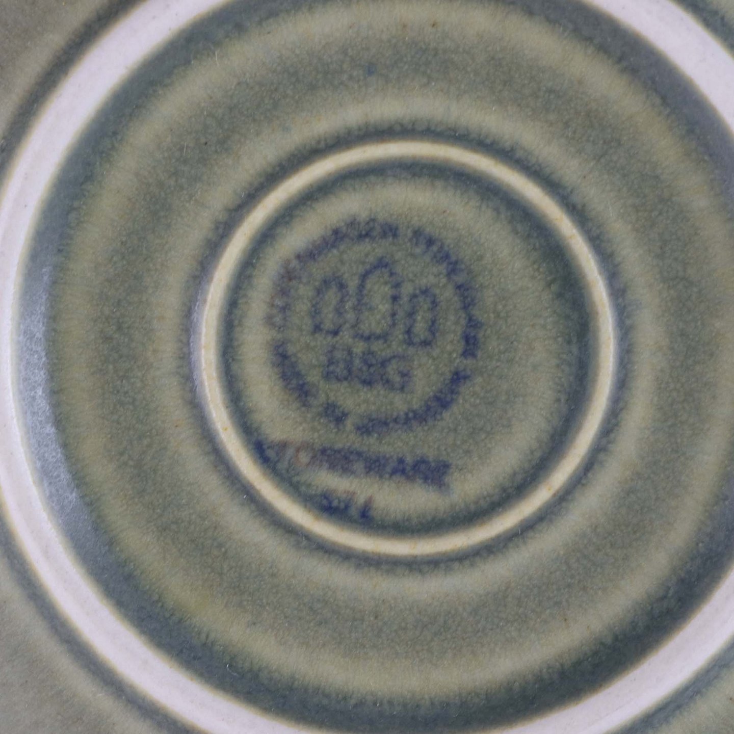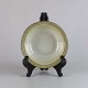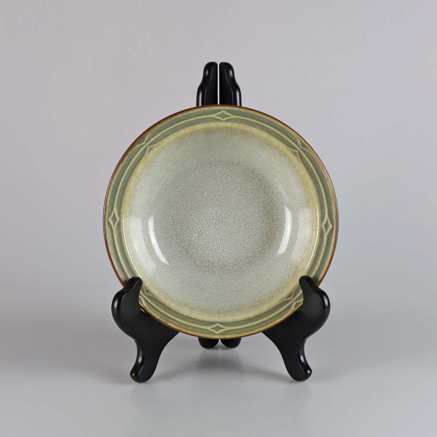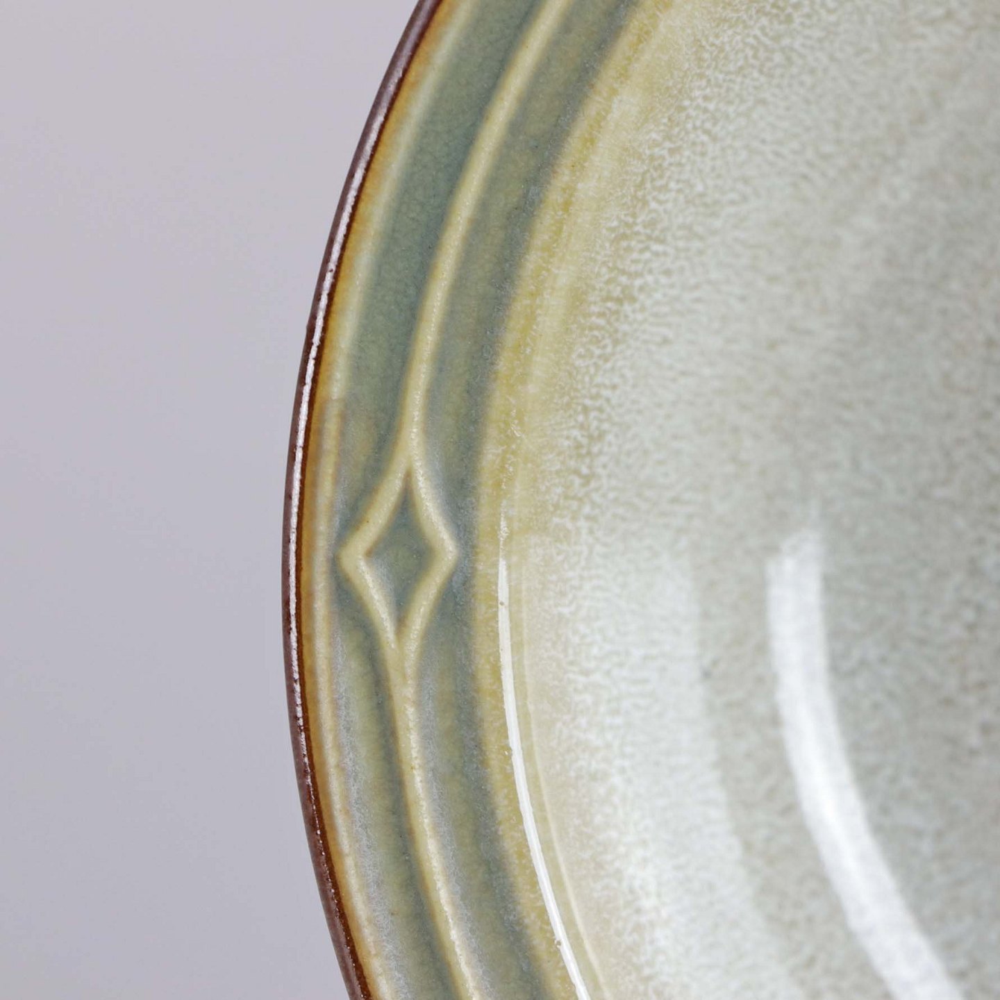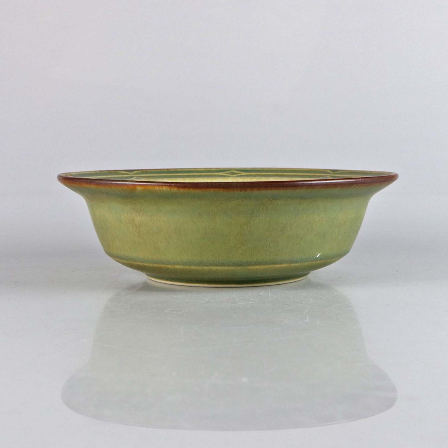 Stellet er glaseret i grønne og råhvide farver med en brun kant.