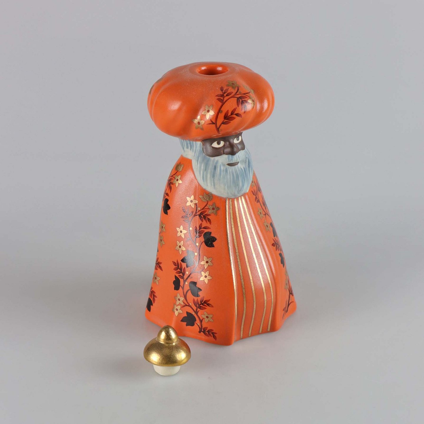 Figur i porcelæn. Balthasar fra De tre vise mænd. Når guldknoppen tages af, er der hul til et kerte lys
