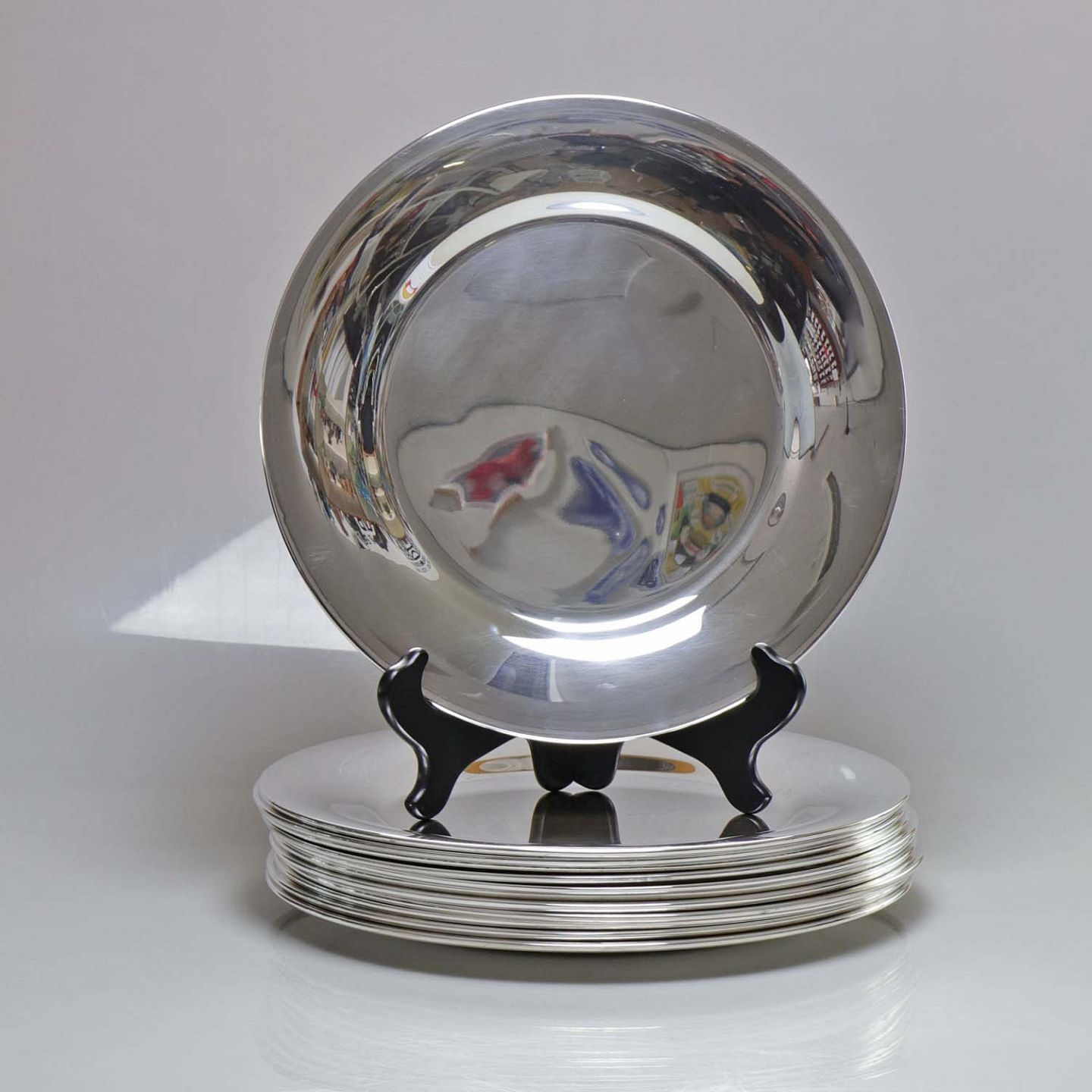 12 styk Dækketallerkner i varierende kvalitet, sølvbelagt stål