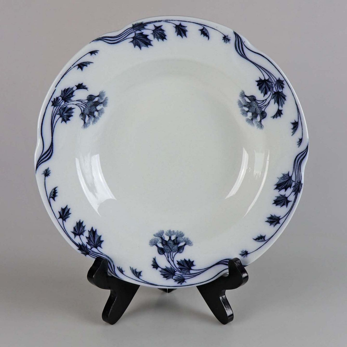 Stellet Tidsel er tysk og er lavet i fajance. Stellet er hvidt og dekoreret med en ranke af blade og en tidsel i grå blå farver