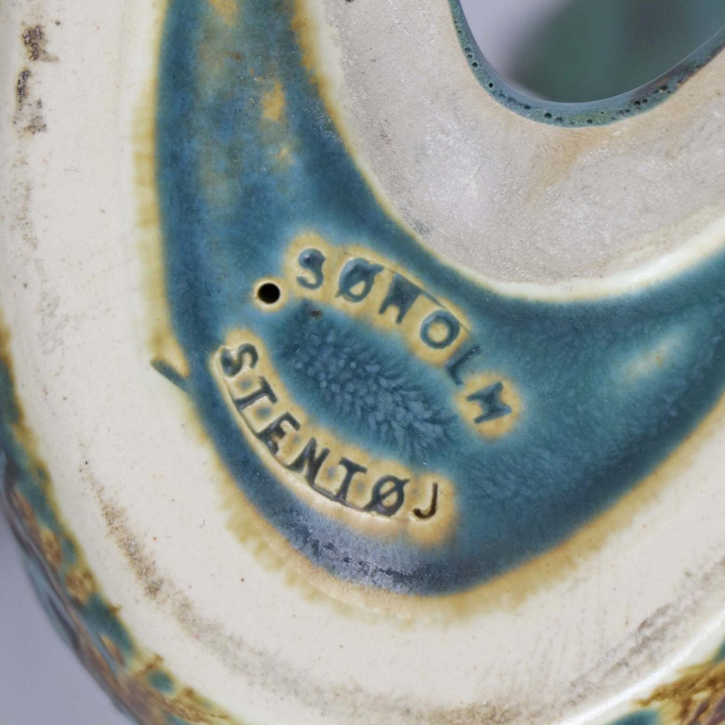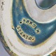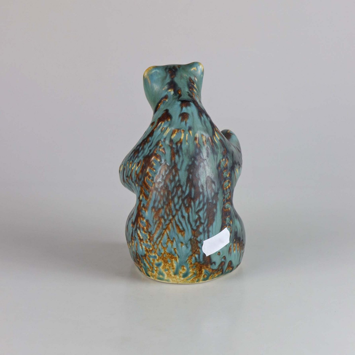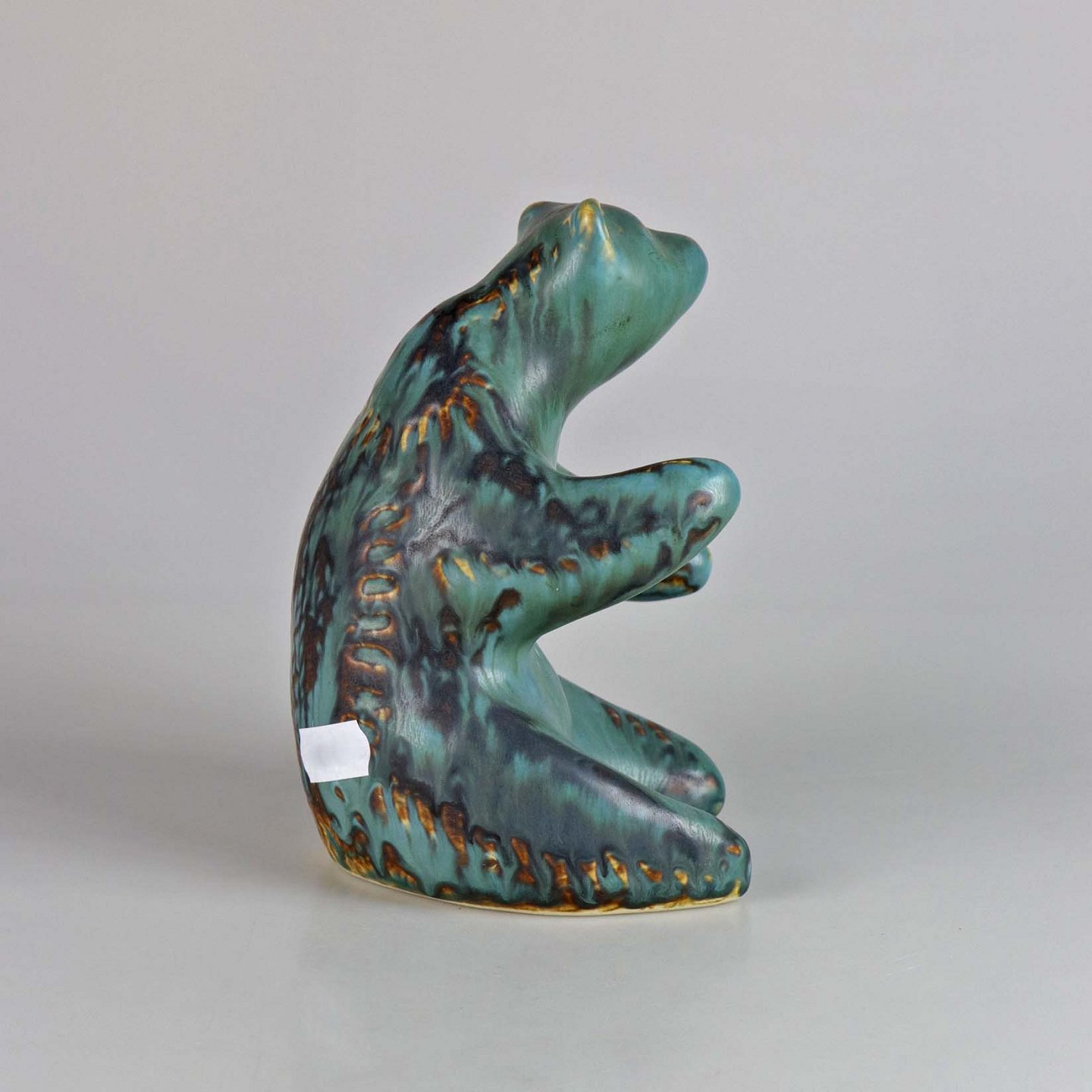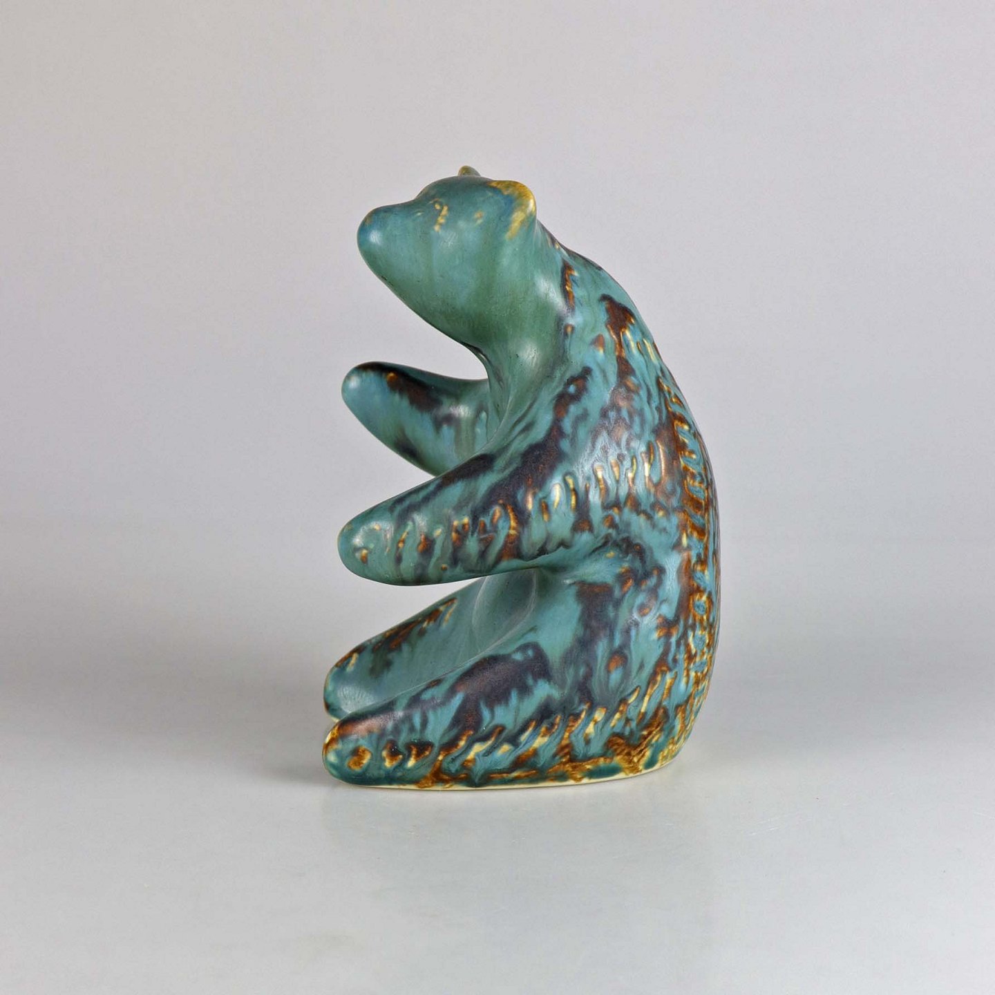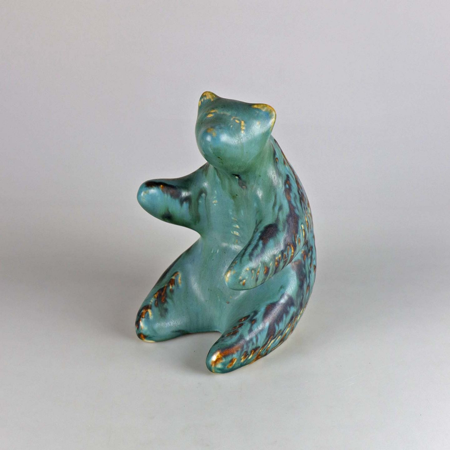 Figur af isbjørn i stentøj med blågrøn, brune og gyldne farver