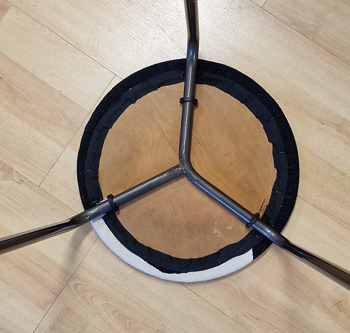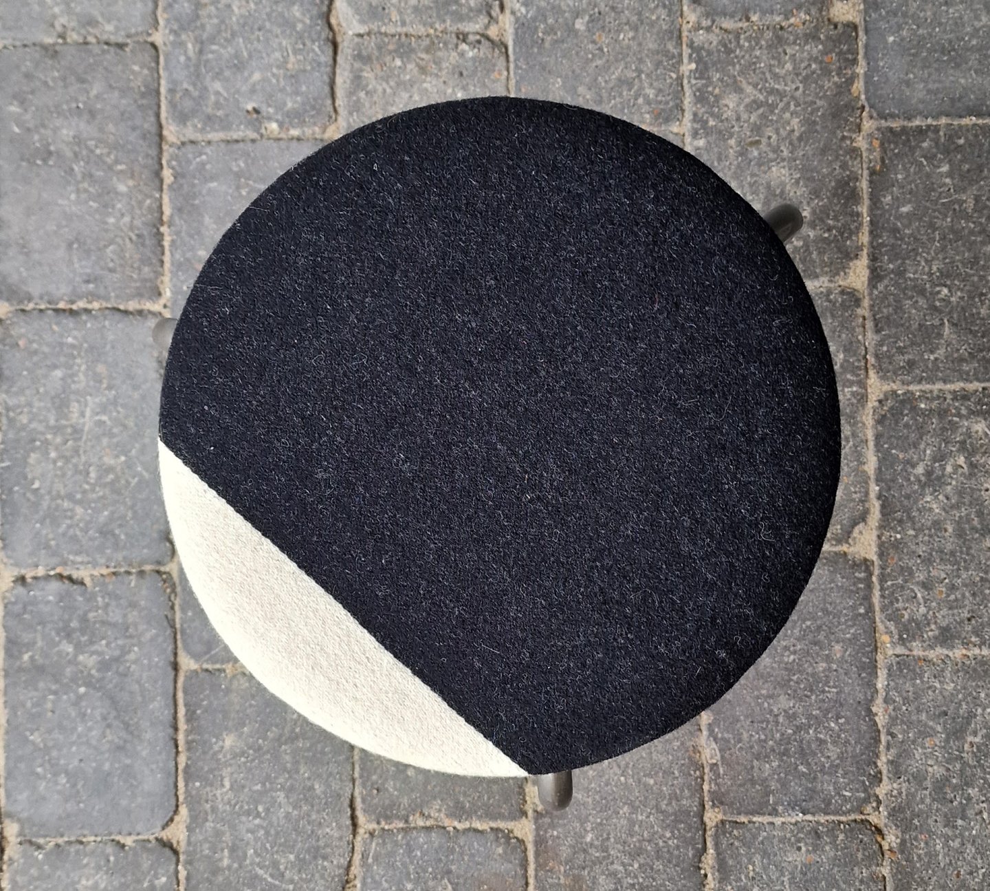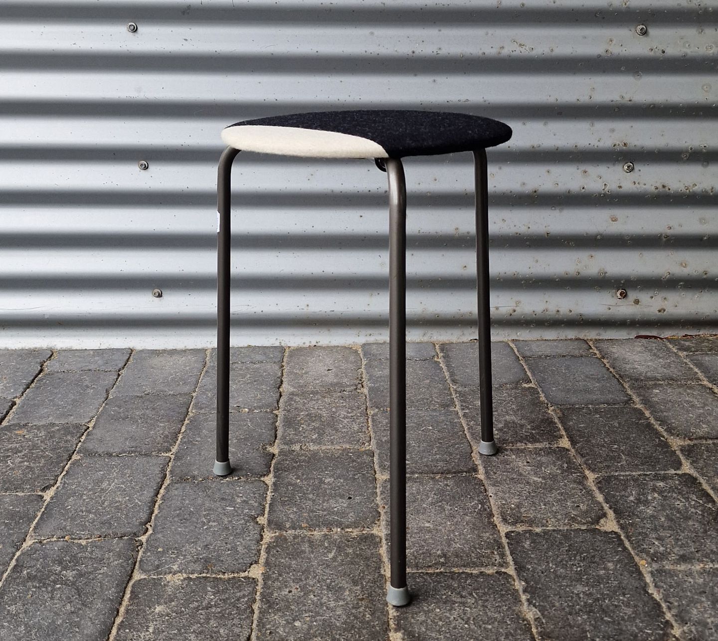 Skammel med rundt sæde og ben af metal. Nypolstret sort betræk med hvid stribe